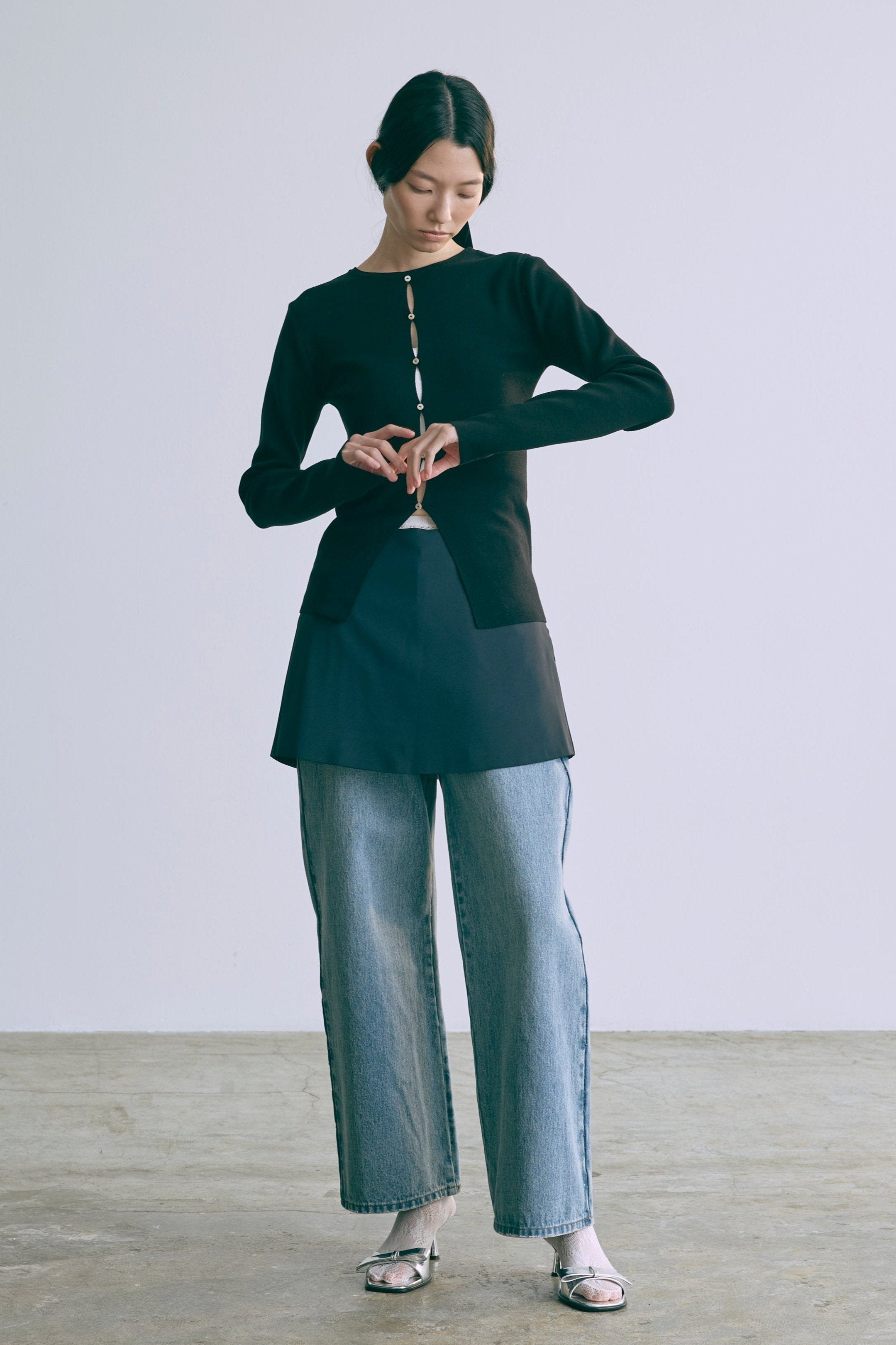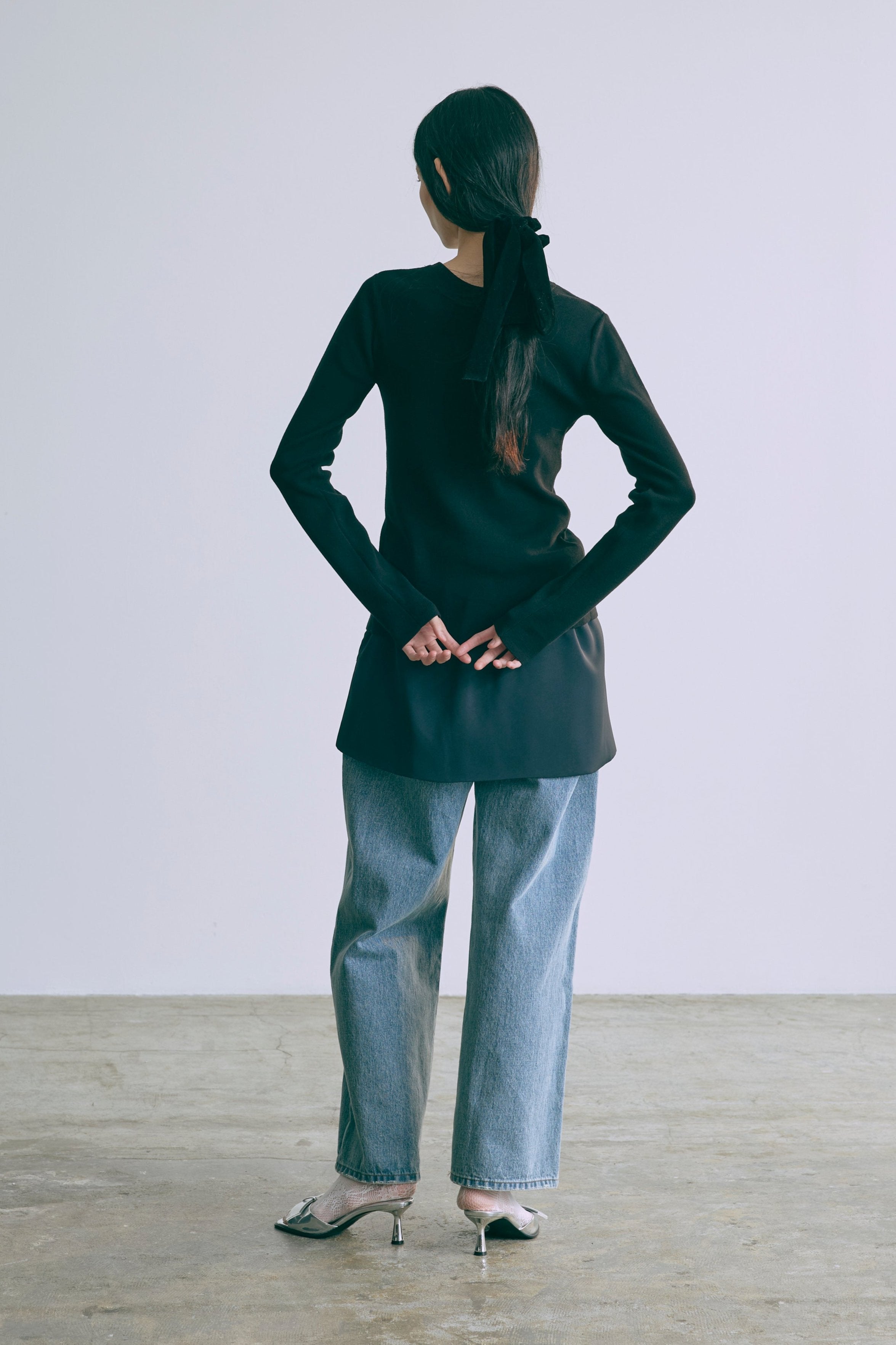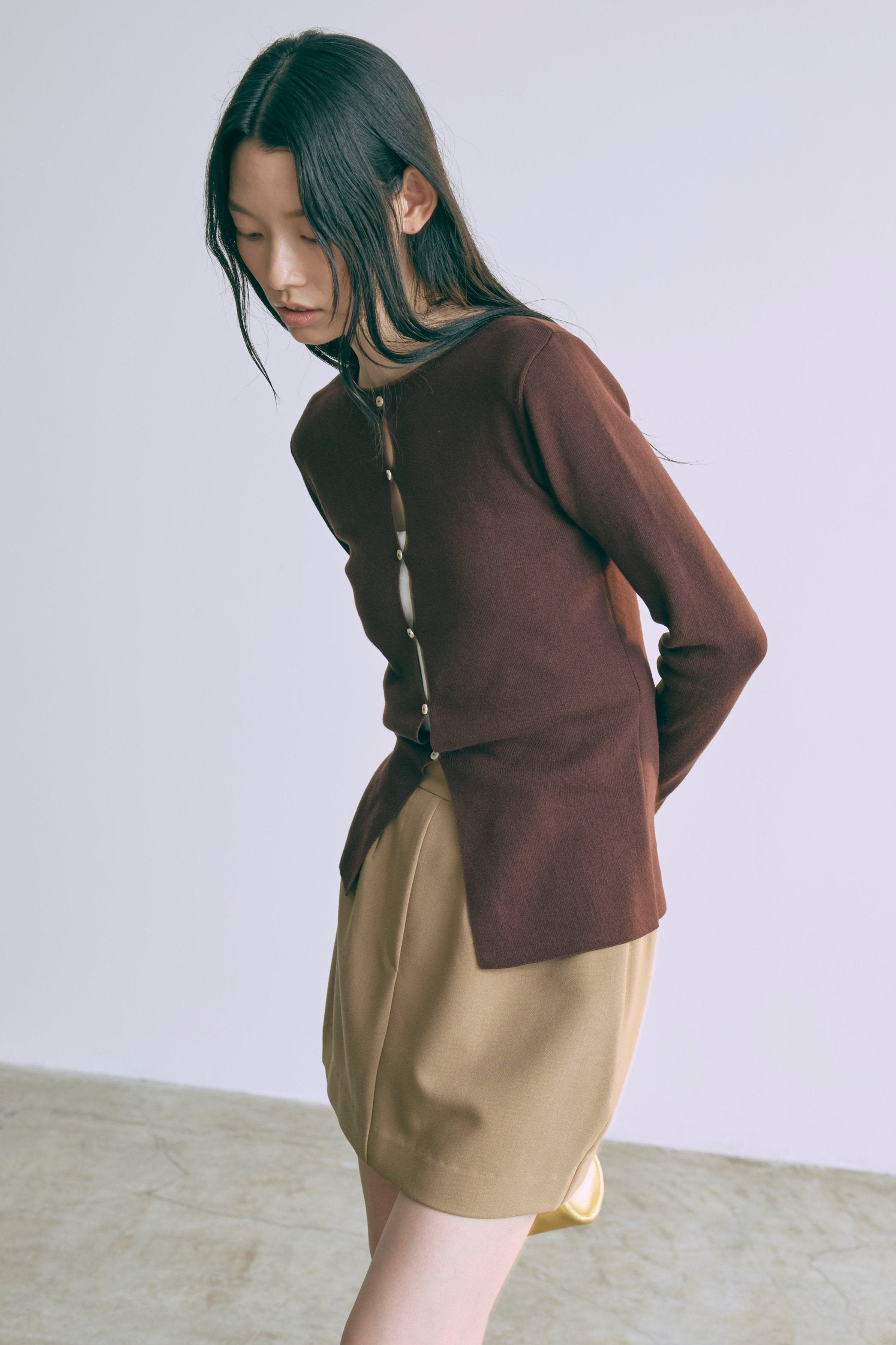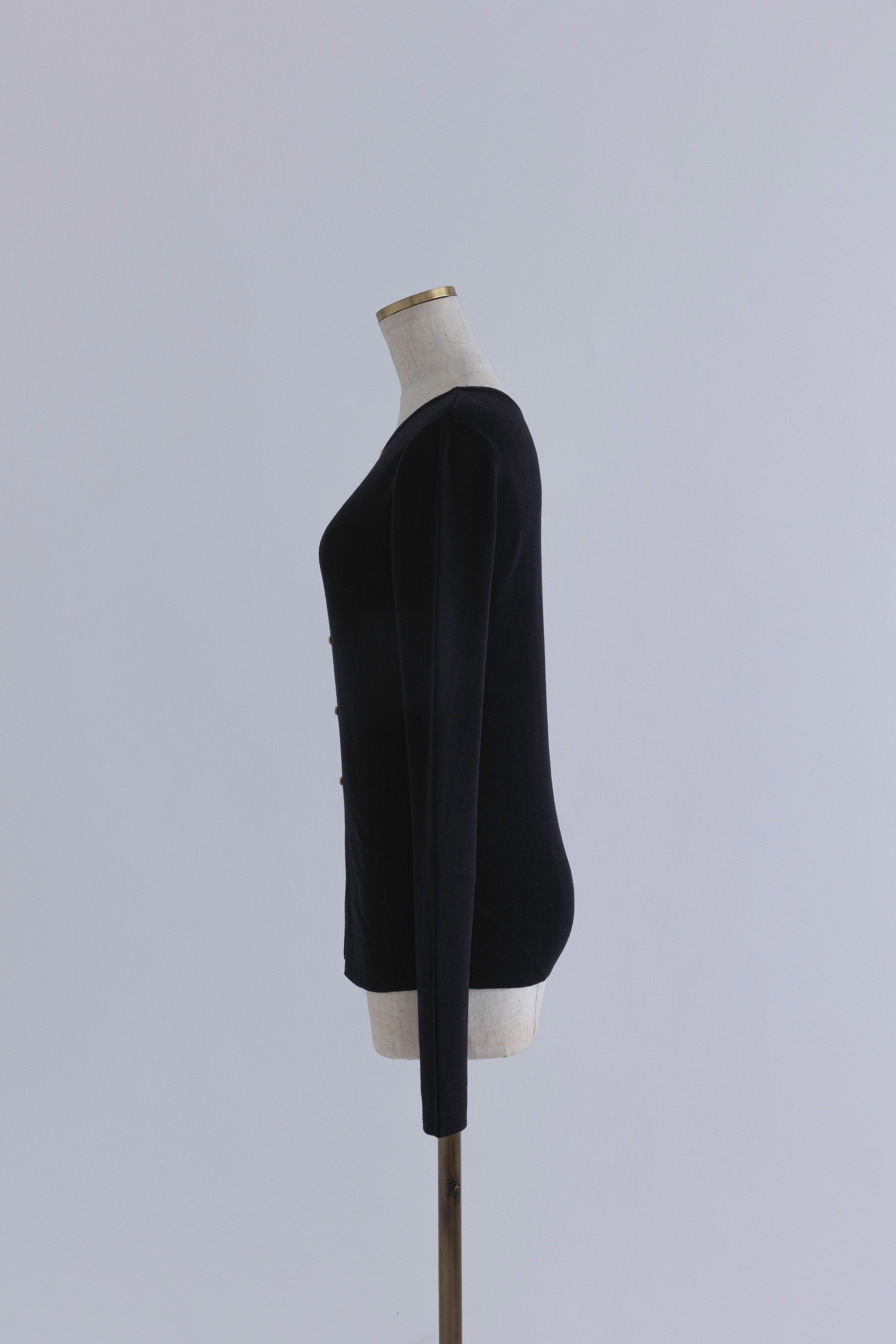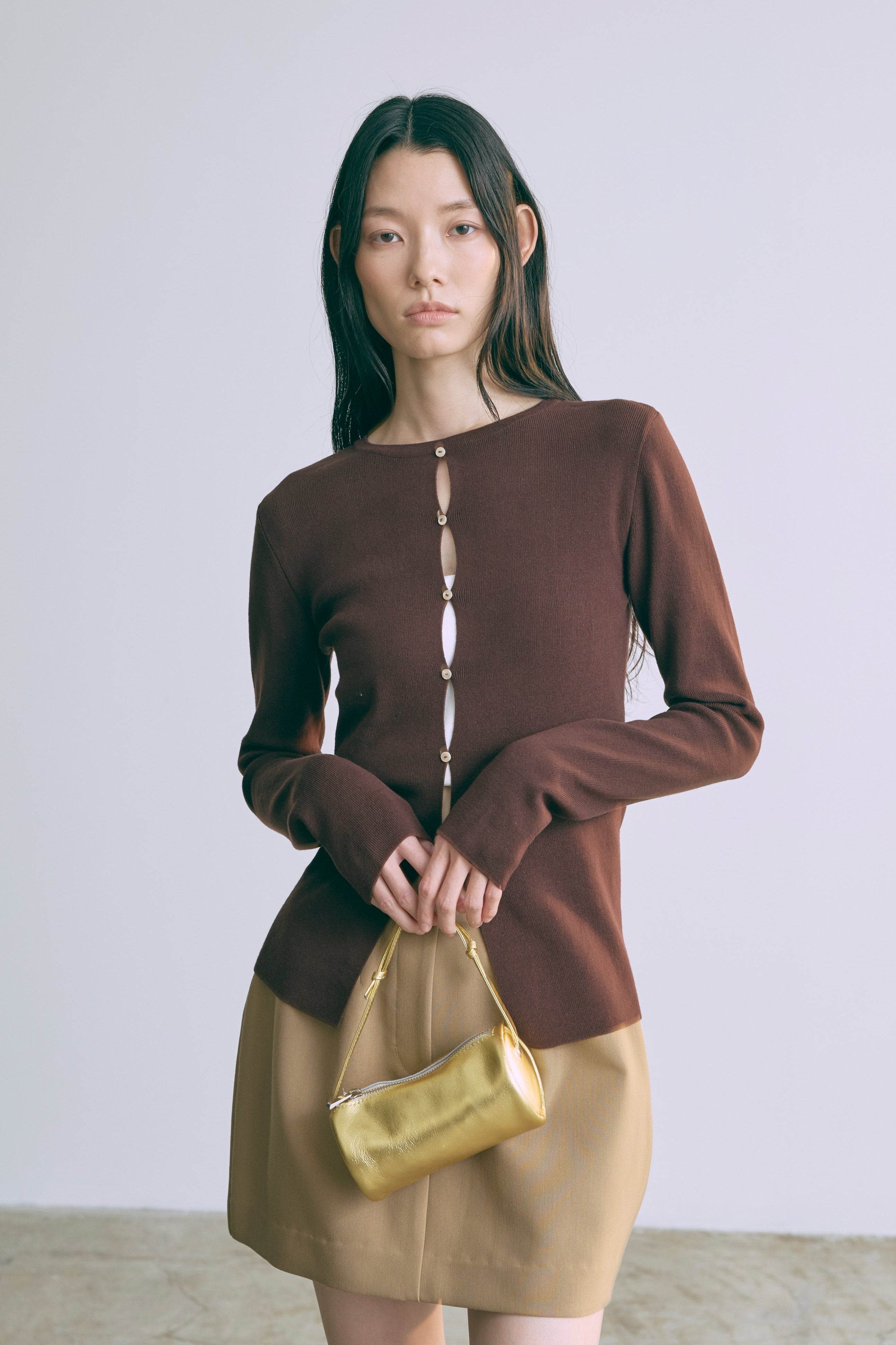 2WAYで楽しめる縦長ホールデザインのニットプルオーバー 【Material】 コットン混素材を使用したさらっとした着心地が魅力のニット。季節を問わずロングシーズンで活躍します。 【Design】 フロント中央に縦長のホールが入ったデザインがポイント。ホール部分を背中側にしてシンプルに着こなすこともできる2WAY仕様です。飾りボタンがアクセントになっており、今年らしい抜け感を演出。一枚で華やかさが際立つアイテムです。 【Styling point】 すっきりとしたシルエットで、ワイドパンツやボリュームのあるボトムスとも相性抜群。ジャケットのインナーとしても合わせやすく、さまざまなコーディネートに取り入れやすいデザインです。