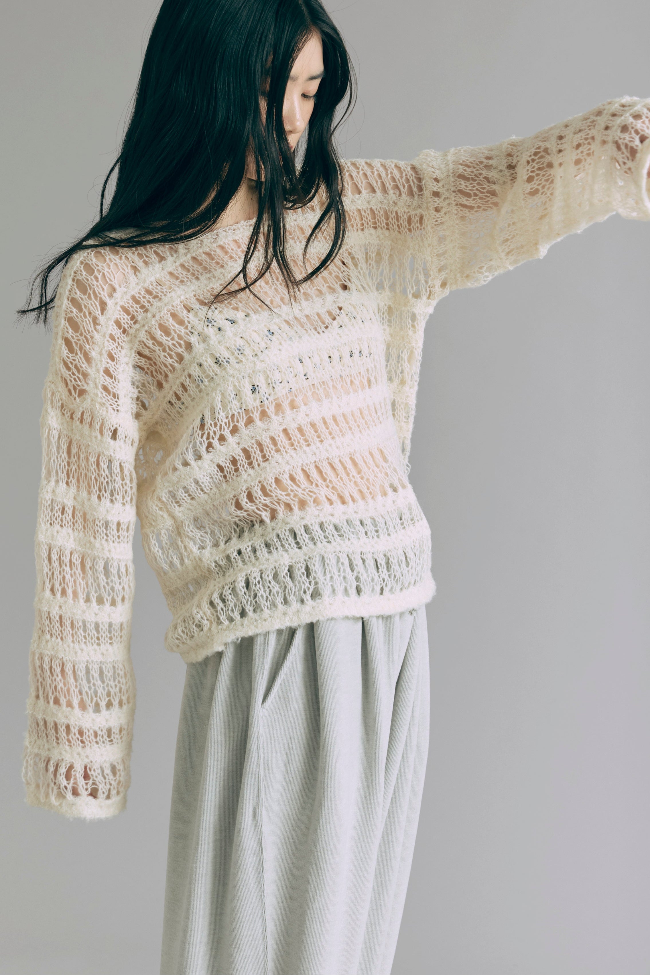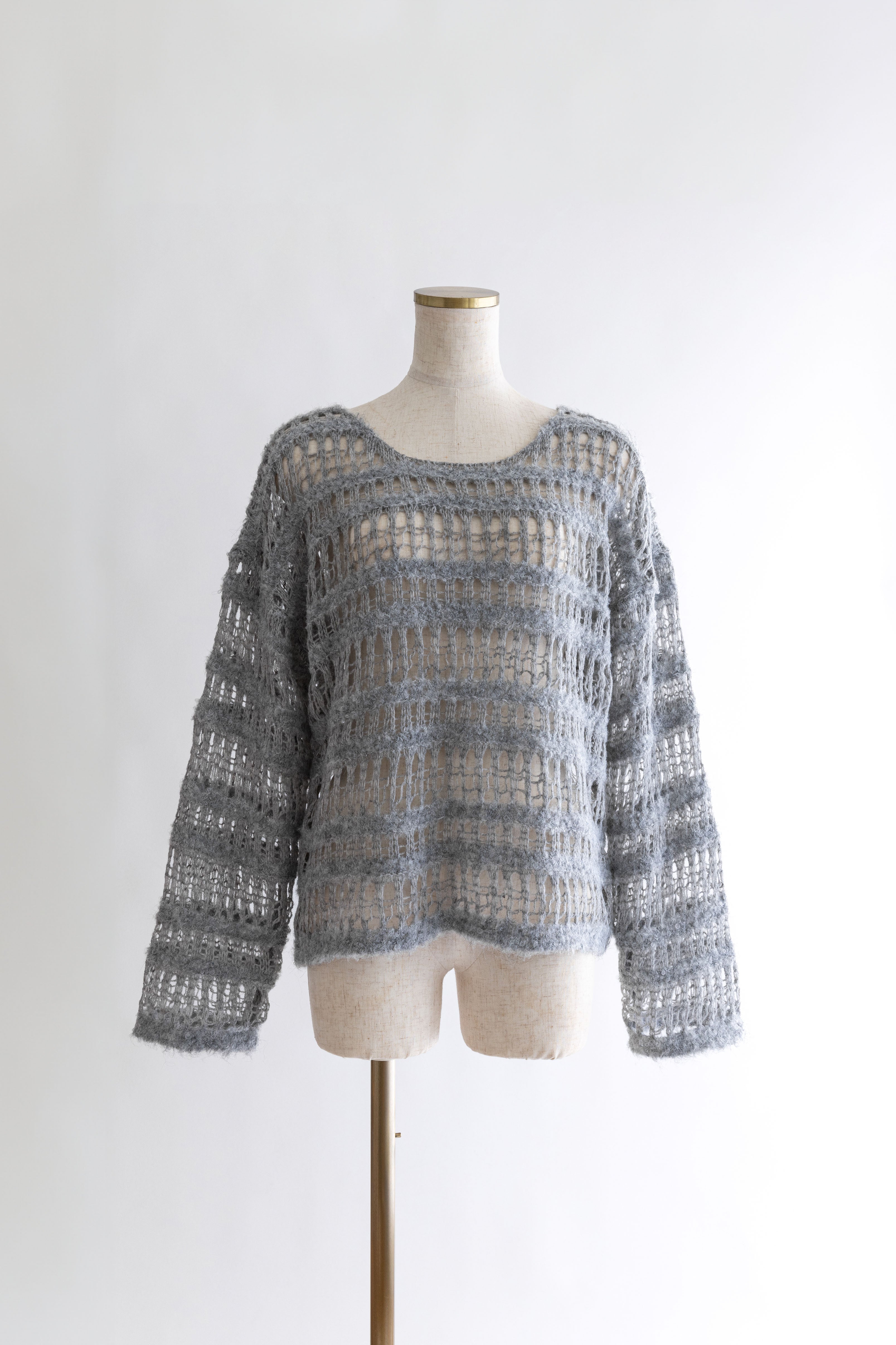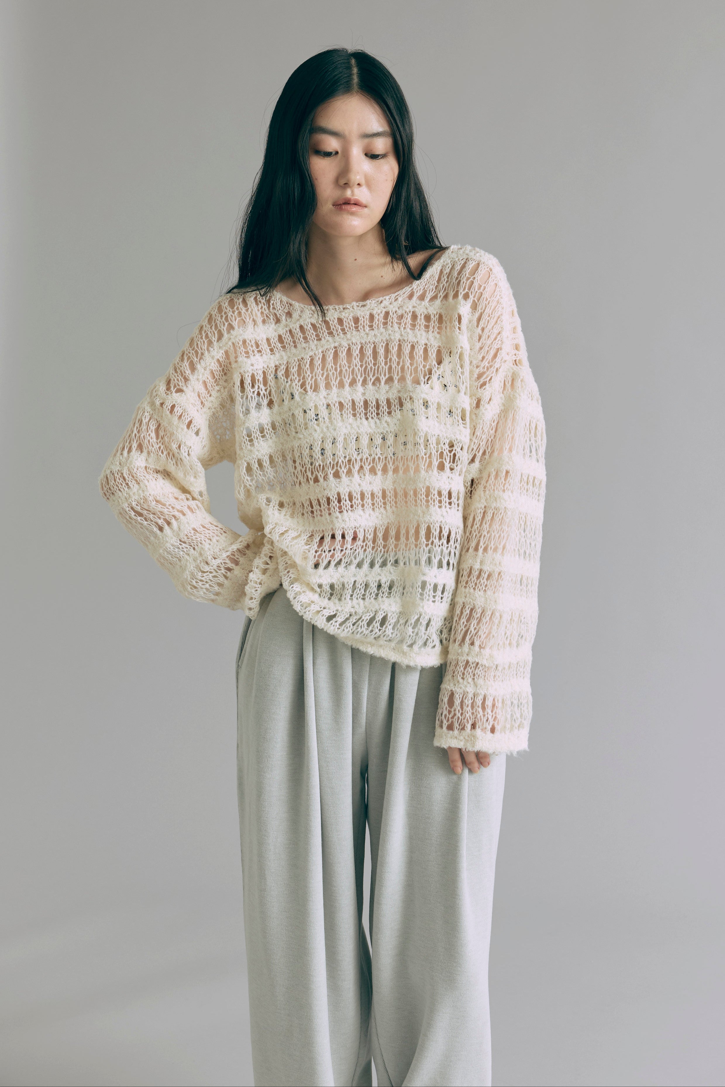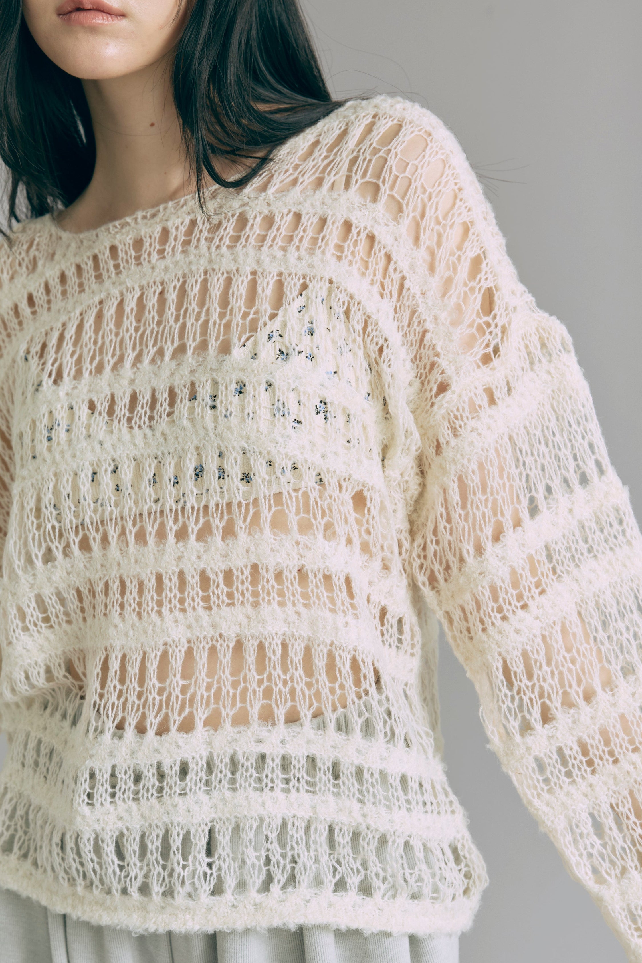 シアーニットでこなれた印象に 【Material】 薄手の素材感で重ね着もしやすく、季節の変わり目や日差しのある日にも快適に着られます。 【Design】 透け感がアクセントの、ボーダー柄を組み合わせたルーズニット。肩や身頃にゆとりを持たせたデザインで、リラックス感がありながらも大人っぽい雰囲気に。 【Styling point】 シンプルなスラックスやタイトスカートと組み合わせることで大人らしい着こなしに。 薄手でレイヤードがしやすいので、インナーにタートルを重ねれば秋冬も楽しめ、春夏にはキャミやブラトップを仕込んでヘルシーな抜け感をプラス◎