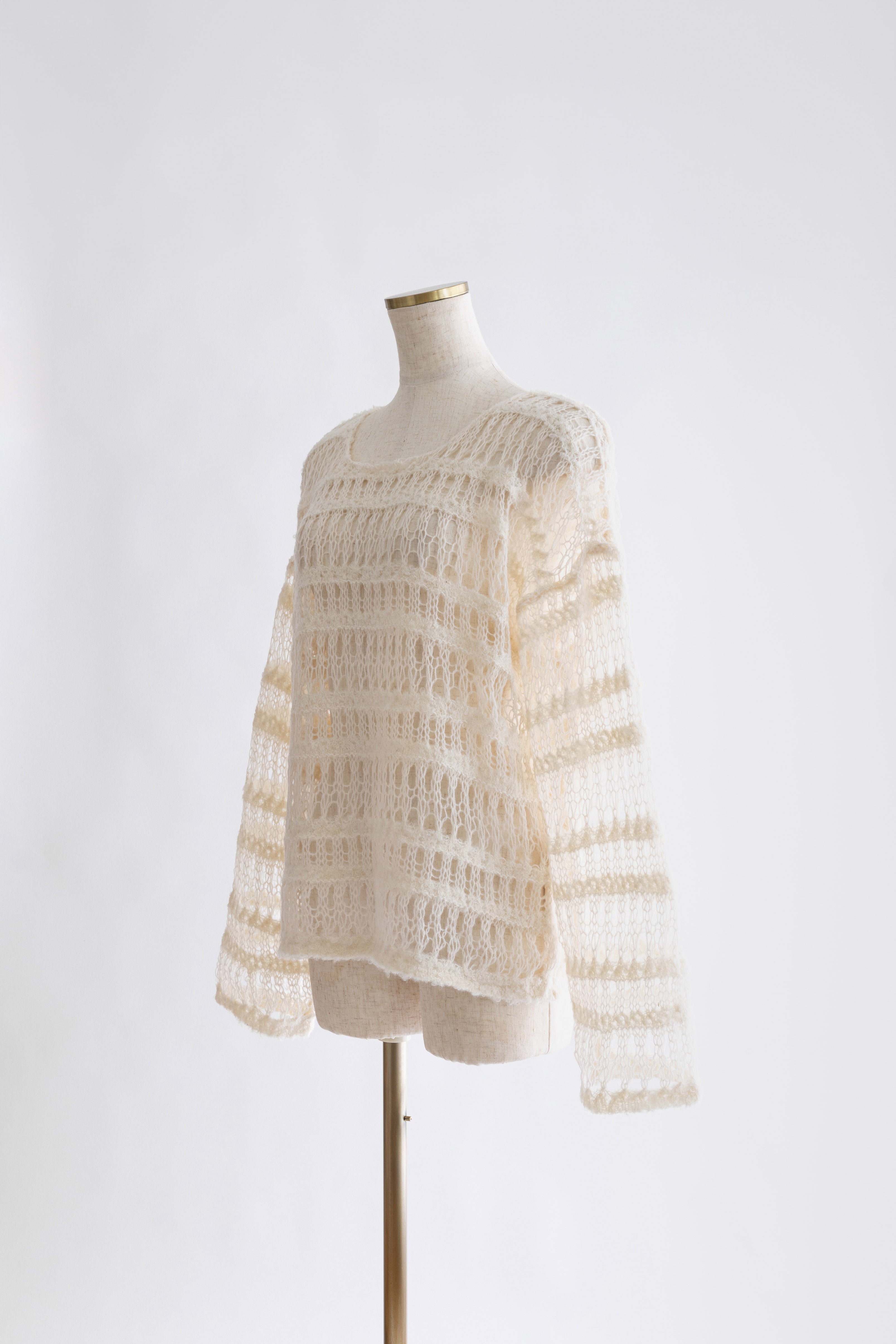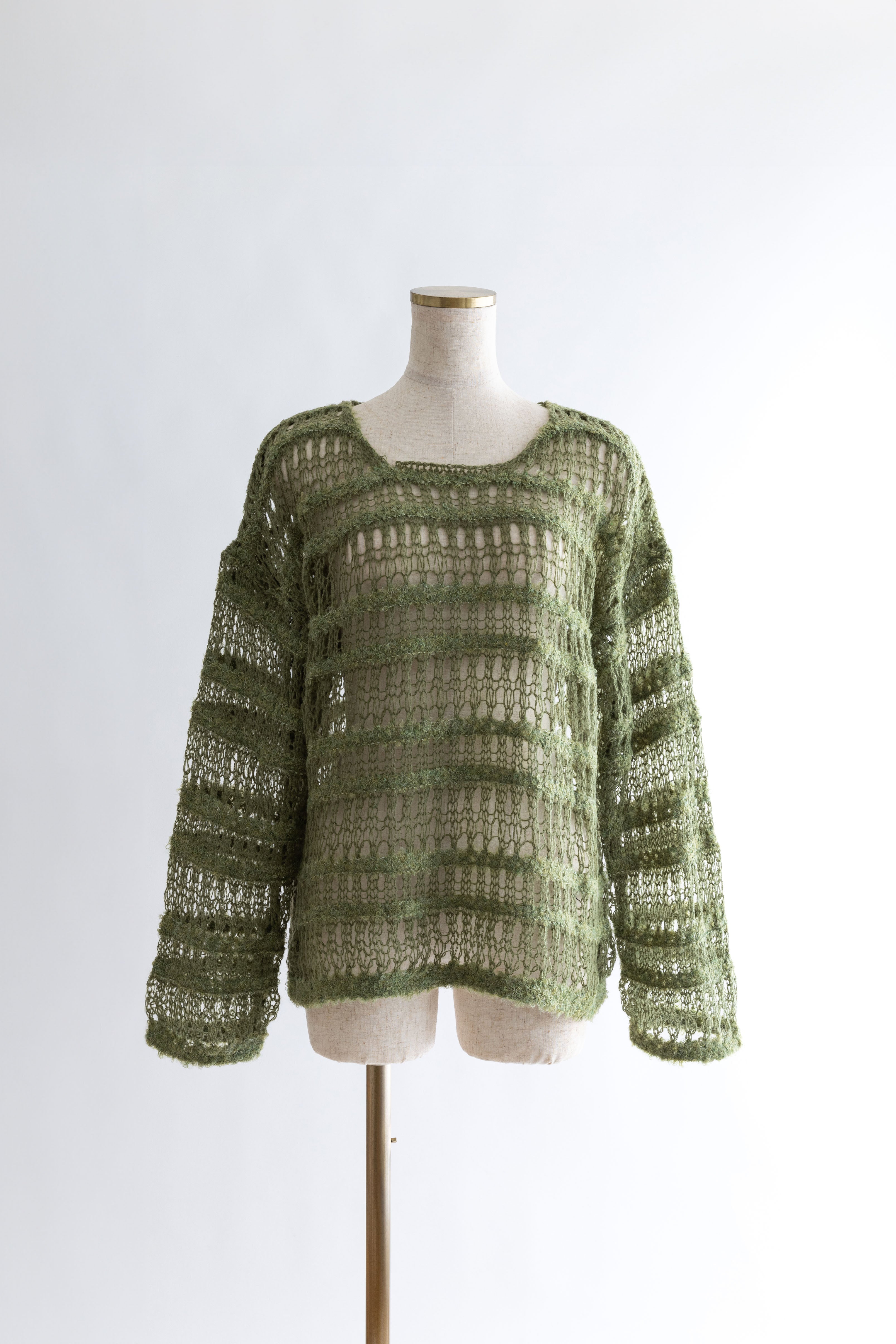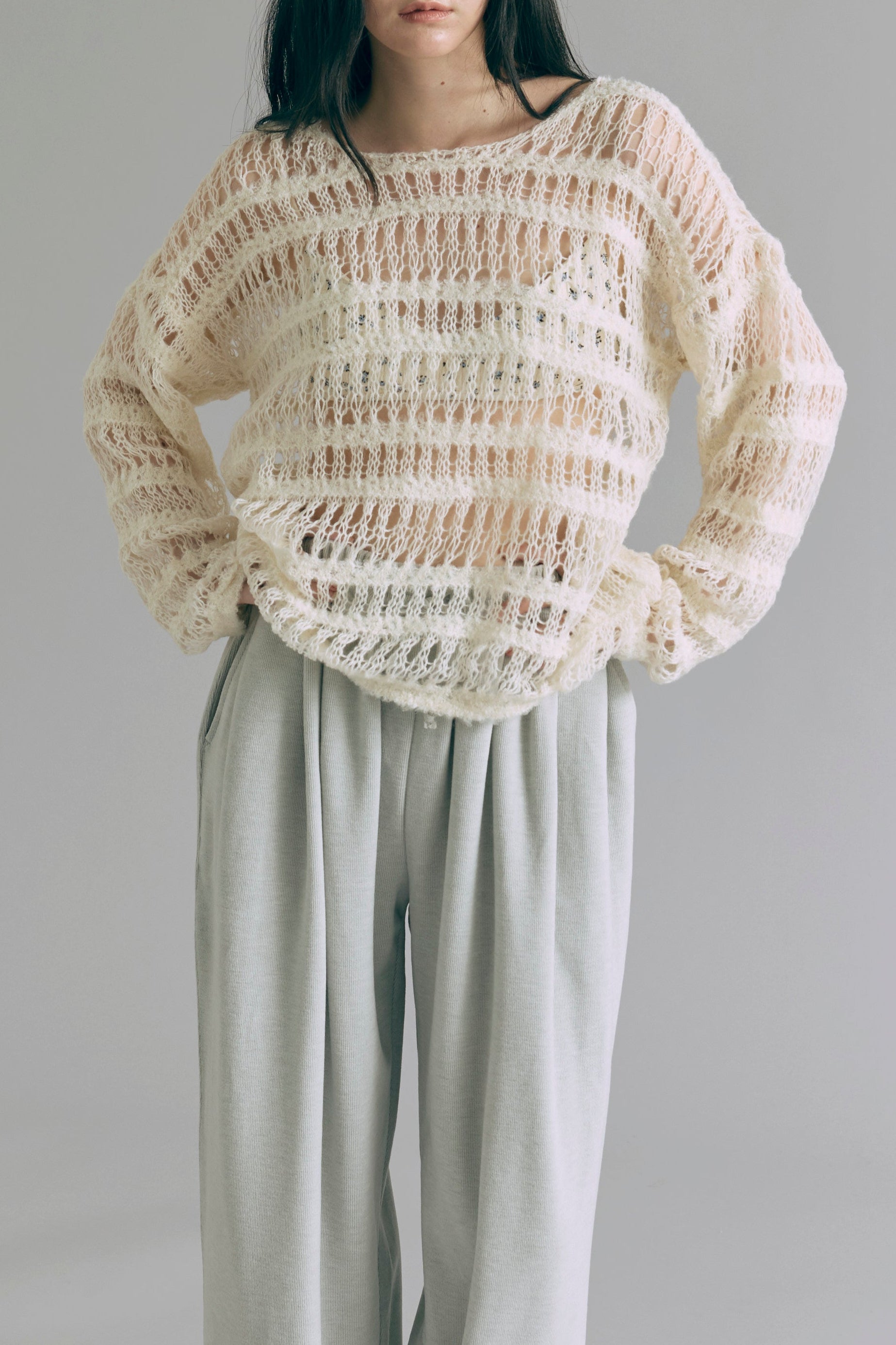 シアーニットでこなれた印象に 【Material】 薄手の素材感で重ね着もしやすく、季節の変わり目や日差しのある日にも快適に着られます。 【Design】 透け感がアクセントの、ボーダー柄を組み合わせたルーズニット。肩や身頃にゆとりを持たせたデザインで、リラックス感がありながらも大人っぽい雰囲気に。 【Styling point】 シンプルなスラックスやタイトスカートと組み合わせることで大人らしい着こなしに。 薄手でレイヤードがしやすいので、インナーにタートルを重ねれば秋冬も楽しめ、春夏にはキャミやブラトップを仕込んでヘルシーな抜け感をプラス◎