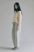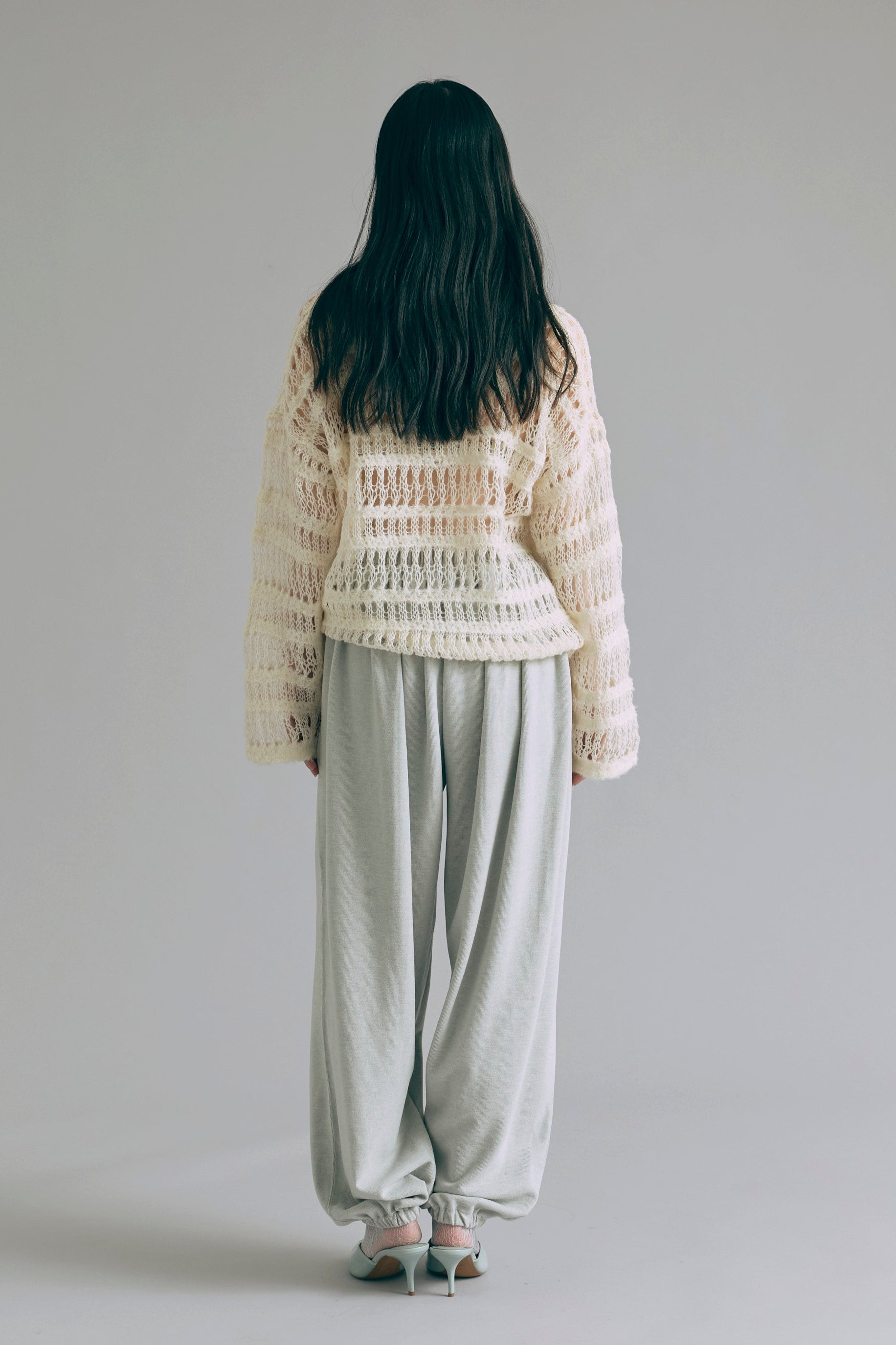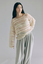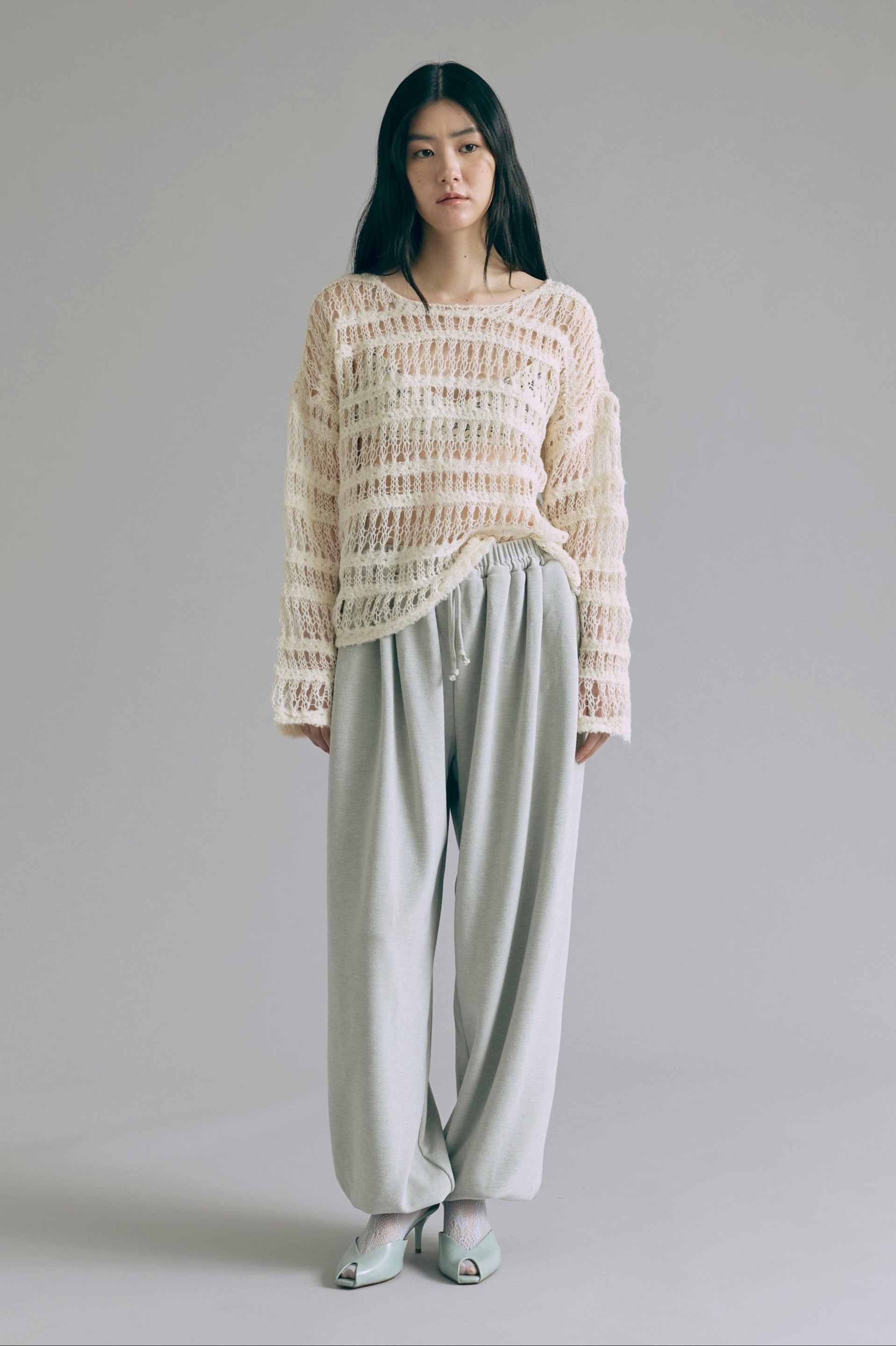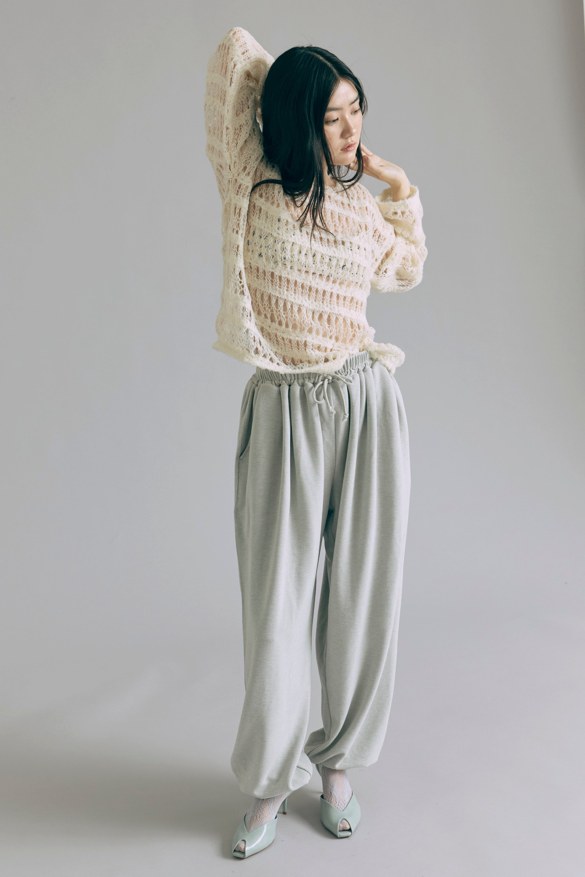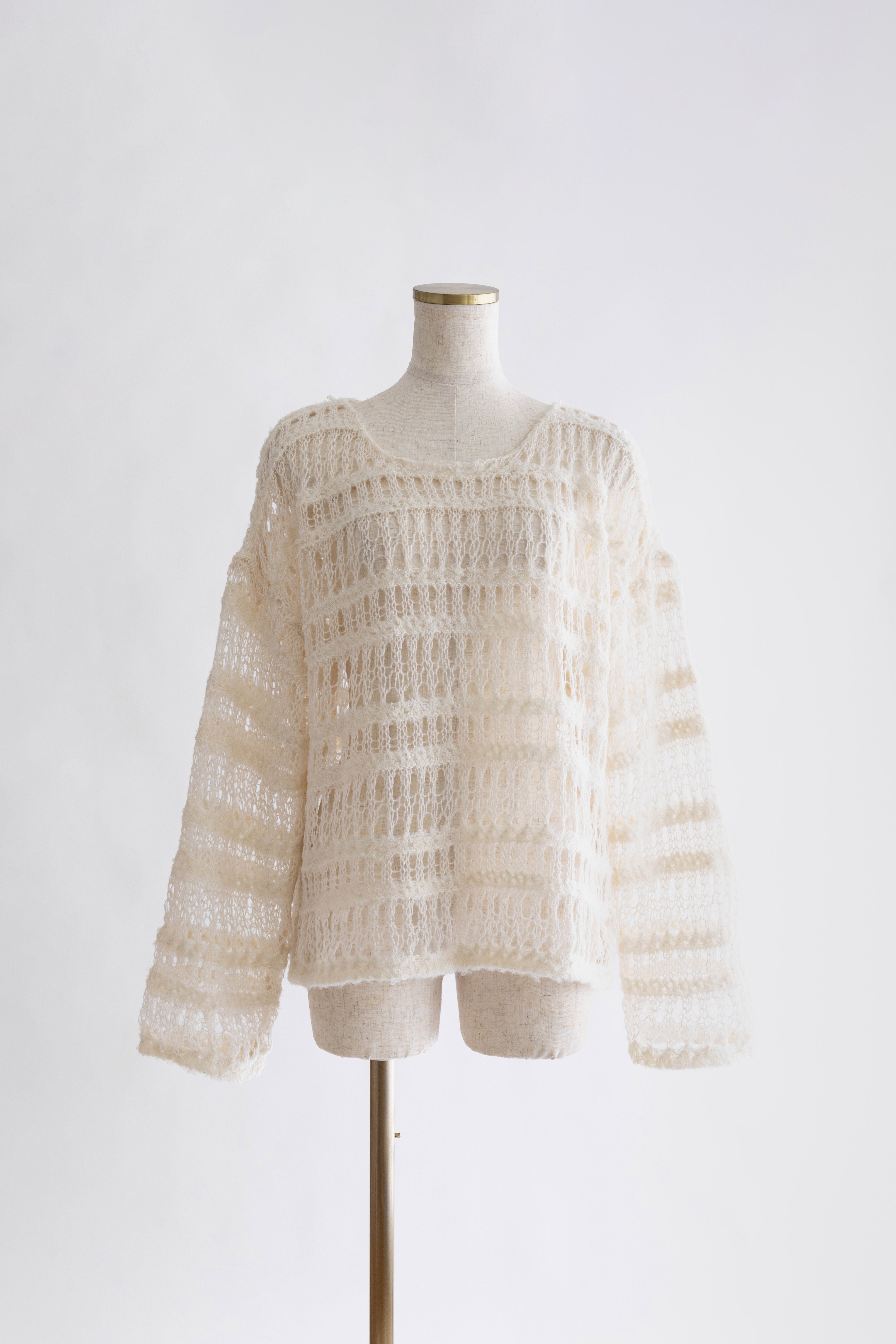 シアーニットでこなれた印象に 【Material】 薄手の素材感で重ね着もしやすく、季節の変わり目や日差しのある日にも快適に着られます。 【Design】 透け感がアクセントの、ボーダー柄を組み合わせたルーズニット。肩や身頃にゆとりを持たせたデザインで、リラックス感がありながらも大人っぽい雰囲気に。 【Styling point】 シンプルなスラックスやタイトスカートと組み合わせることで大人らしい着こなしに。 薄手でレイヤードがしやすいので、インナーにタートルを重ねれば秋冬も楽しめ、春夏にはキャミやブラトップを仕込んでヘルシーな抜け感をプラス◎
