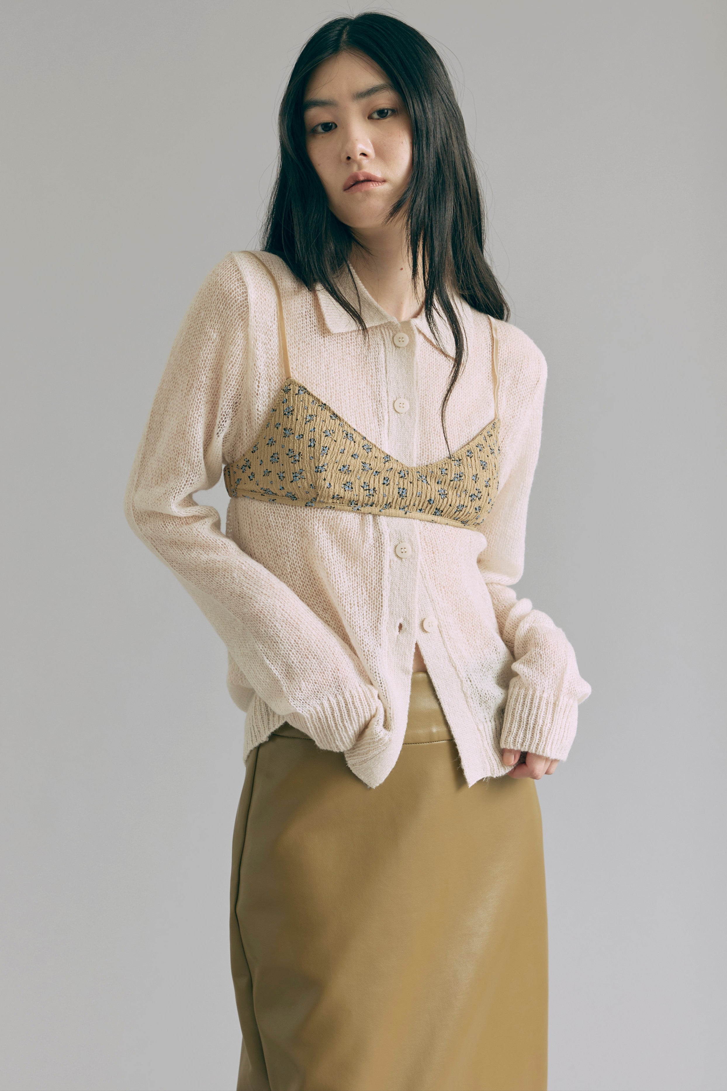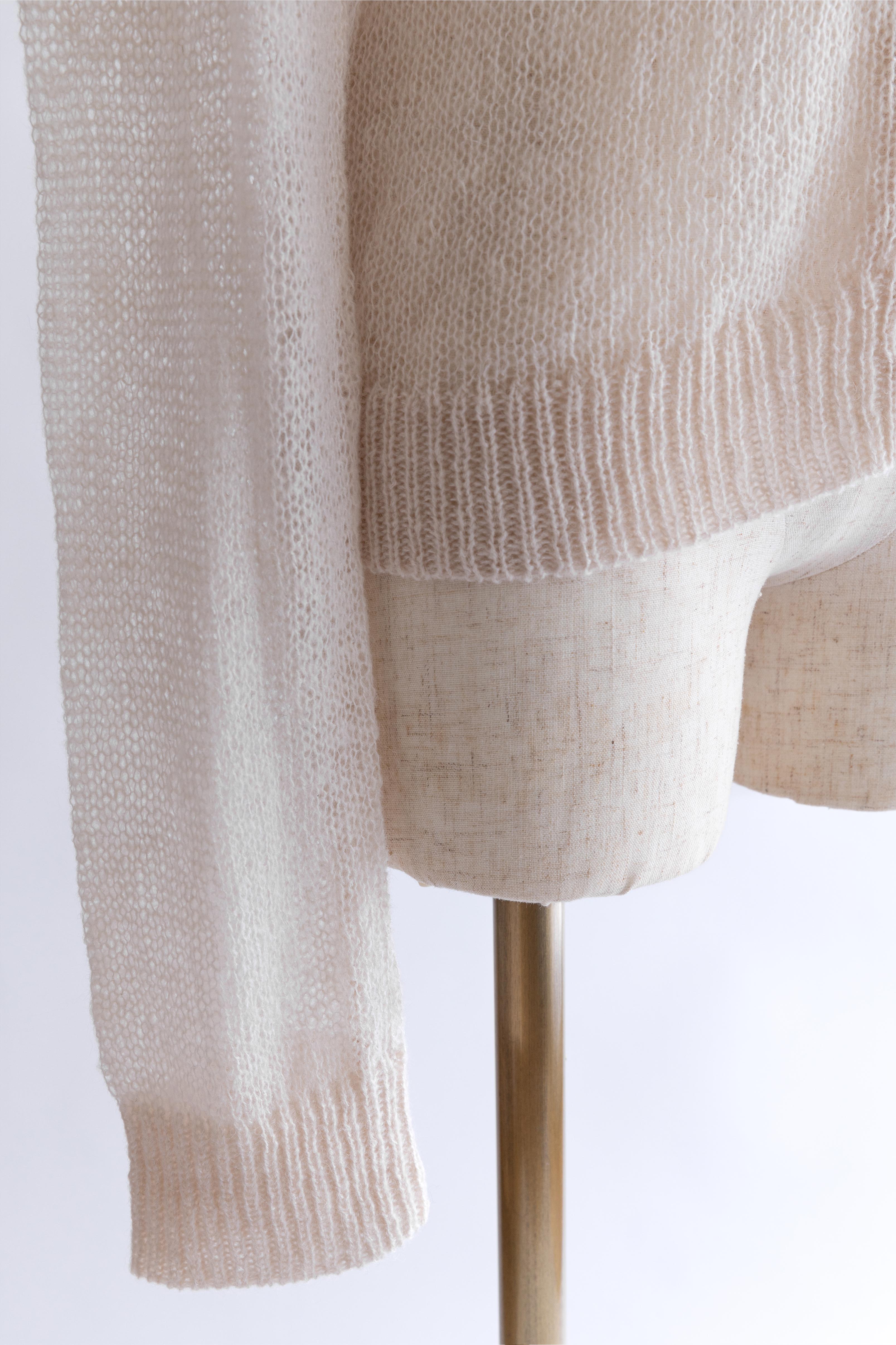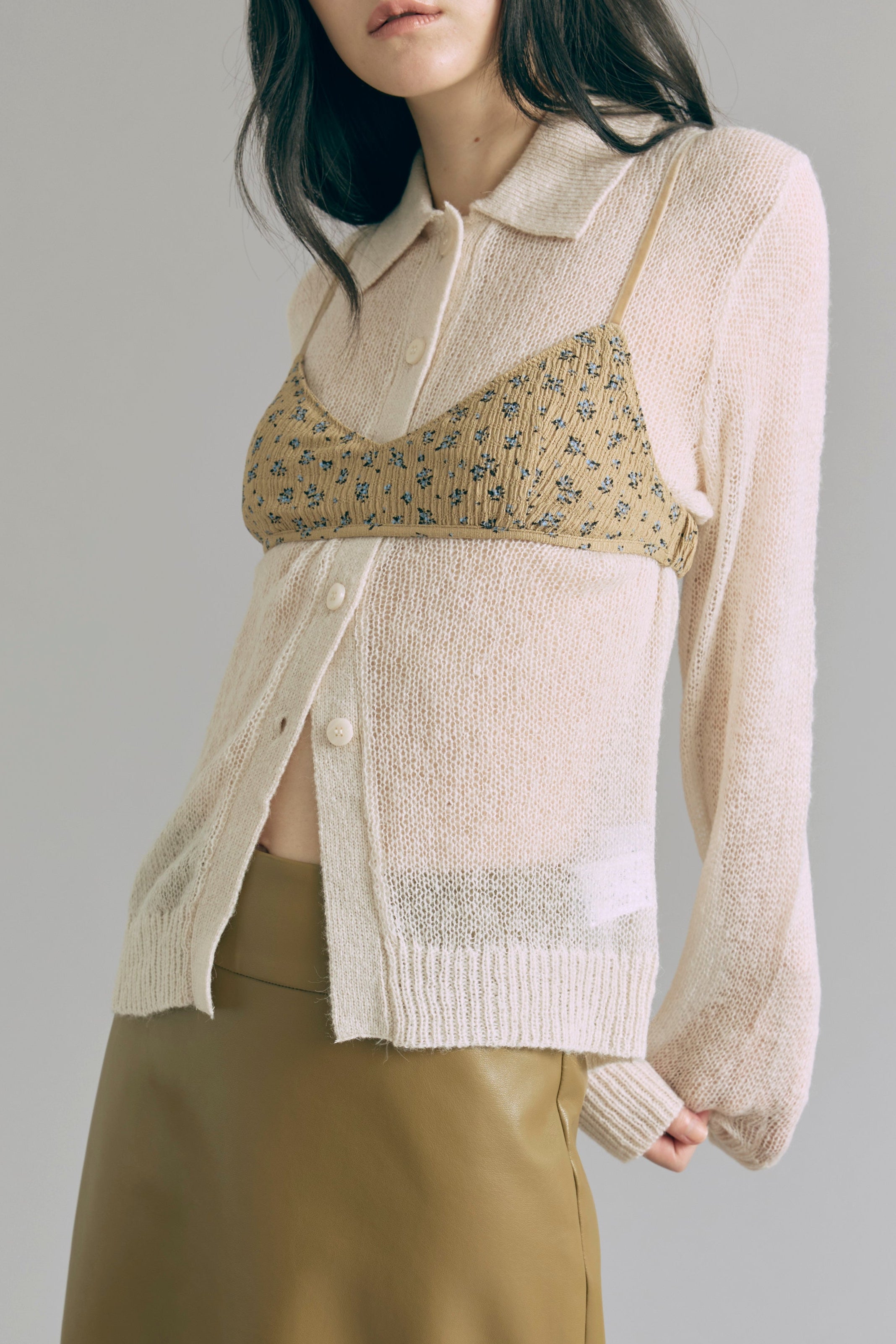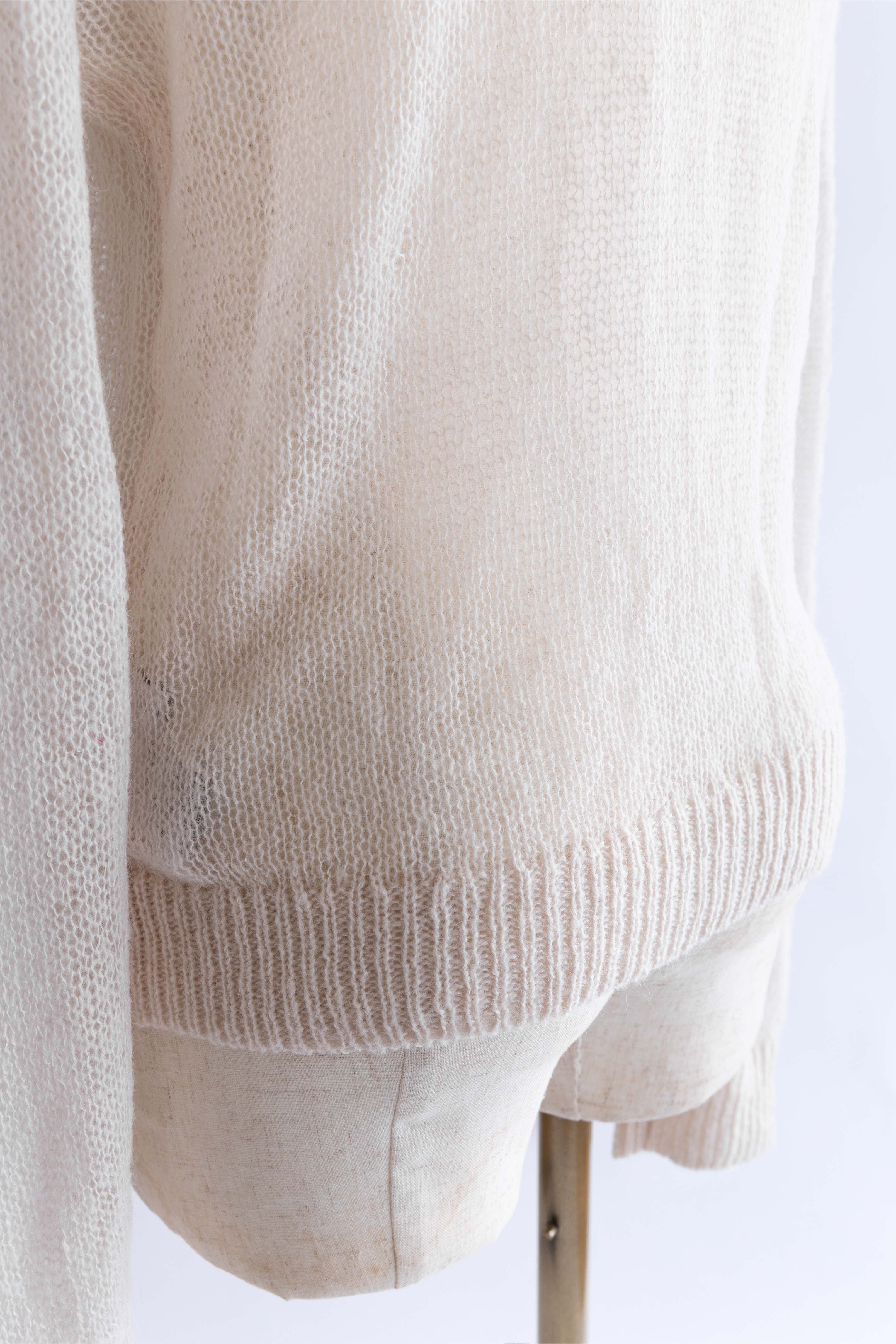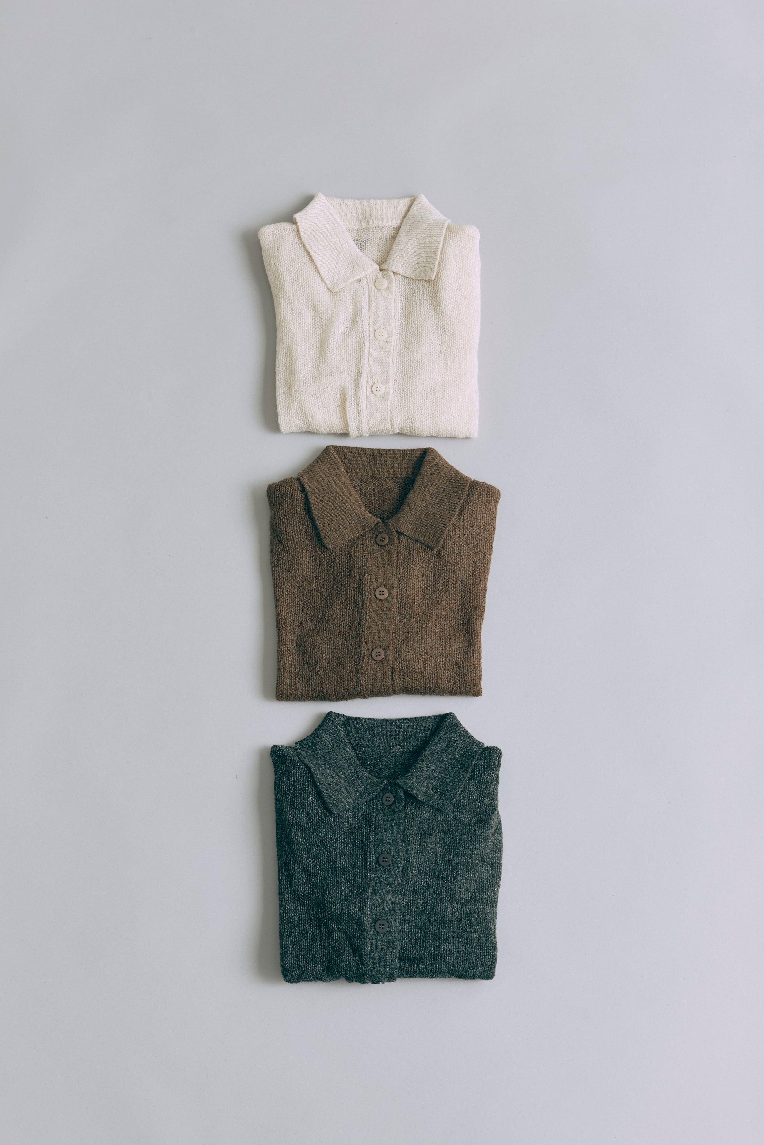 透け感で魅せるレイヤードスタイル 【Material】 軽くてふんわりとした素材を使用したニットは、薄手で肌触りが滑らか。透け感があるので、重ね着も楽しめ、朝晩の涼しさにも対応できる万能アイテムです。 【Design】 ポロネックデザインに、モヘアならではのシアーな風合いを組み合わせ、上品さと抜け感を両立。 スタイリング次第でシンプルにもモードにも着こなせるデザイン性がポイントです。 【Styling point】 デニムやワイドパンツと組み合わせると、リラックス感のあるコーディネートに。透け感を活かしたレイヤードスタイルも楽しめ、ジャケットやアウターを羽織れば一気にシックな雰囲気になります。