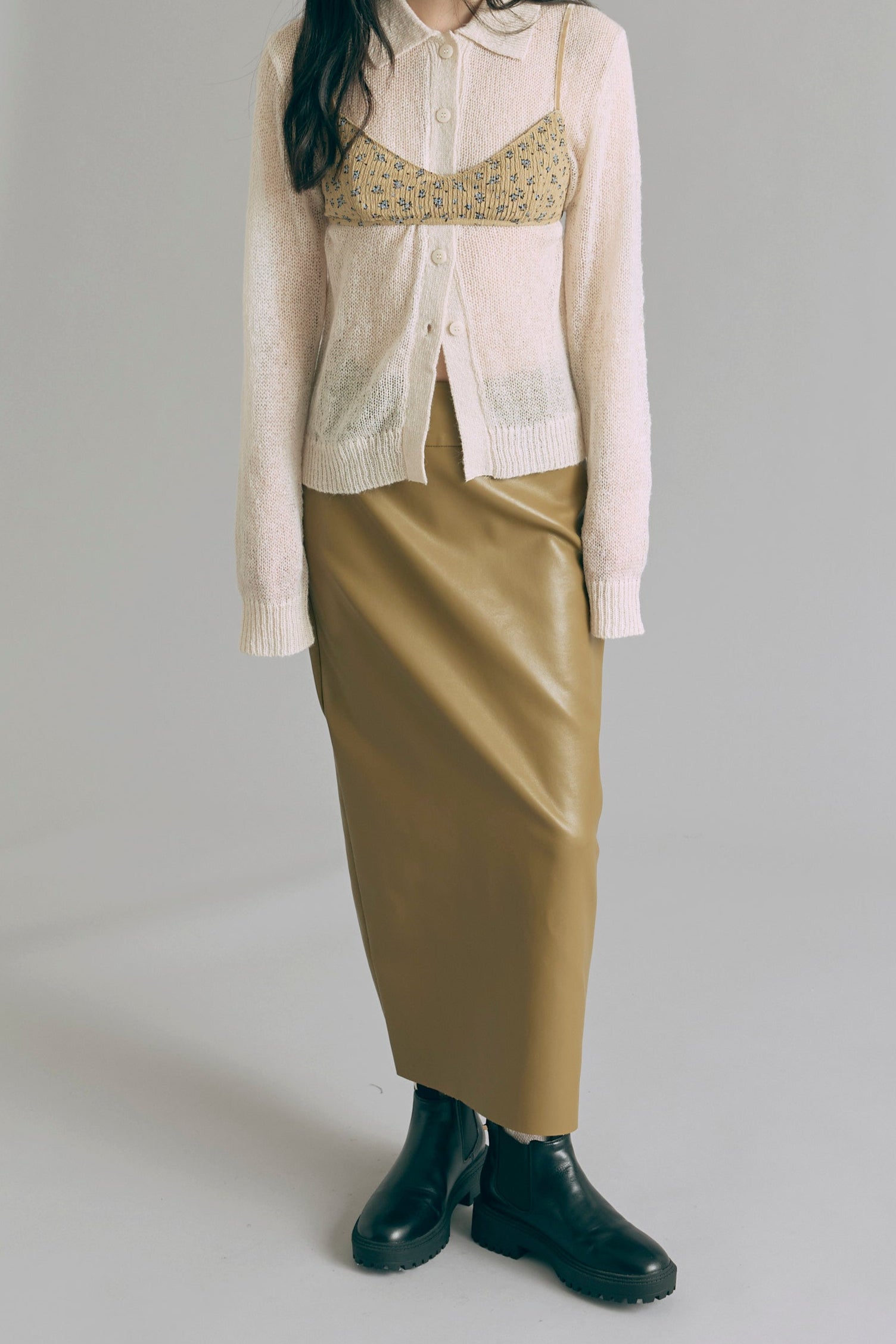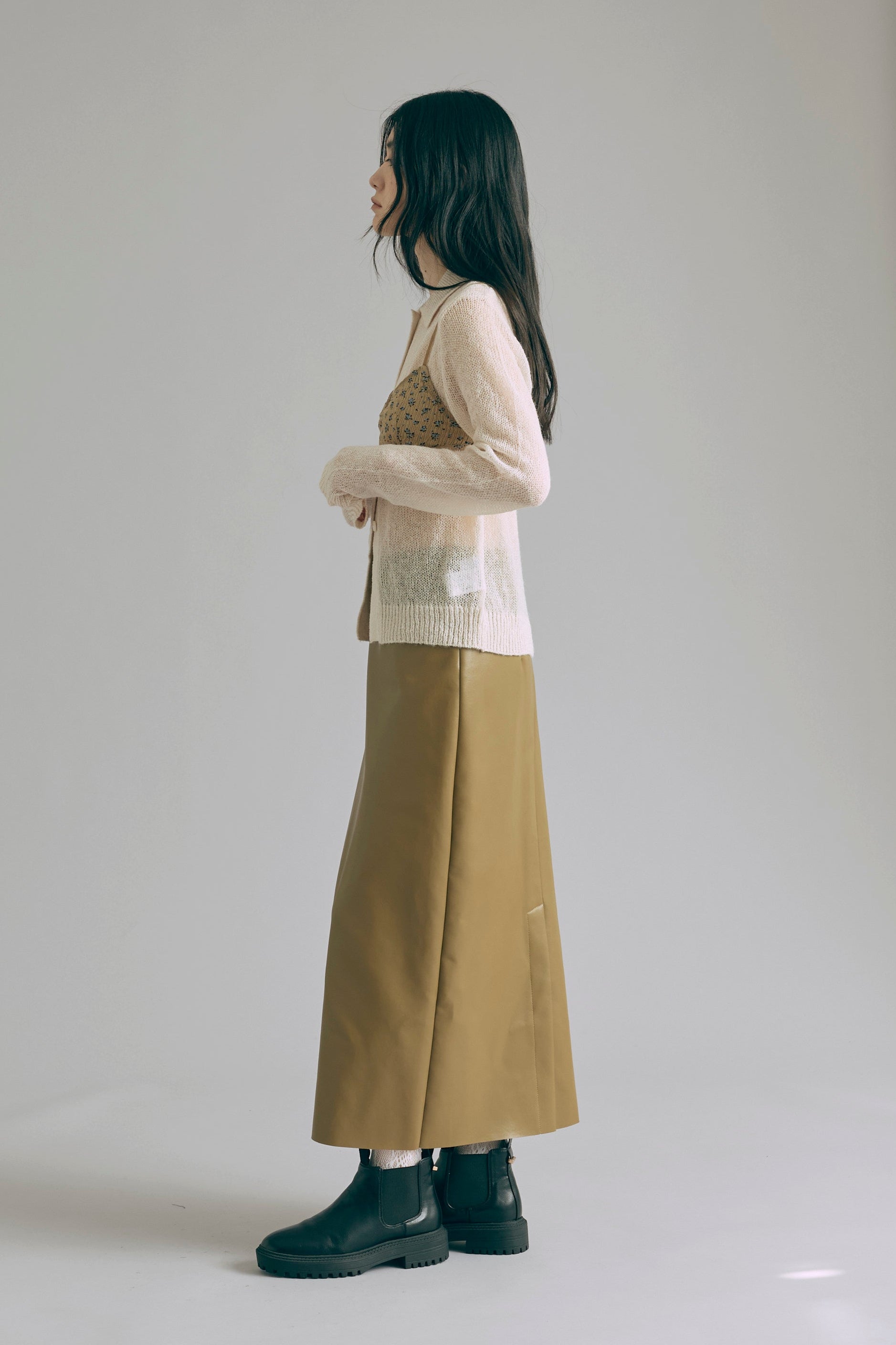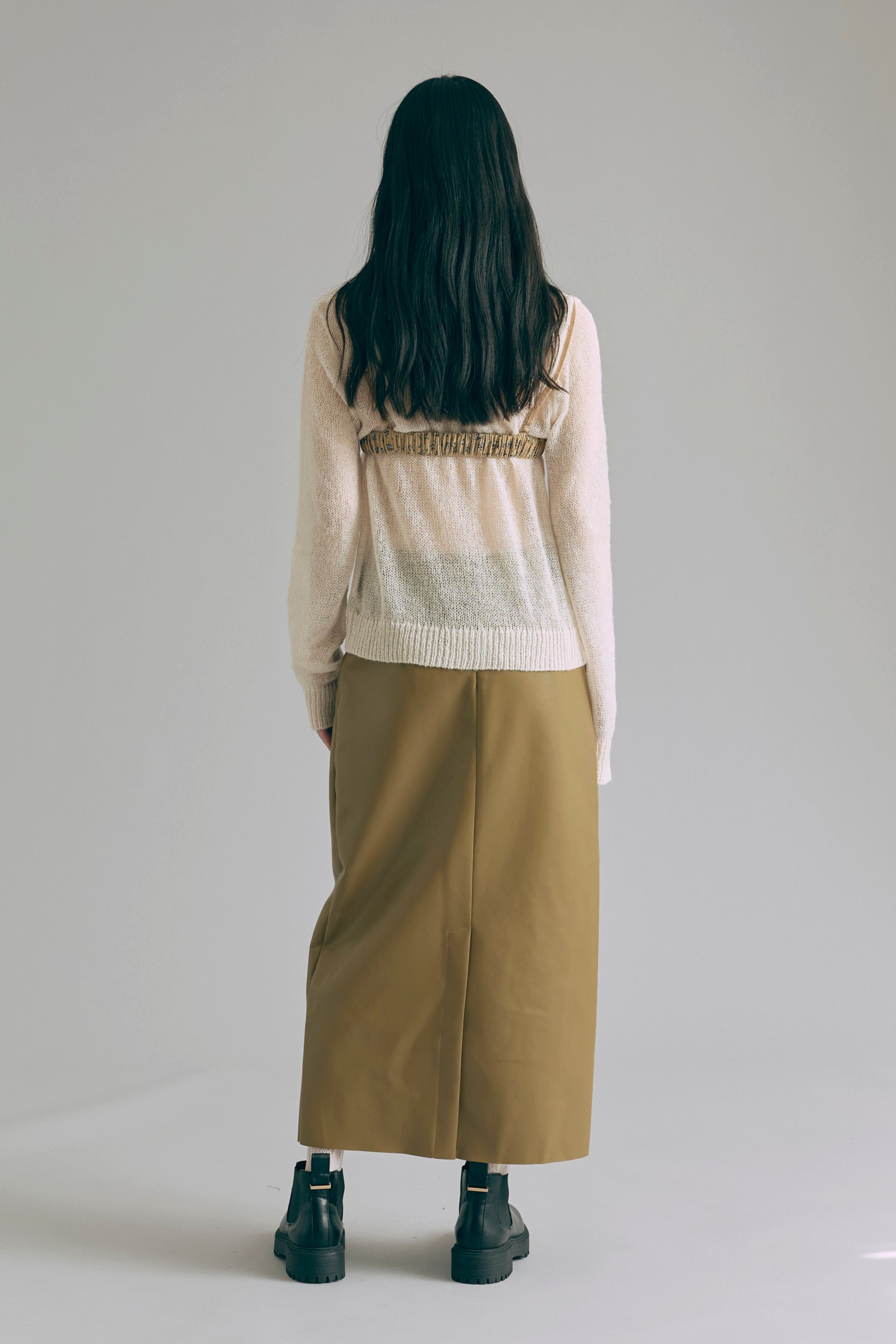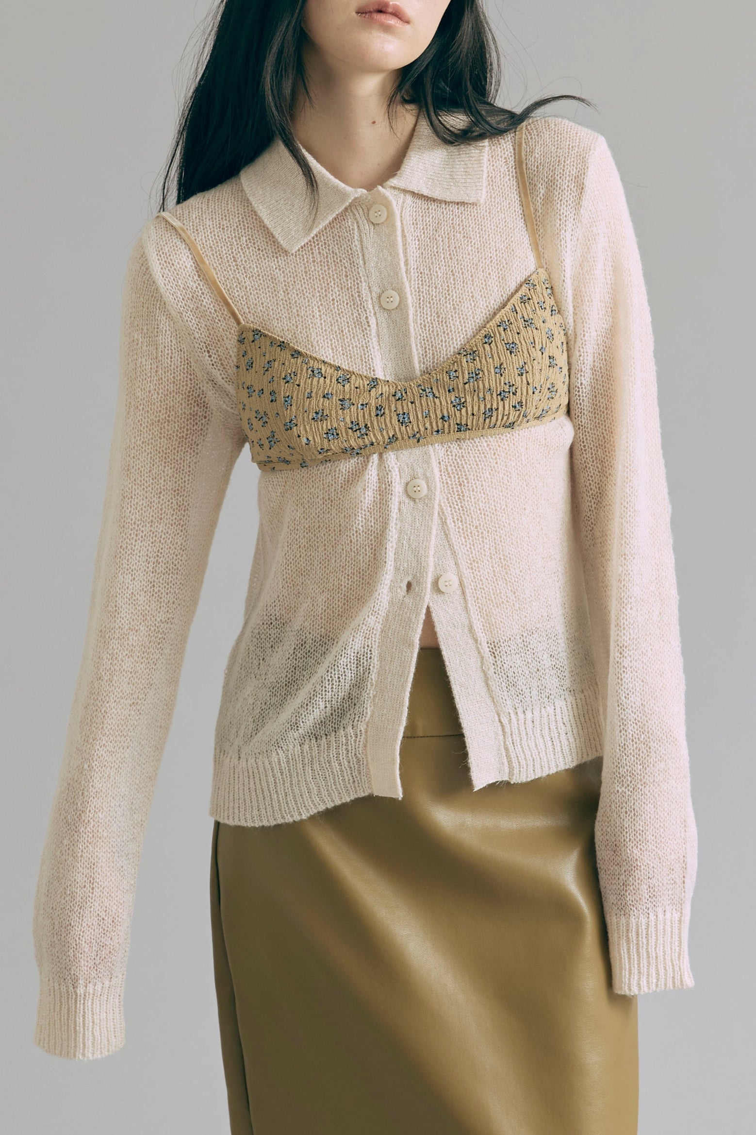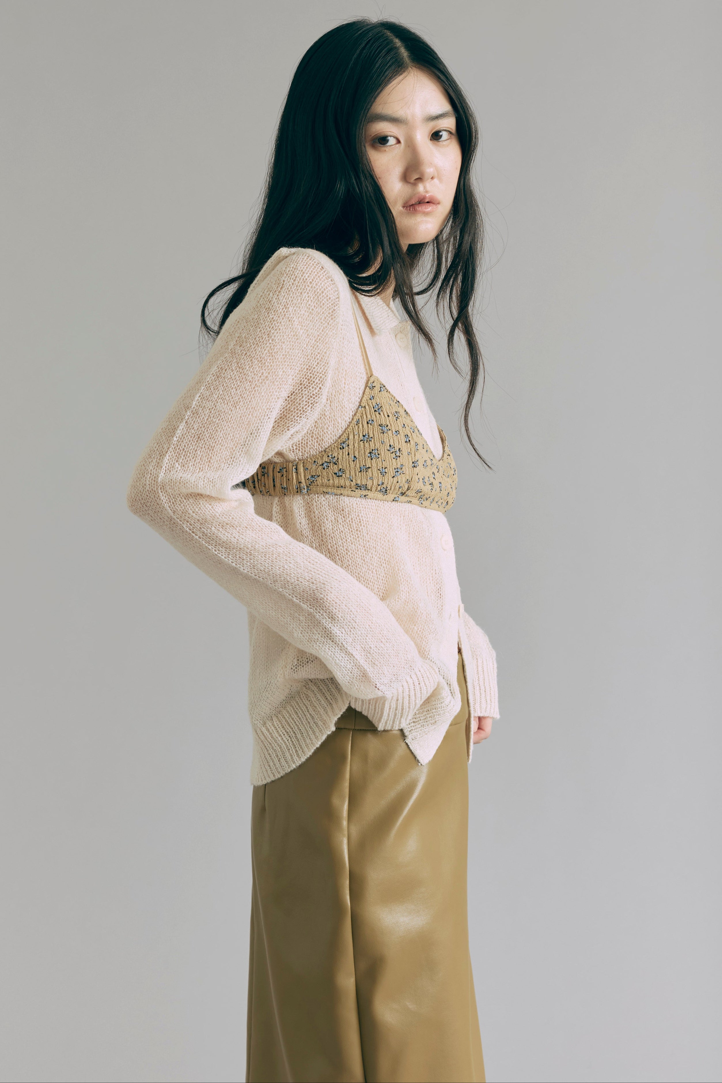 透け感で魅せるレイヤードスタイル 【Material】 軽くてふんわりとした素材を使用したニットは、薄手で肌触りが滑らか。透け感があるので、重ね着も楽しめ、朝晩の涼しさにも対応できる万能アイテムです。 【Design】 ポロネックデザインに、モヘアならではのシアーな風合いを組み合わせ、上品さと抜け感を両立。 スタイリング次第でシンプルにもモードにも着こなせるデザイン性がポイントです。 【Styling point】 デニムやワイドパンツと組み合わせると、リラックス感のあるコーディネートに。透け感を活かしたレイヤードスタイルも楽しめ、ジャケットやアウターを羽織れば一気にシックな雰囲気になります。