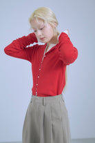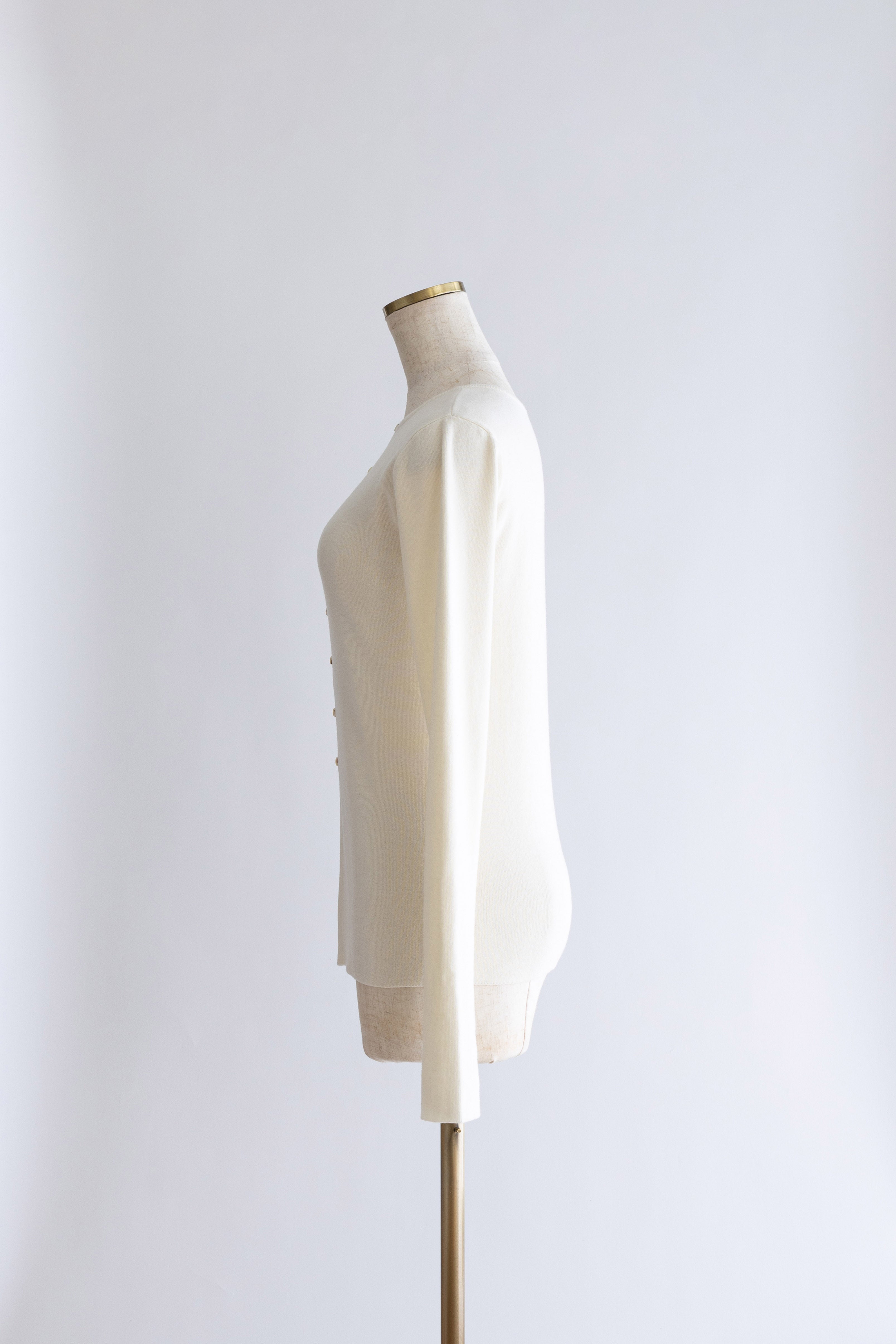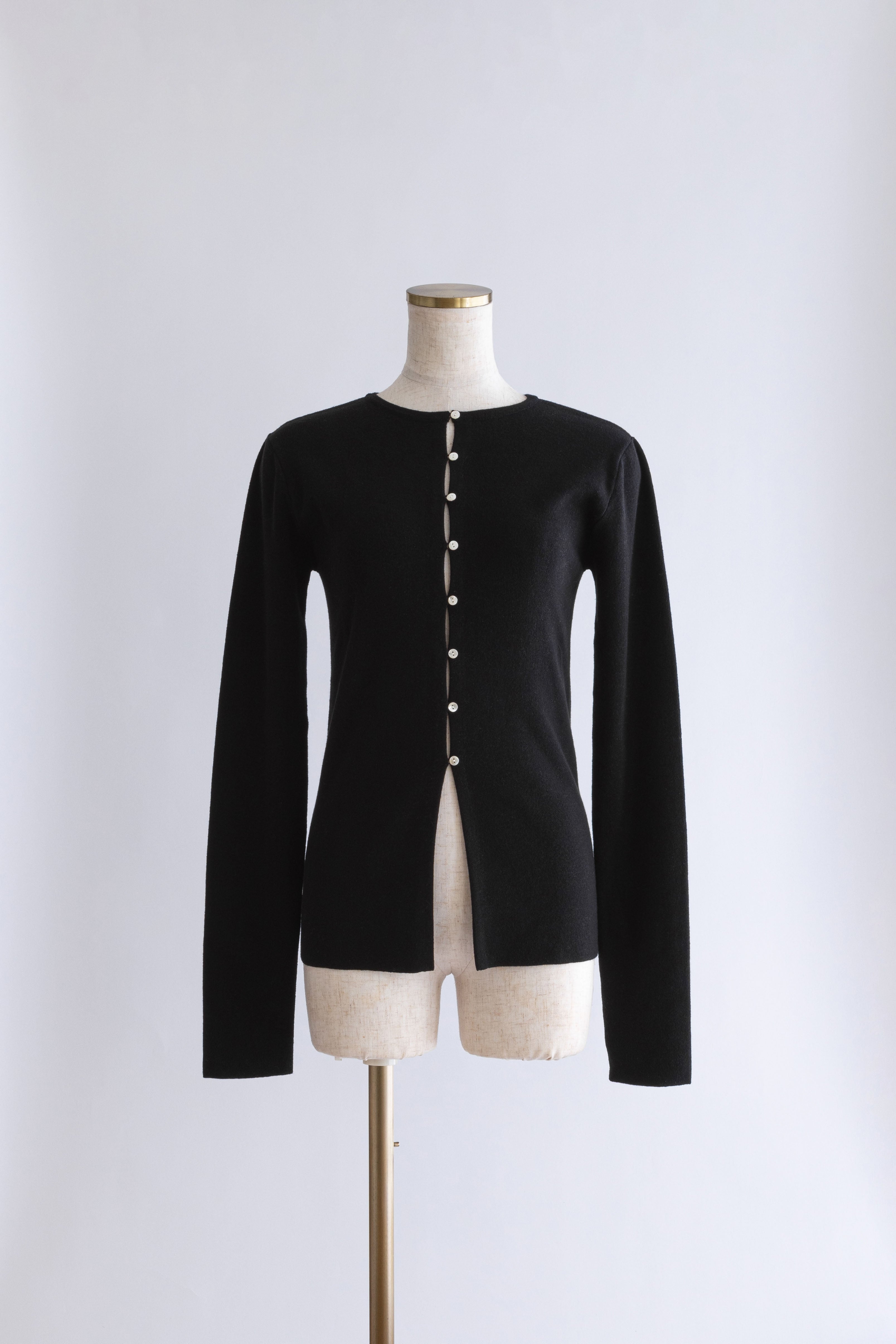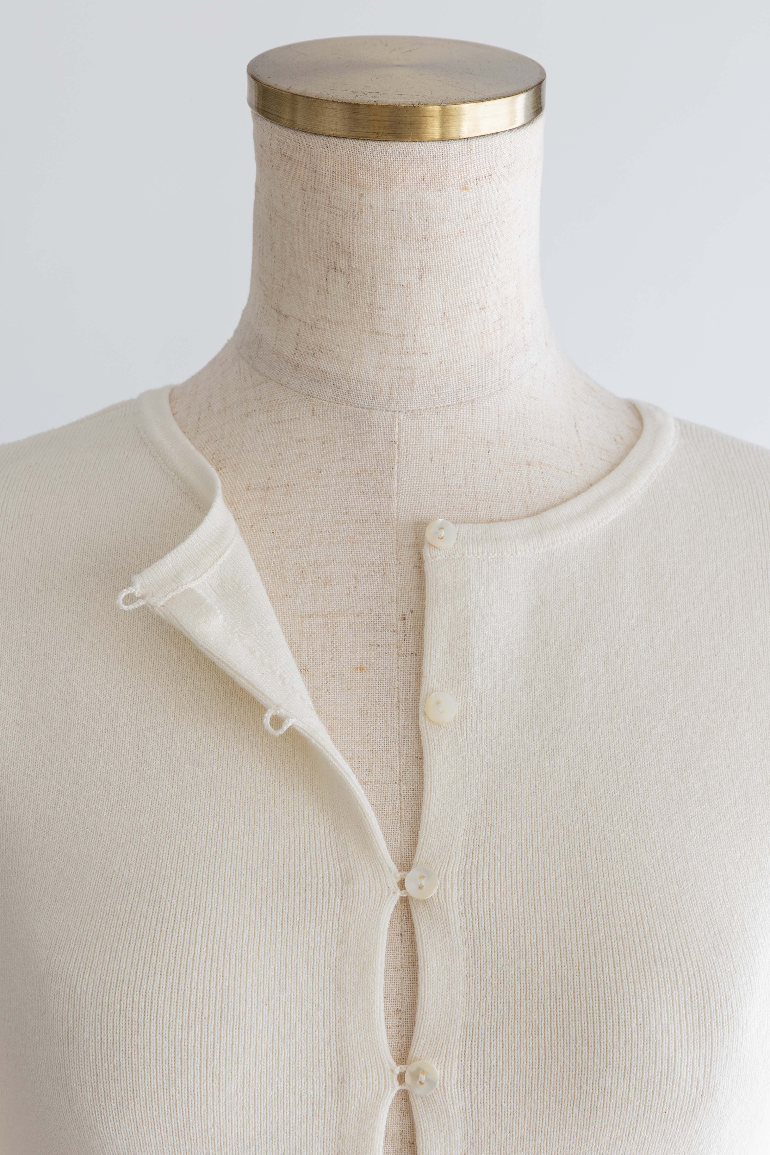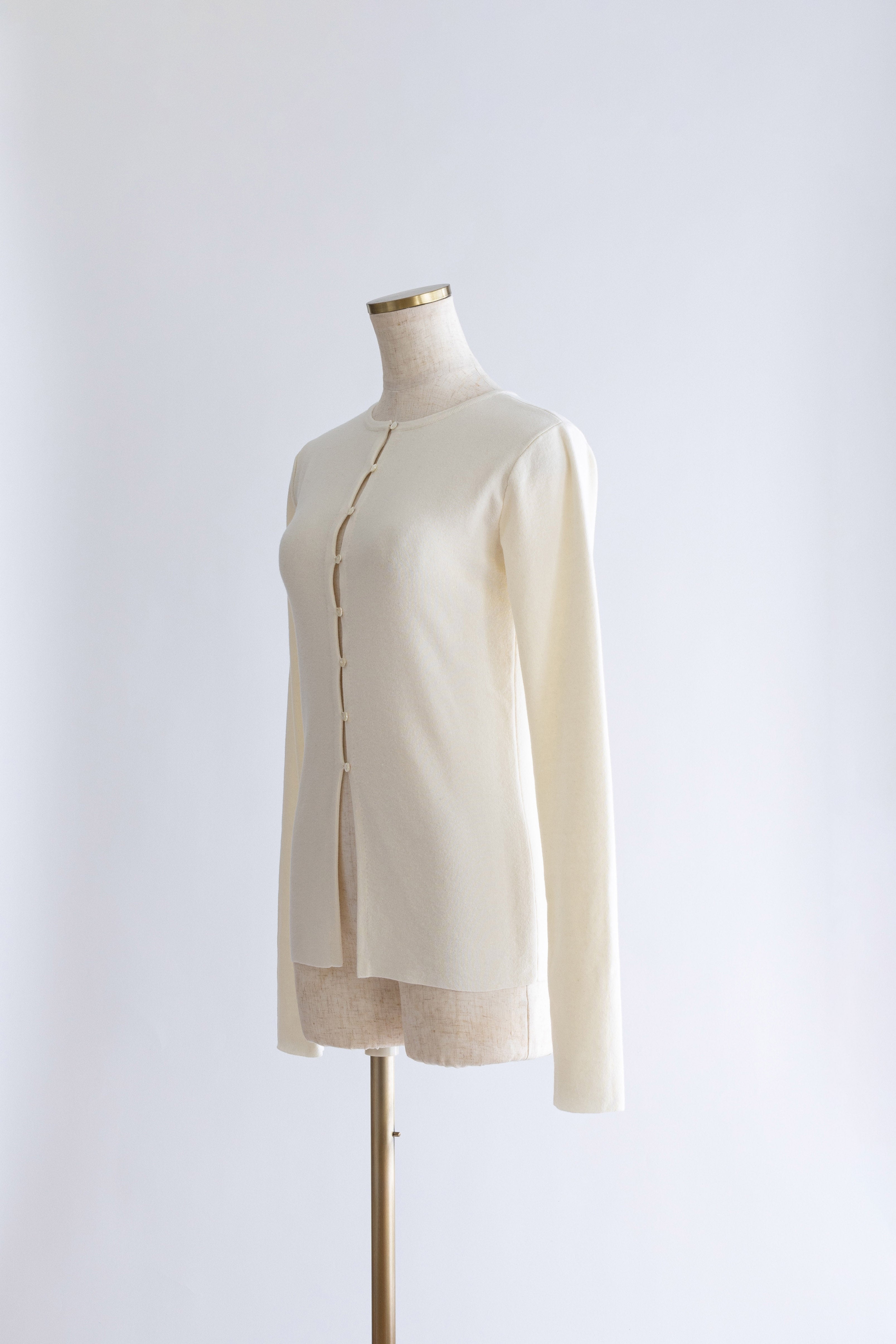 小ぶりボタンが、今のムードを引き立てる2WAYニット 【Material】 さらっとしたタッチで、ほどよいハリ感のあるニット素材を使用。編み目が細かく、上品でフラットな表面感が特徴です。ボタンデザインを引き立て、トップスとしてもカーディガンとしてもきれいに着られる素材感に仕上げています。 【Design】 フロントに並んだ小ぶりのボタンが、シンプルな中にさりげないアクセントをプラス。細身のシルエットが女性らしいラインをすっきりと見せてくれます。前を閉じてプルオーバー風に、開けてカーディガンとしても着用できる2WAY仕様で、着こなしの幅が広がる一枚です。 【Styling point】 前を留めてトップスとして着用すれば、フレアスカートやタイトスカートと好相性。カーディガンとして羽織れば、ワイドパンツのゆるさを引き締め、バランスの取れたスタイリングに仕上がります。季節の変わり目にも重宝する、着回し力の高いアイテムです。