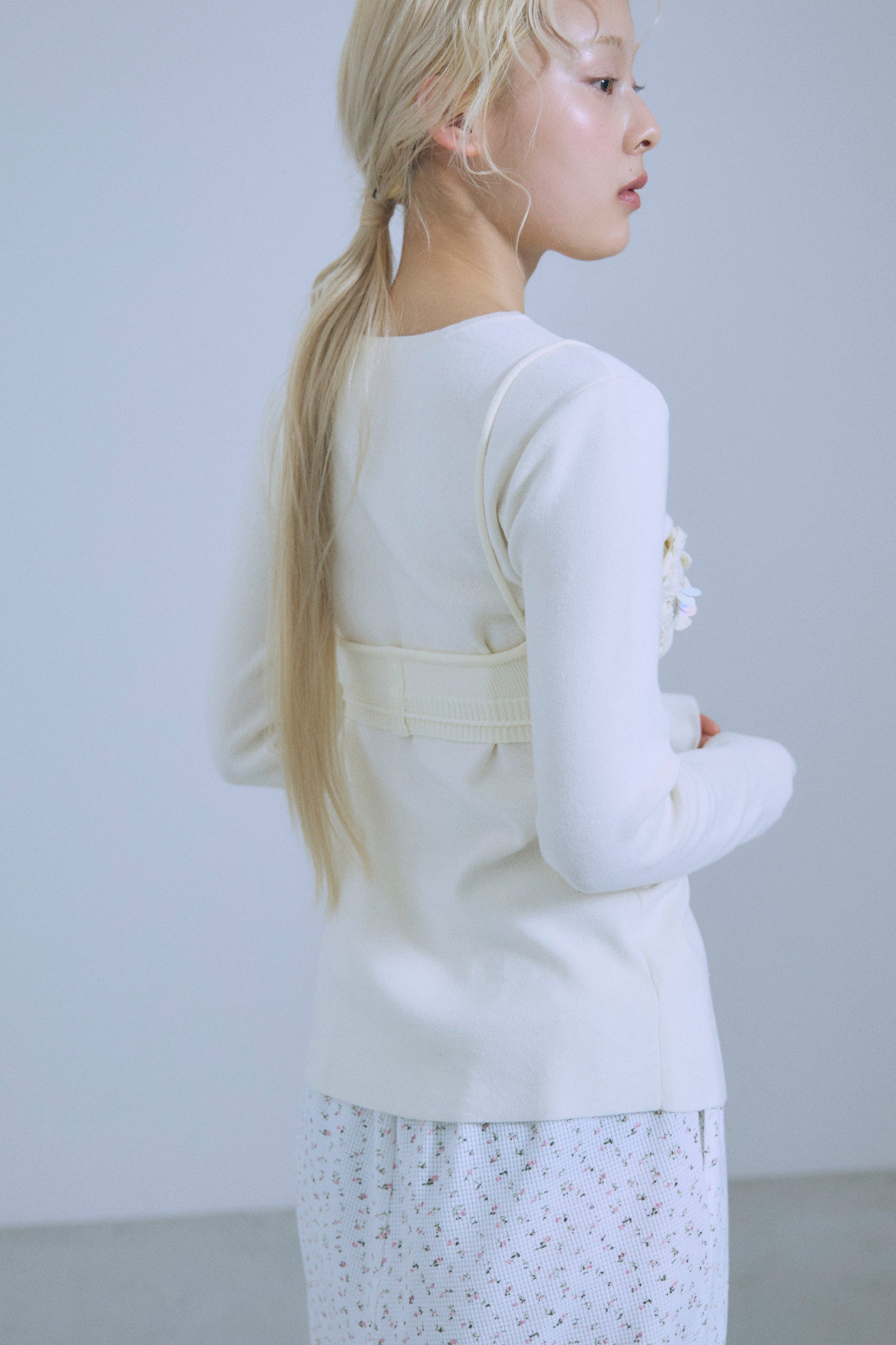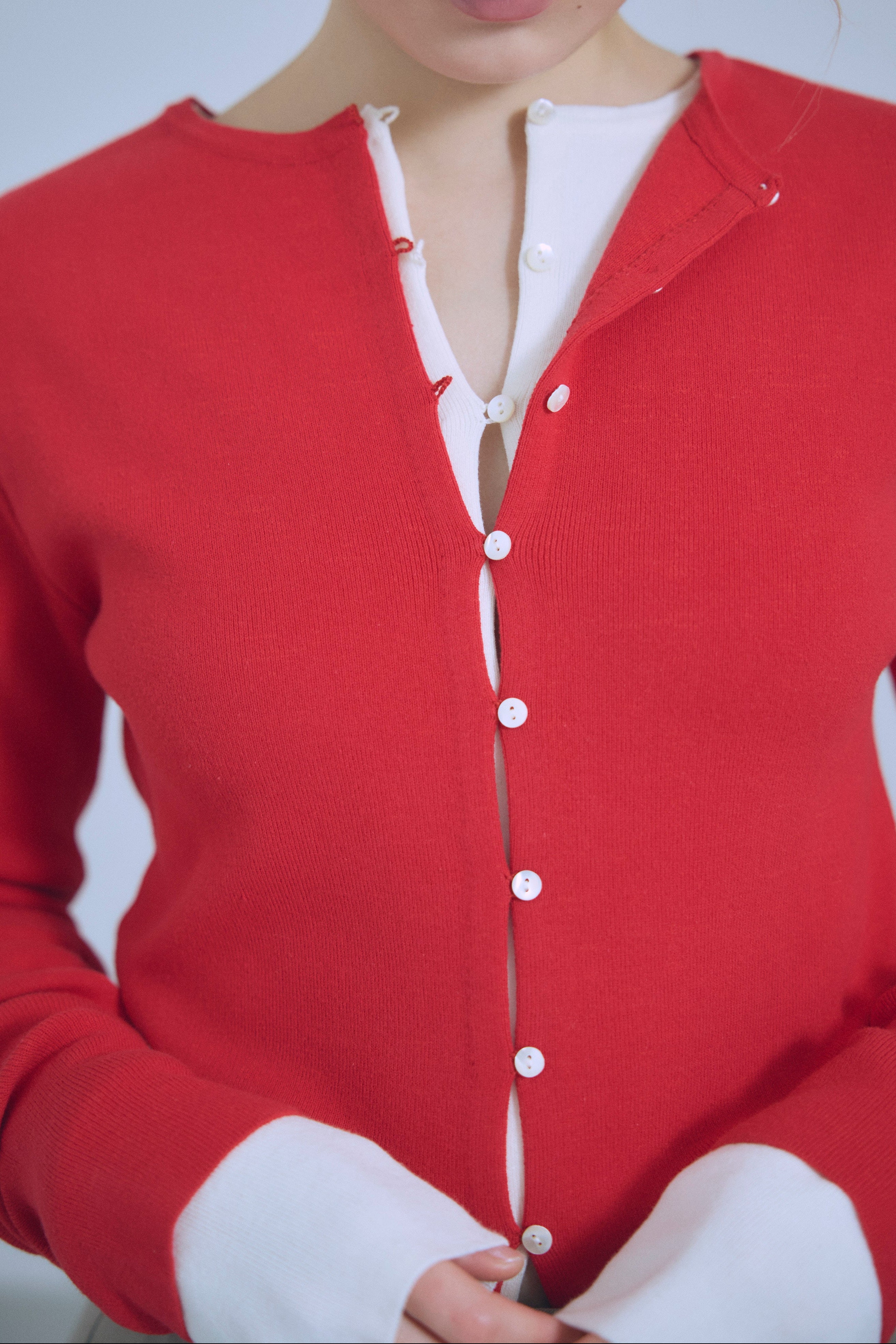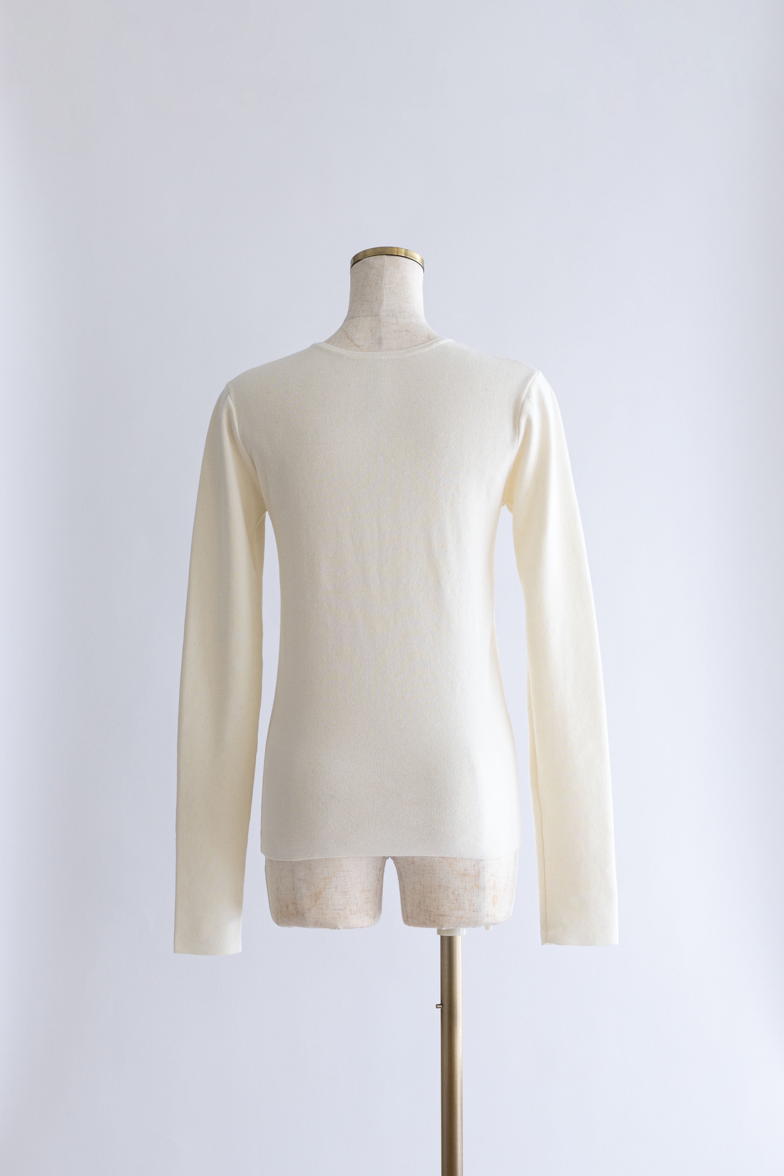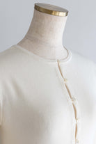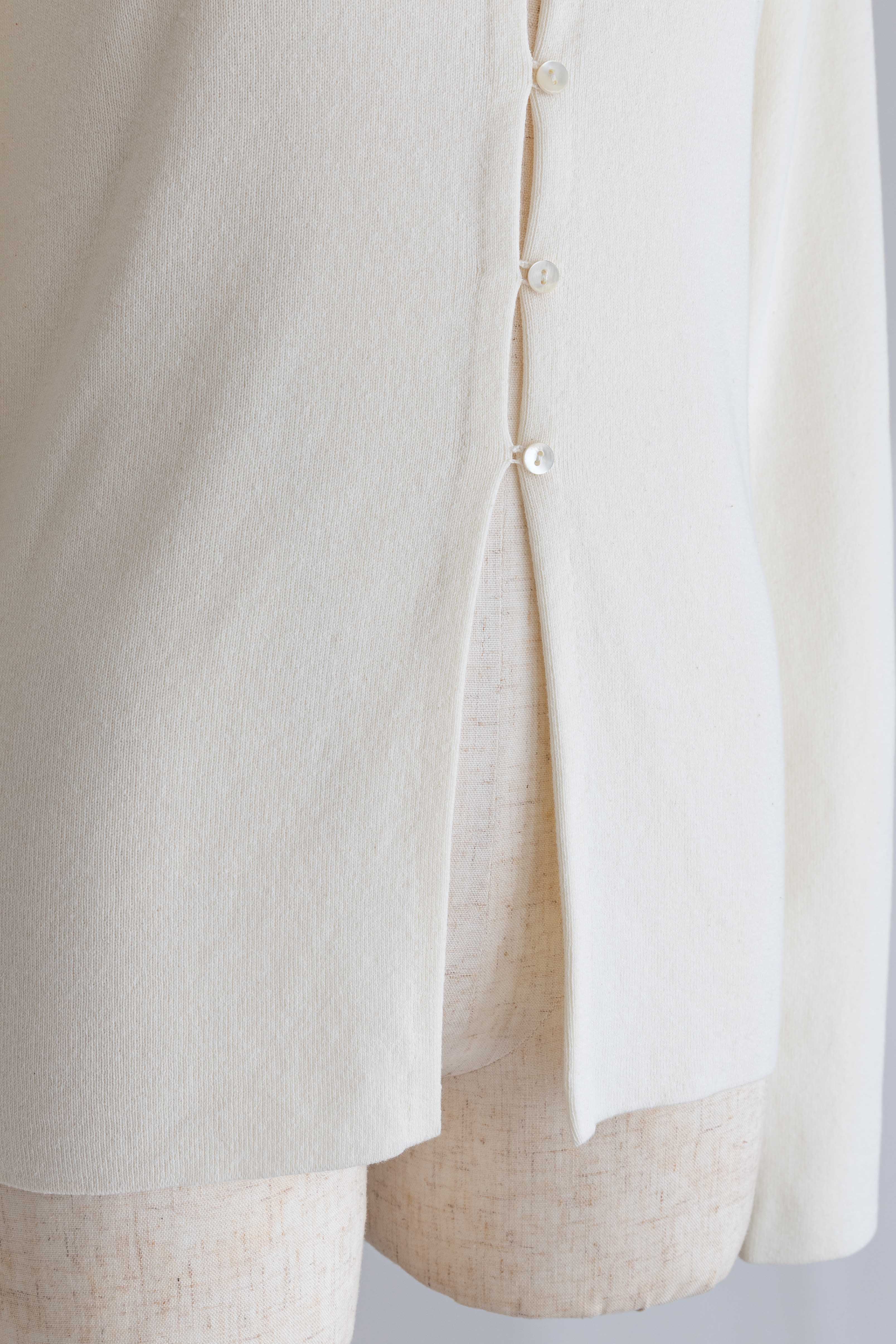小ぶりボタンが、今のムードを引き立てる2WAYニット 【Material】 さらっとしたタッチで、ほどよいハリ感のあるニット素材を使用。編み目が細かく、上品でフラットな表面感が特徴です。ボタンデザインを引き立て、トップスとしてもカーディガンとしてもきれいに着られる素材感に仕上げています。 【Design】 フロントに並んだ小ぶりのボタンが、シンプルな中にさりげないアクセントをプラス。細身のシルエットが女性らしいラインをすっきりと見せてくれます。前を閉じてプルオーバー風に、開けてカーディガンとしても着用できる2WAY仕様で、着こなしの幅が広がる一枚です。 【Styling point】 前を留めてトップスとして着用すれば、フレアスカートやタイトスカートと好相性。カーディガンとして羽織れば、ワイドパンツのゆるさを引き締め、バランスの取れたスタイリングに仕上がります。季節の変わり目にも重宝する、着回し力の高いアイテムです。