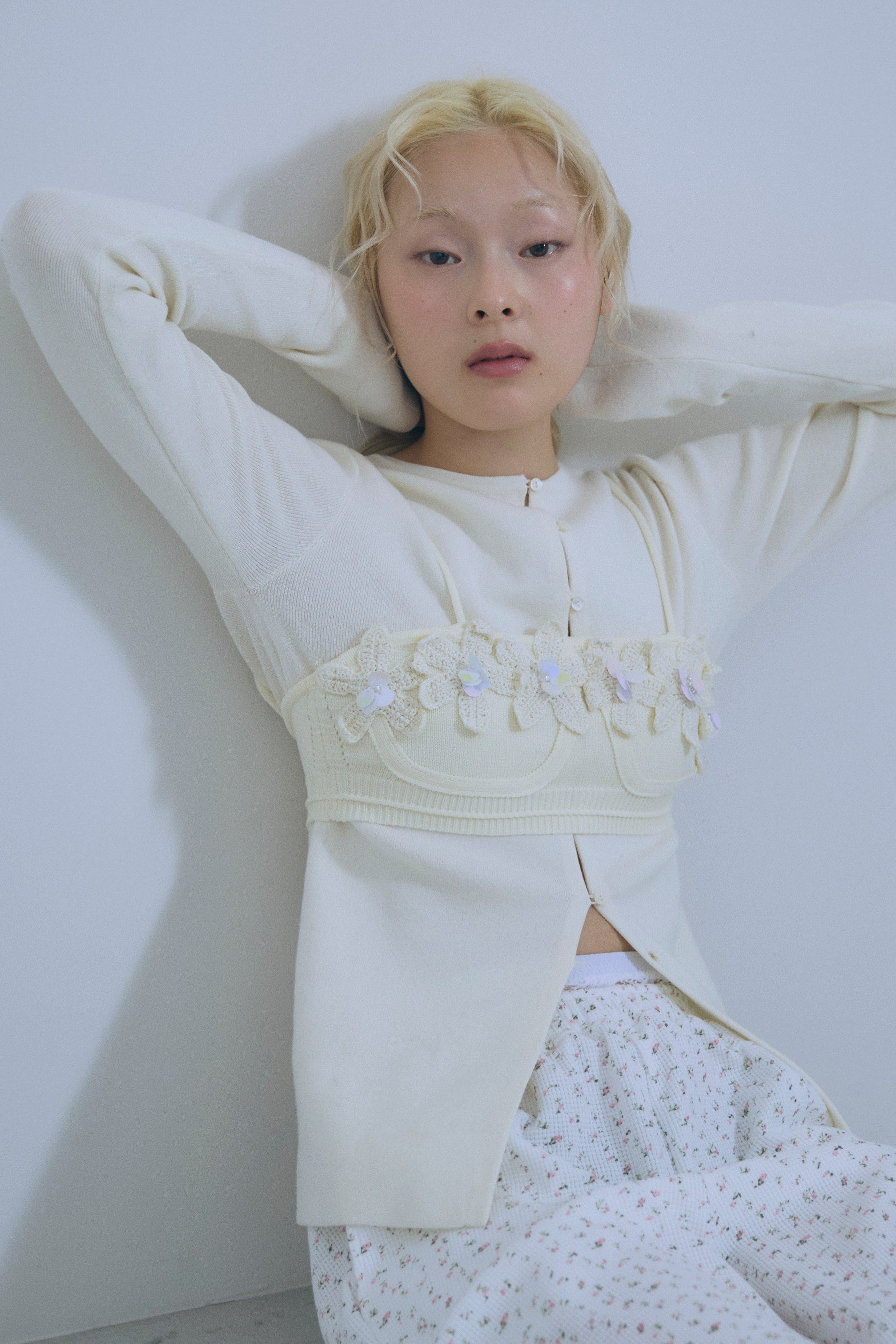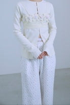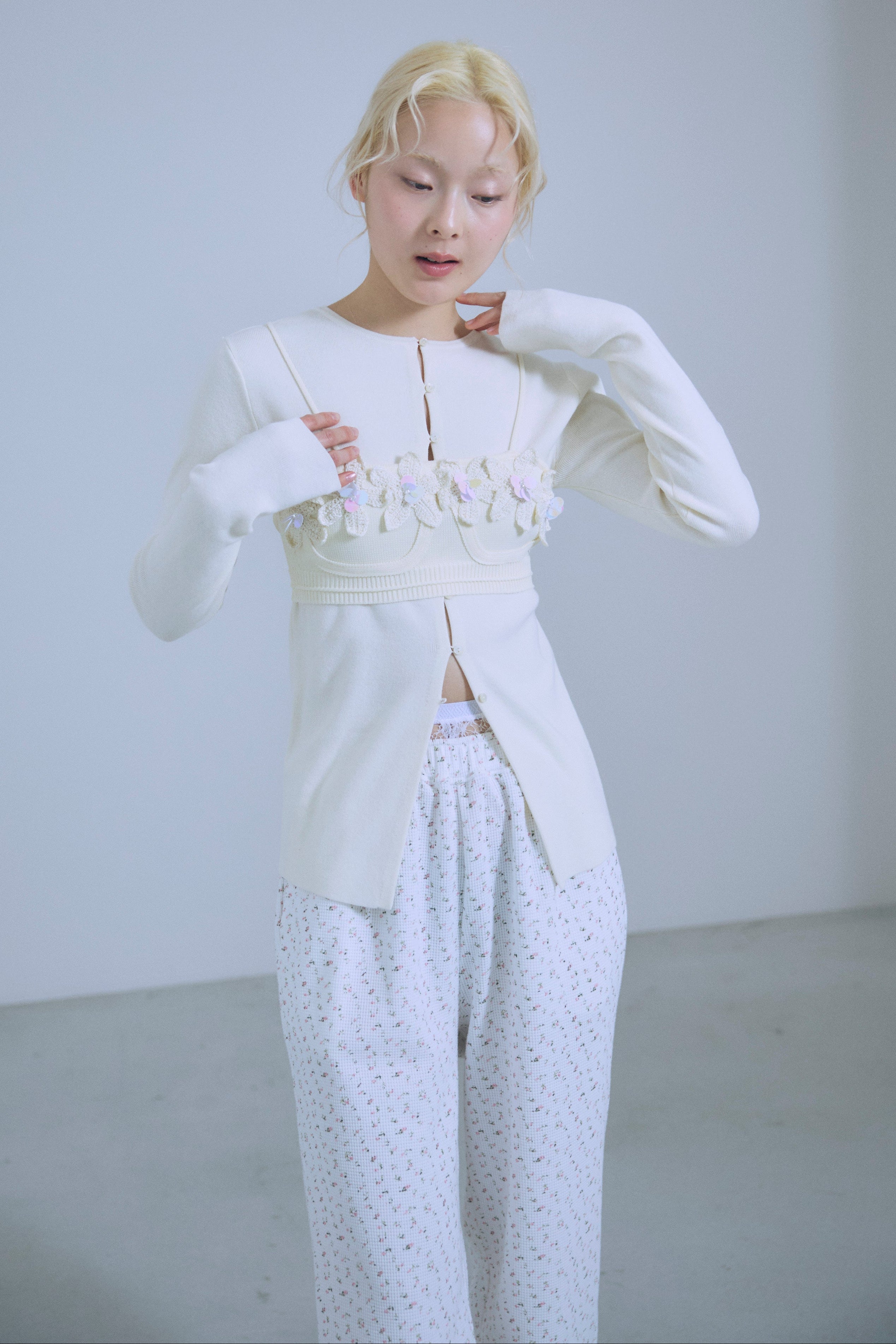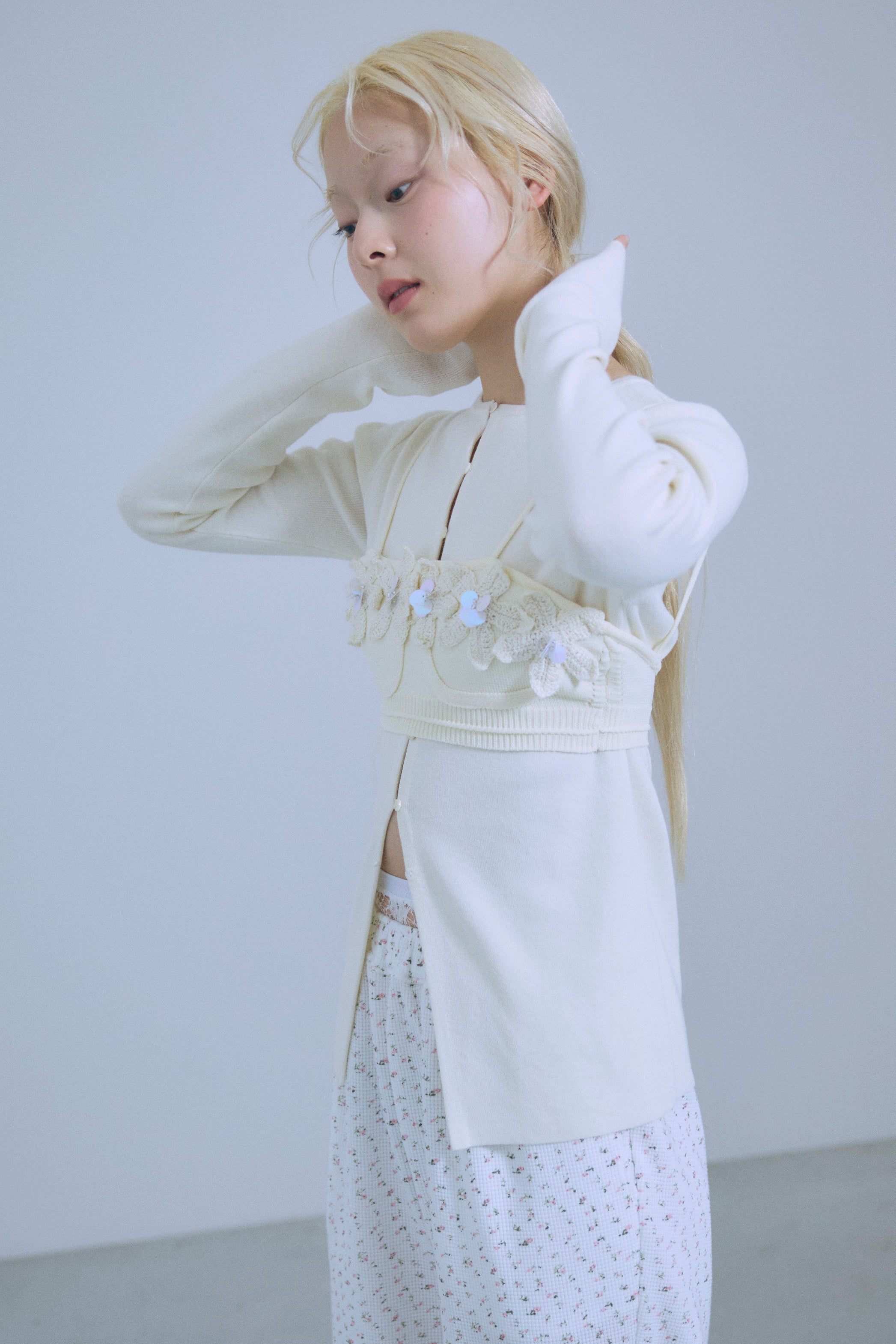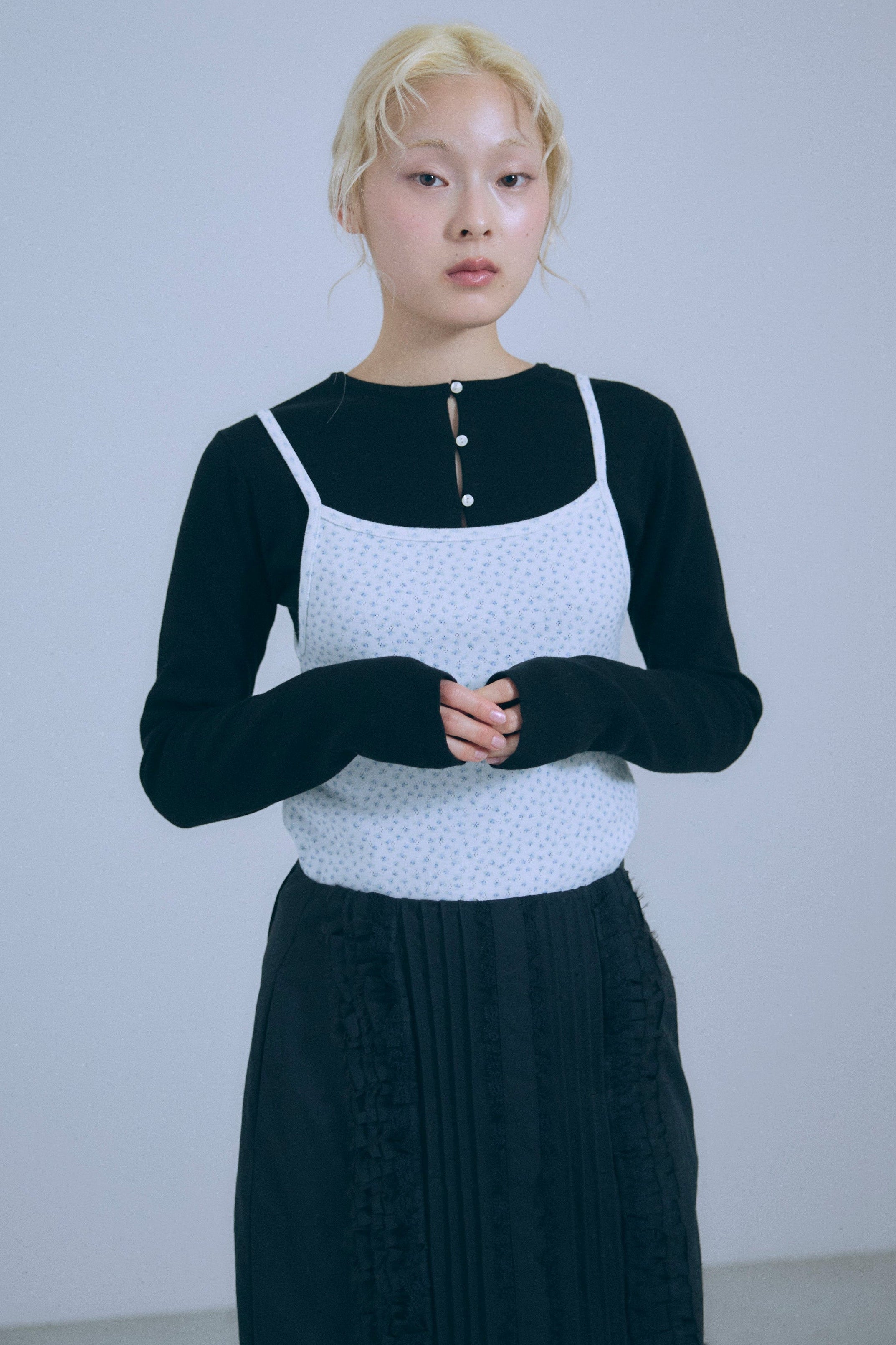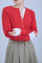小ぶりボタンが、今のムードを引き立てる2WAYニット 【Material】 さらっとしたタッチで、ほどよいハリ感のあるニット素材を使用。編み目が細かく、上品でフラットな表面感が特徴です。ボタンデザインを引き立て、トップスとしてもカーディガンとしてもきれいに着られる素材感に仕上げています。 【Design】 フロントに並んだ小ぶりのボタンが、シンプルな中にさりげないアクセントをプラス。細身のシルエットが女性らしいラインをすっきりと見せてくれます。前を閉じてプルオーバー風に、開けてカーディガンとしても着用できる2WAY仕様で、着こなしの幅が広がる一枚です。 【Styling point】 前を留めてトップスとして着用すれば、フレアスカートやタイトスカートと好相性。カーディガンとして羽織れば、ワイドパンツのゆるさを引き締め、バランスの取れたスタイリングに仕上がります。季節の変わり目にも重宝する、着回し力の高いアイテムです。
