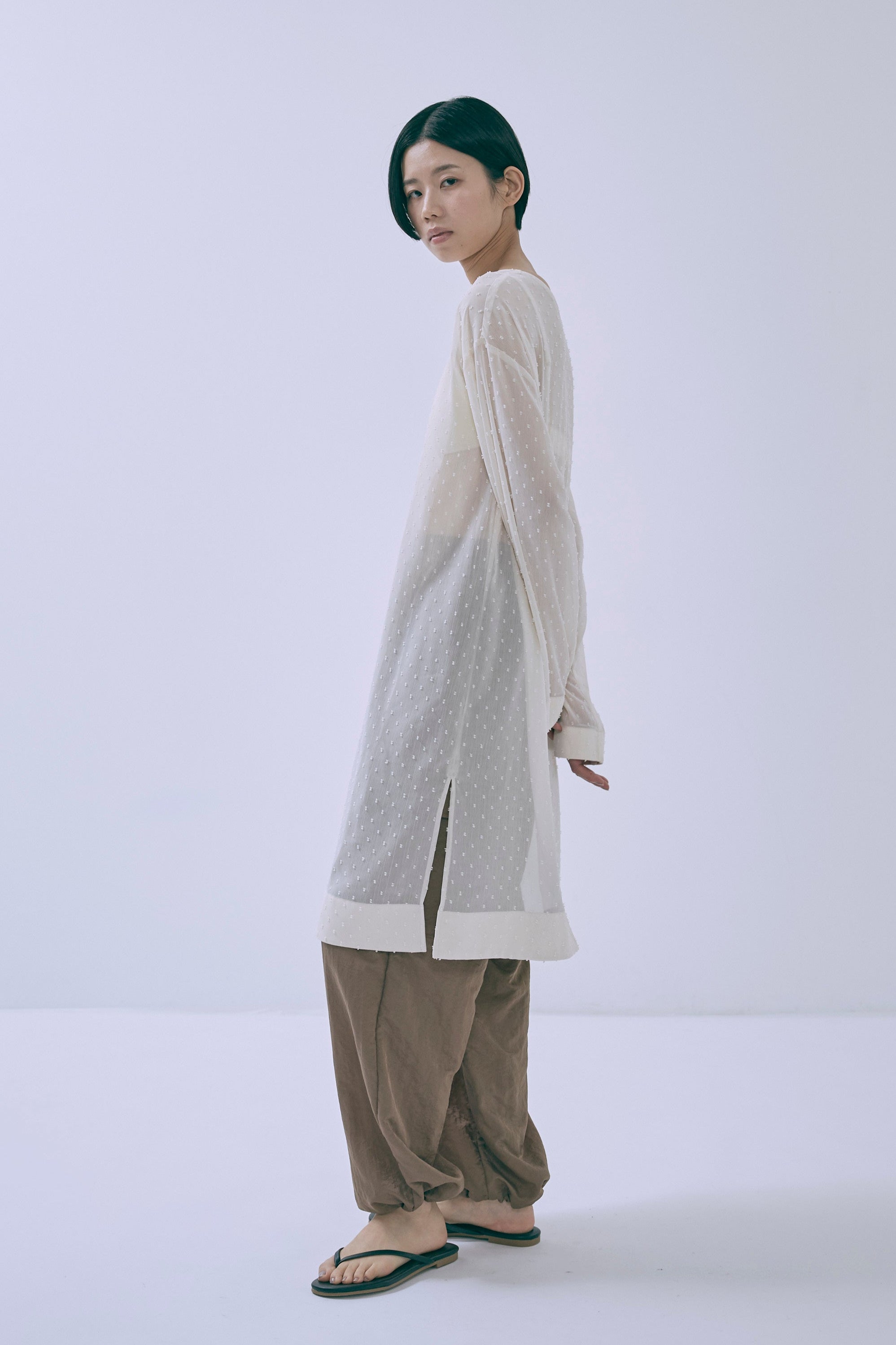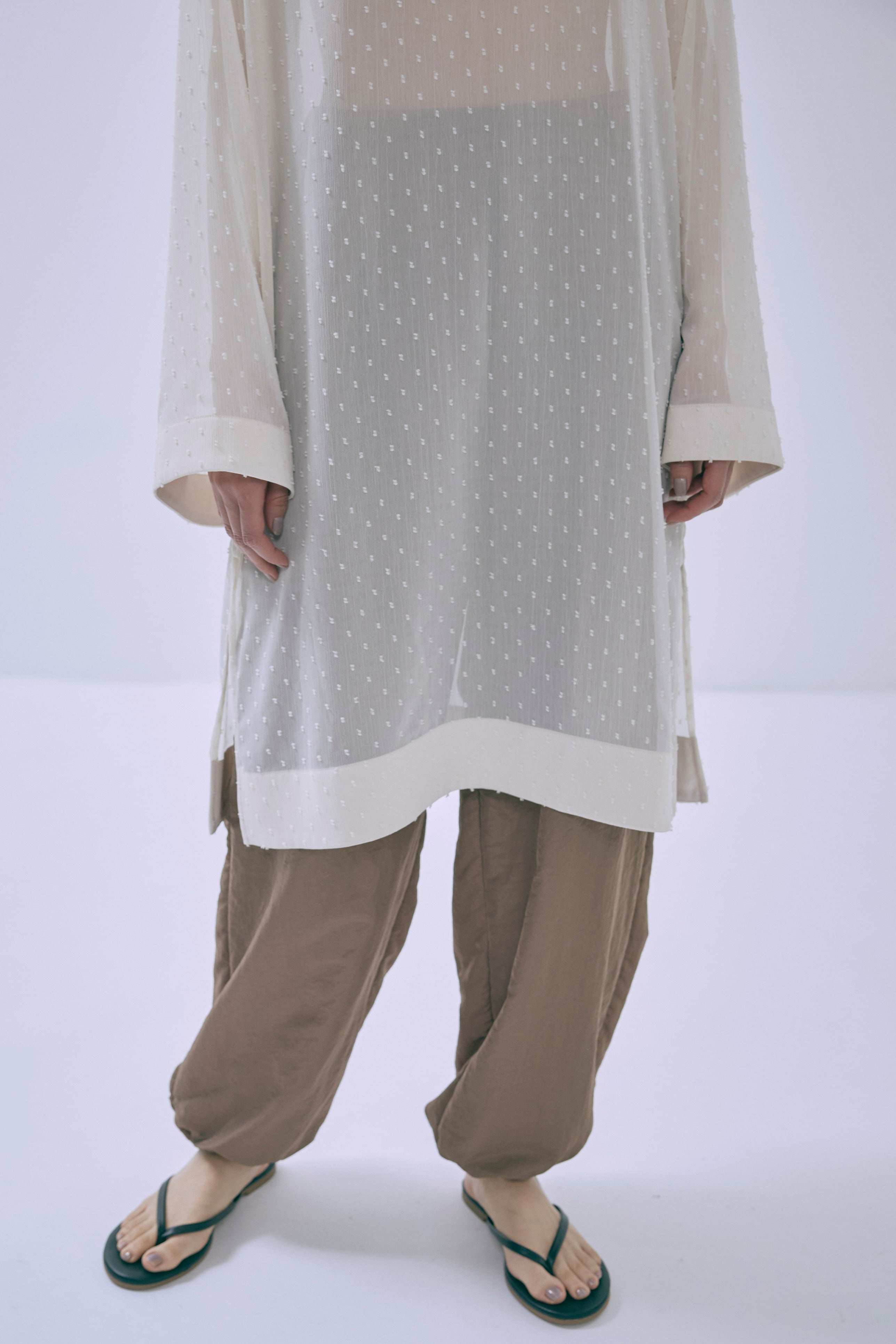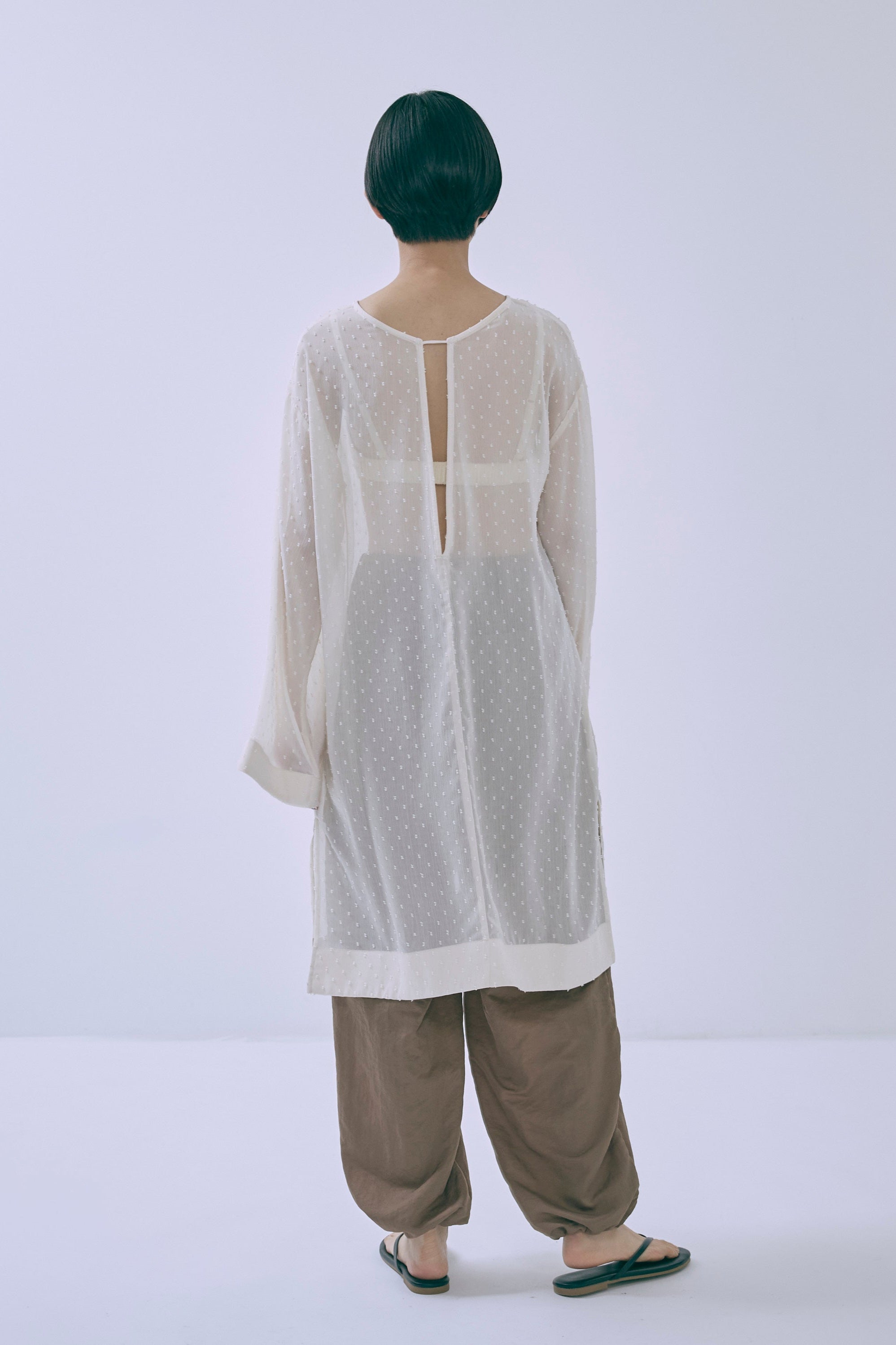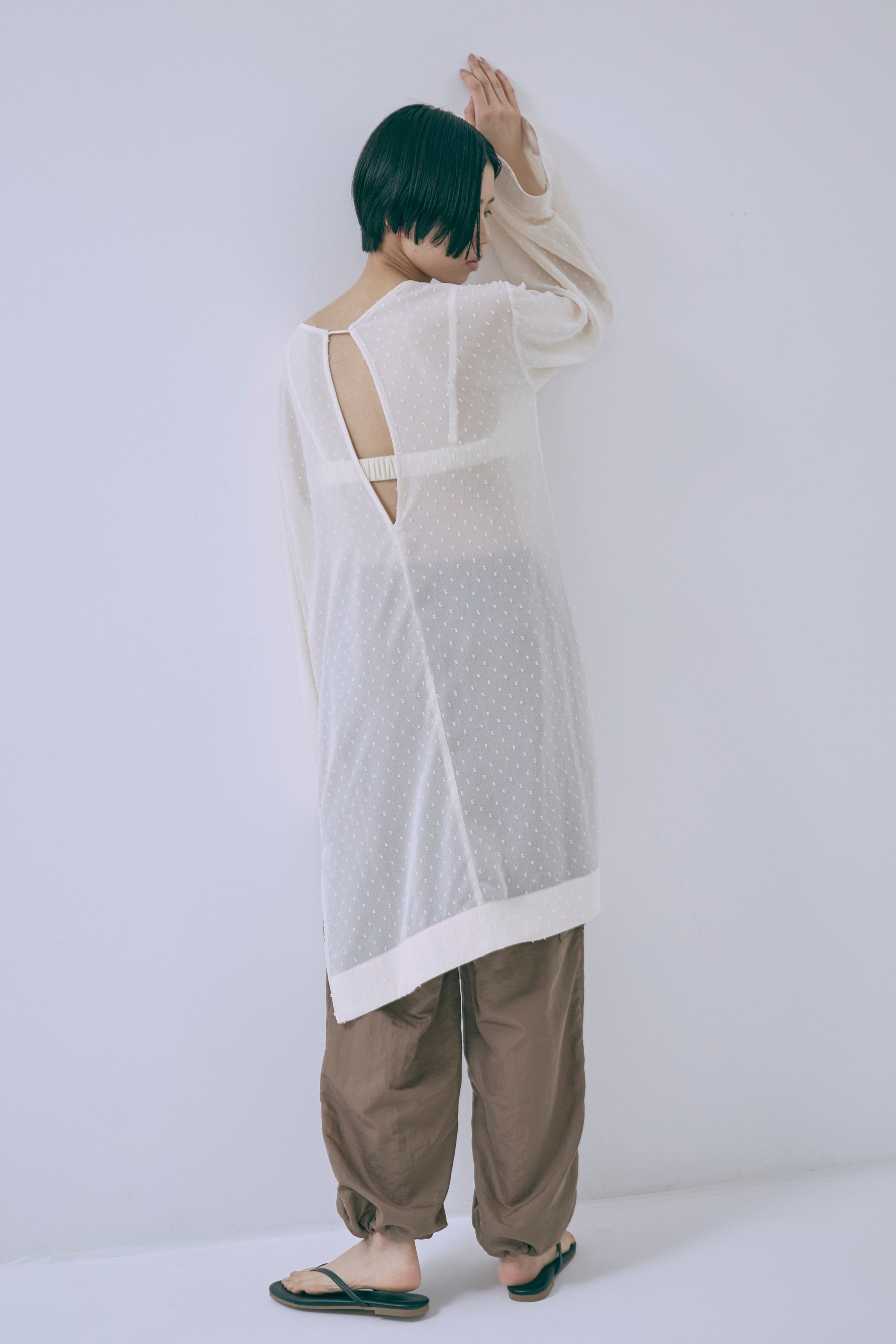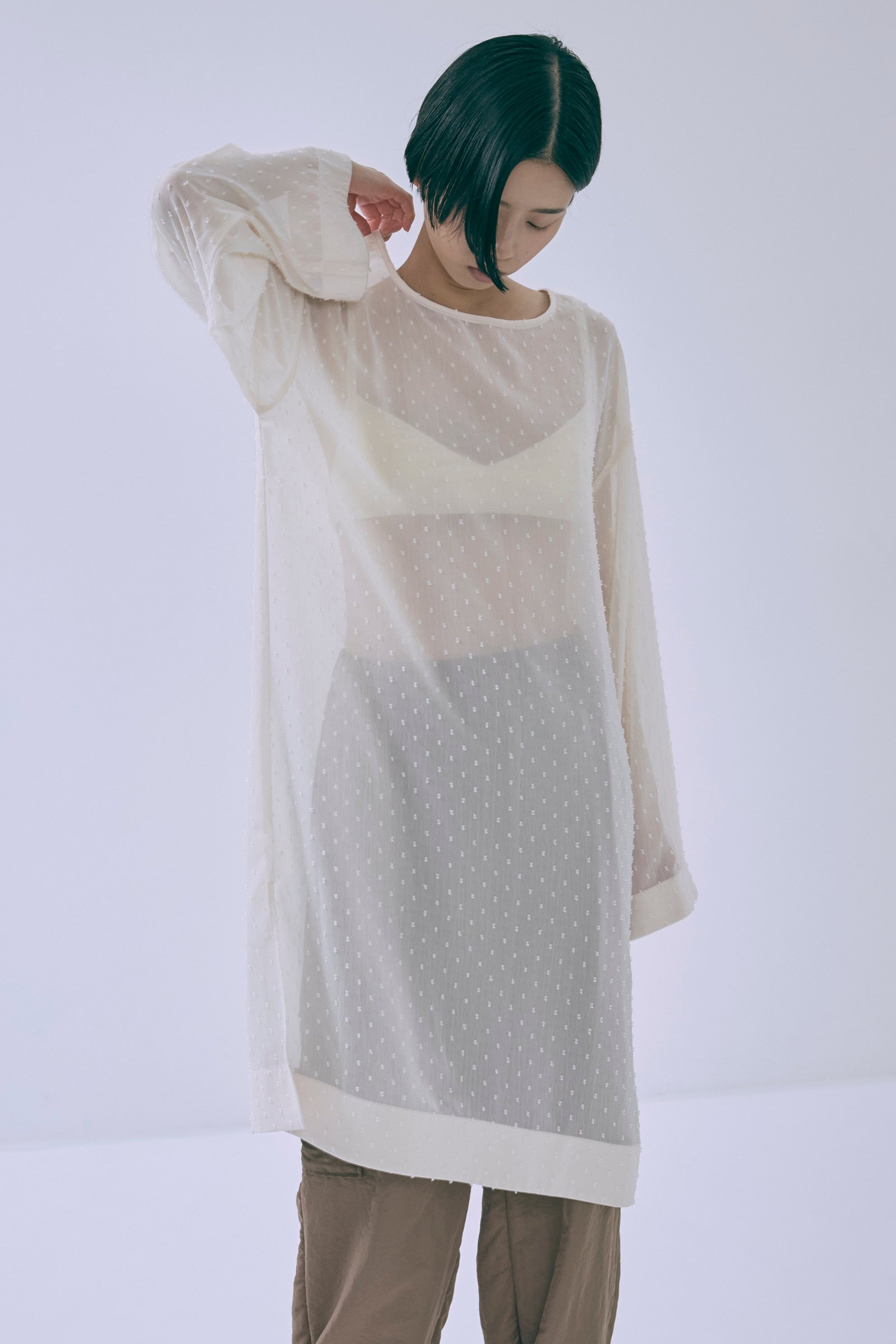 ふわっと起毛感のあるスノーカットドットの表面感は着るだけで着映えする、華やかなチュニックブラウス シアードットチュニック 【Material】 ふわふわと立体的なドットカットジャガードが特徴的なジョーゼット生地。 【Design】 チュニック丈の着丈とワイドな袖口が、ラフな雰囲気のある一着。 深めに入った身頃のスリットは前後2WAYでも着用可能です。 袖口と裾の裏側にはサテンの見返しを効かせ、細かい部分にもこだわったデザイン。 【Styling point】 ゆるめのパンツやスラックスなどと合わせてラフにシンプルな着こなしがおすすめです。