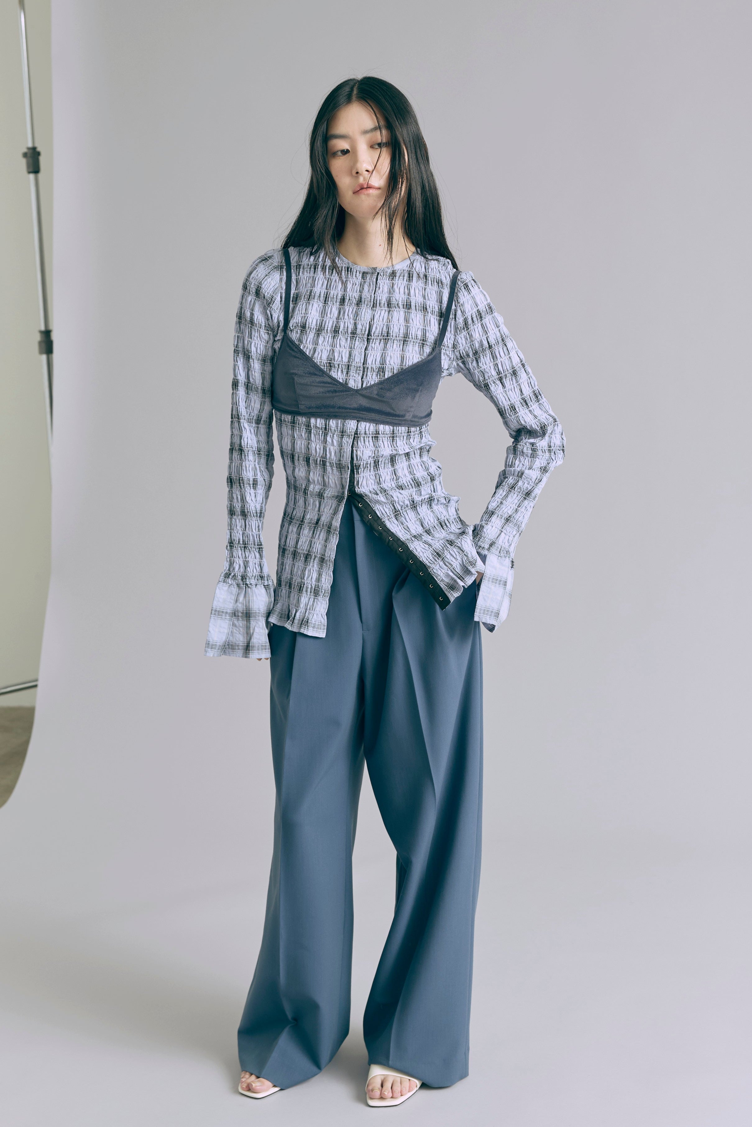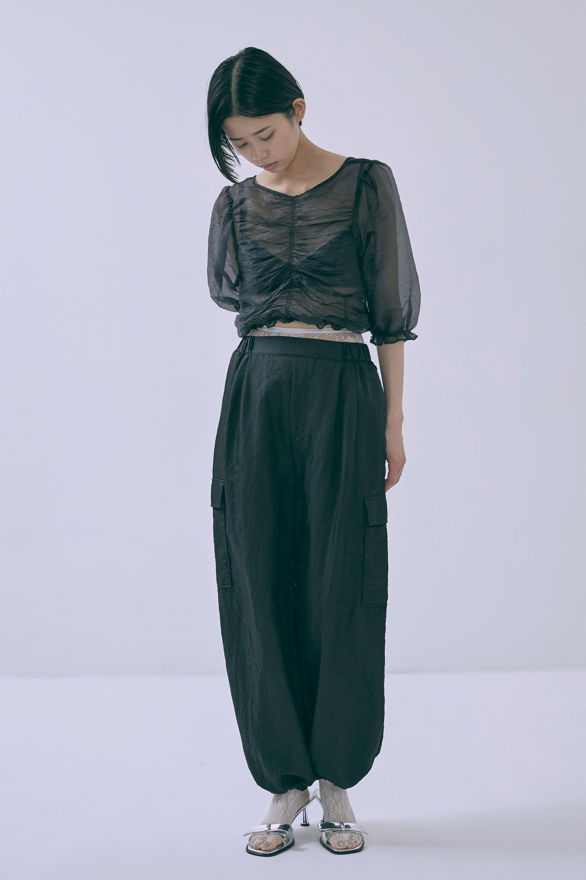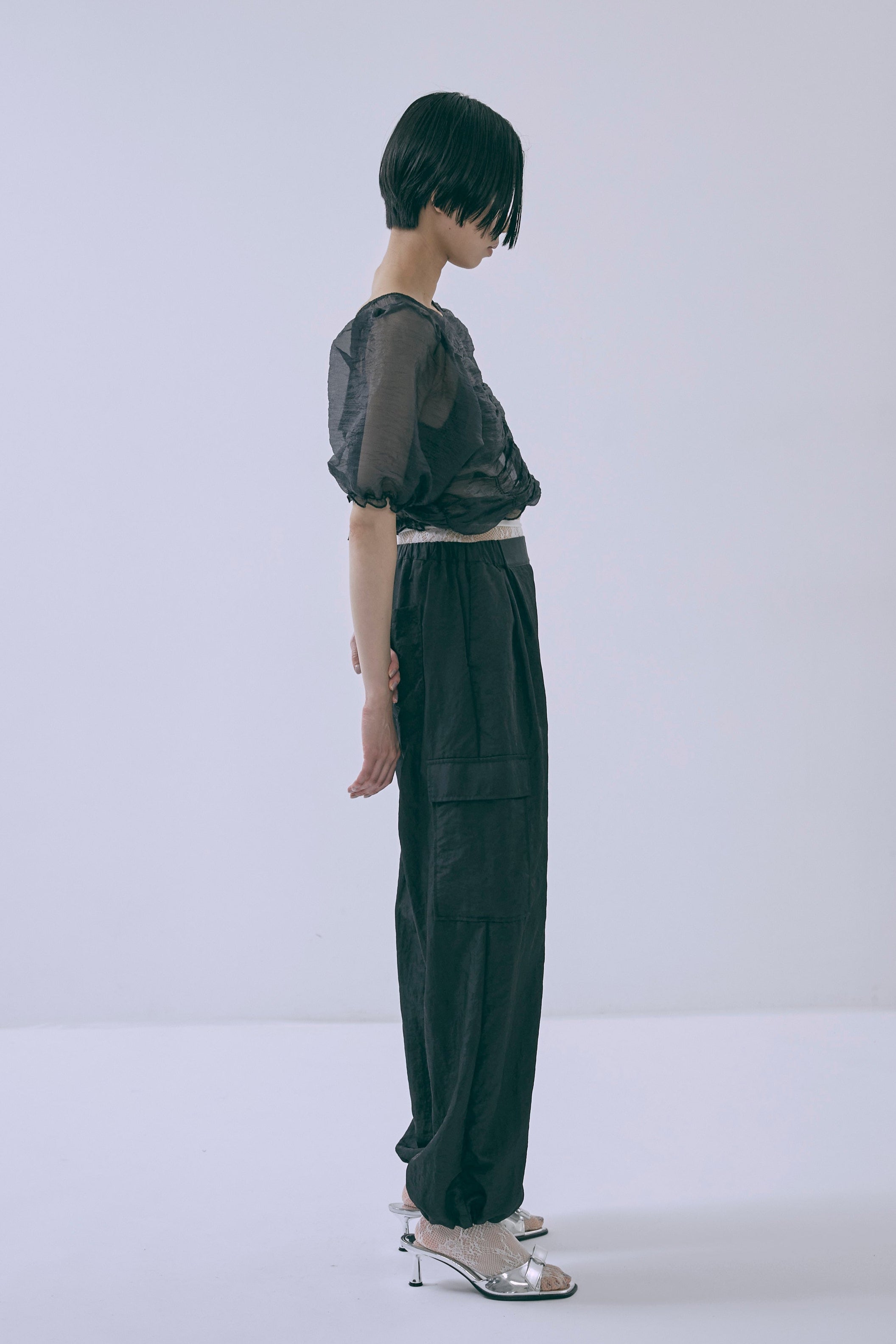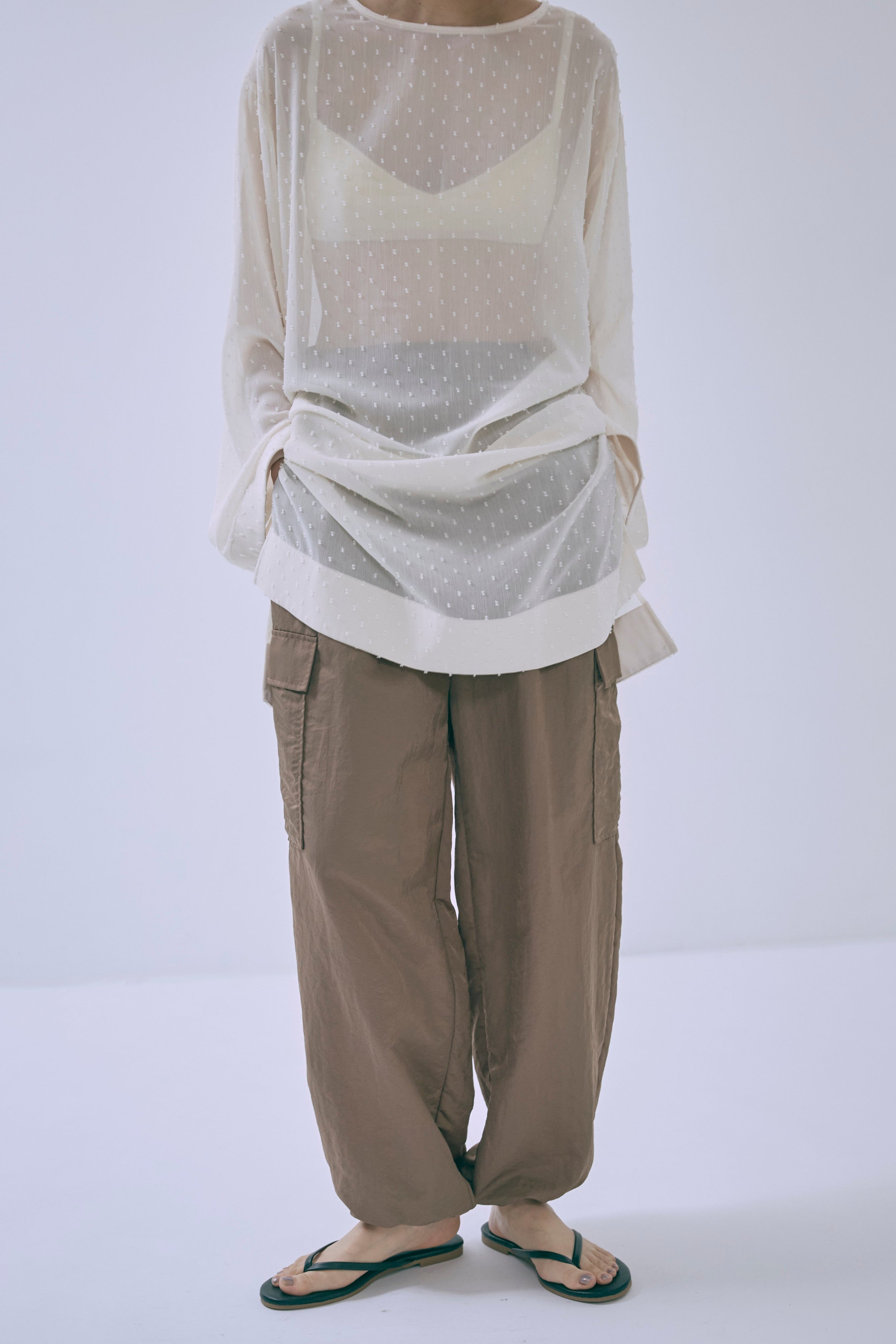 ふわっと起毛感のあるスノーカットドットの表面感は着るだけで着映えする、華やかなチュニックブラウス シアードットチュニック 【Material】 ふわふわと立体的なドットカットジャガードが特徴的なジョーゼット生地。 【Design】 チュニック丈の着丈とワイドな袖口が、ラフな雰囲気のある一着。 深めに入った身頃のスリットは前後2WAYでも着用可能です。 袖口と裾の裏側にはサテンの見返しを効かせ、細かい部分にもこだわったデザイン。 【Styling point】 ゆるめのパンツやスラックスなどと合わせてラフにシンプルな着こなしがおすすめです。