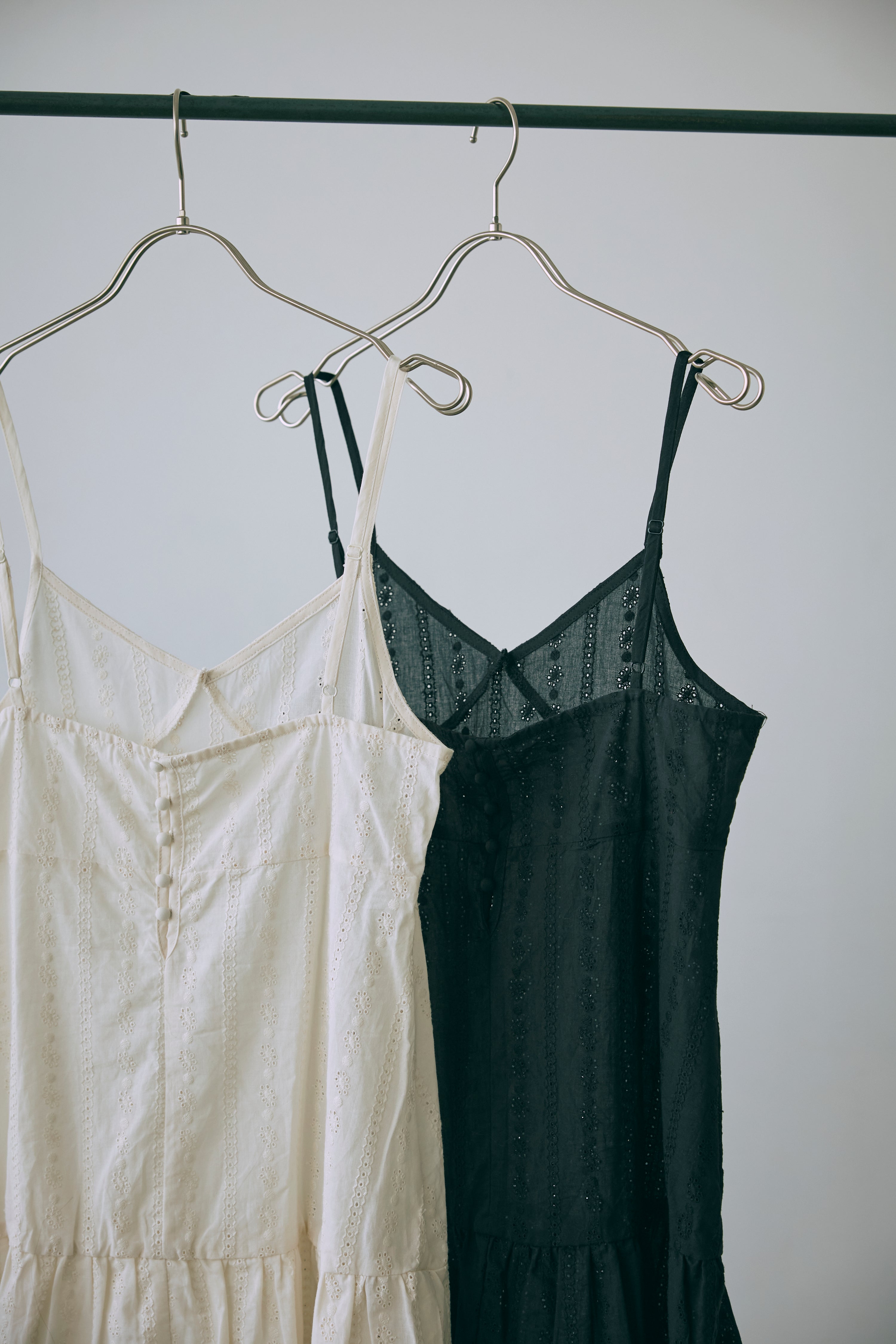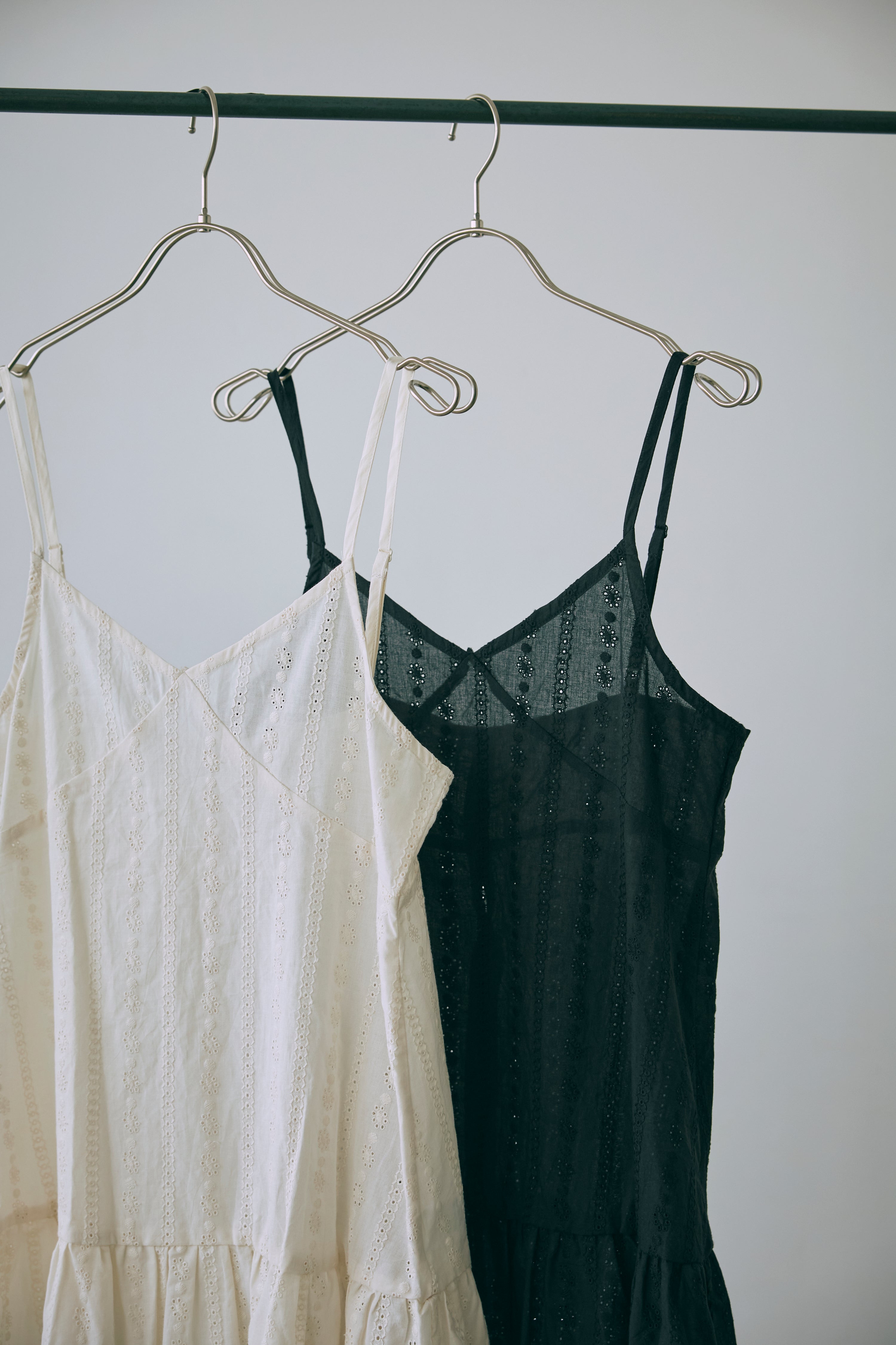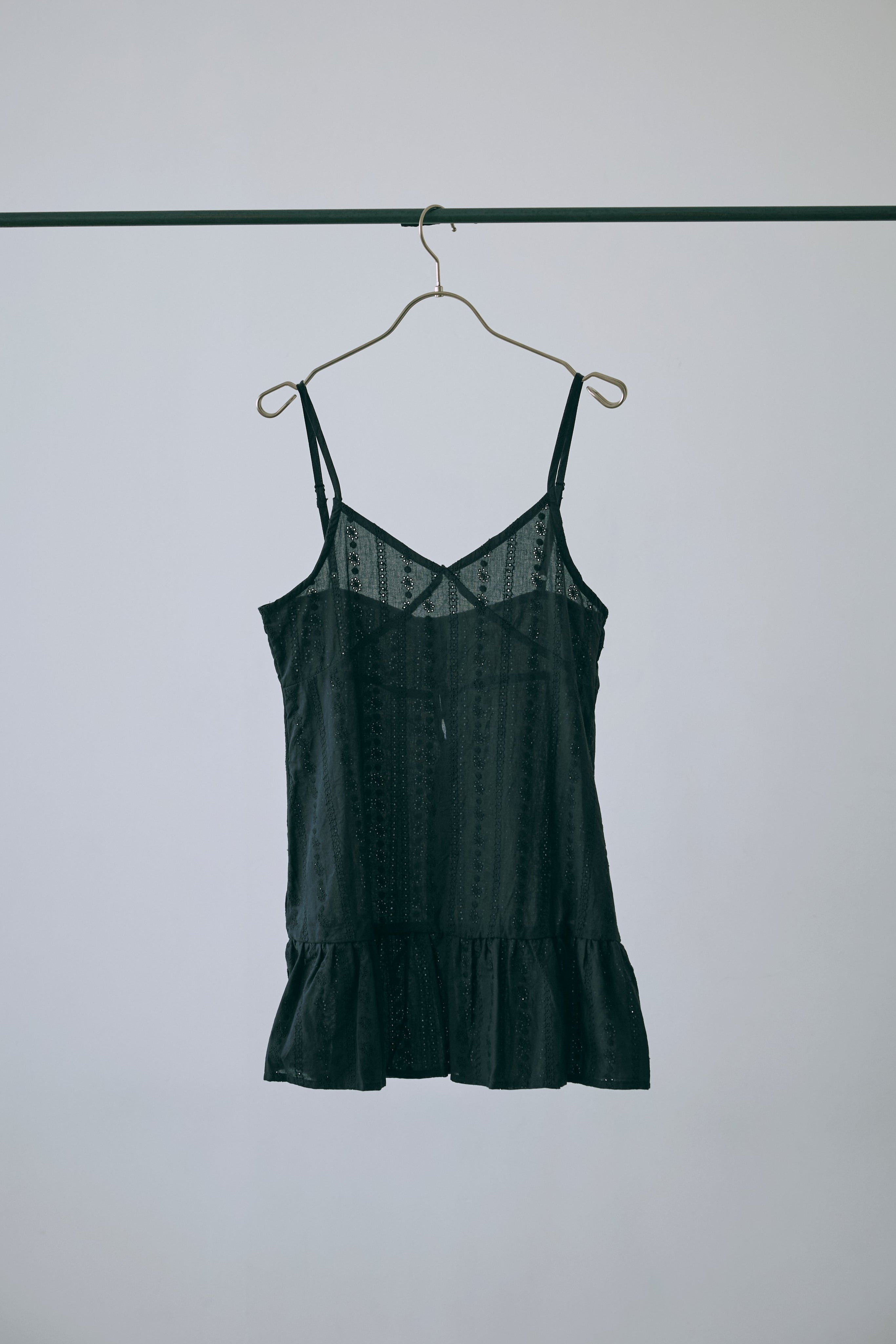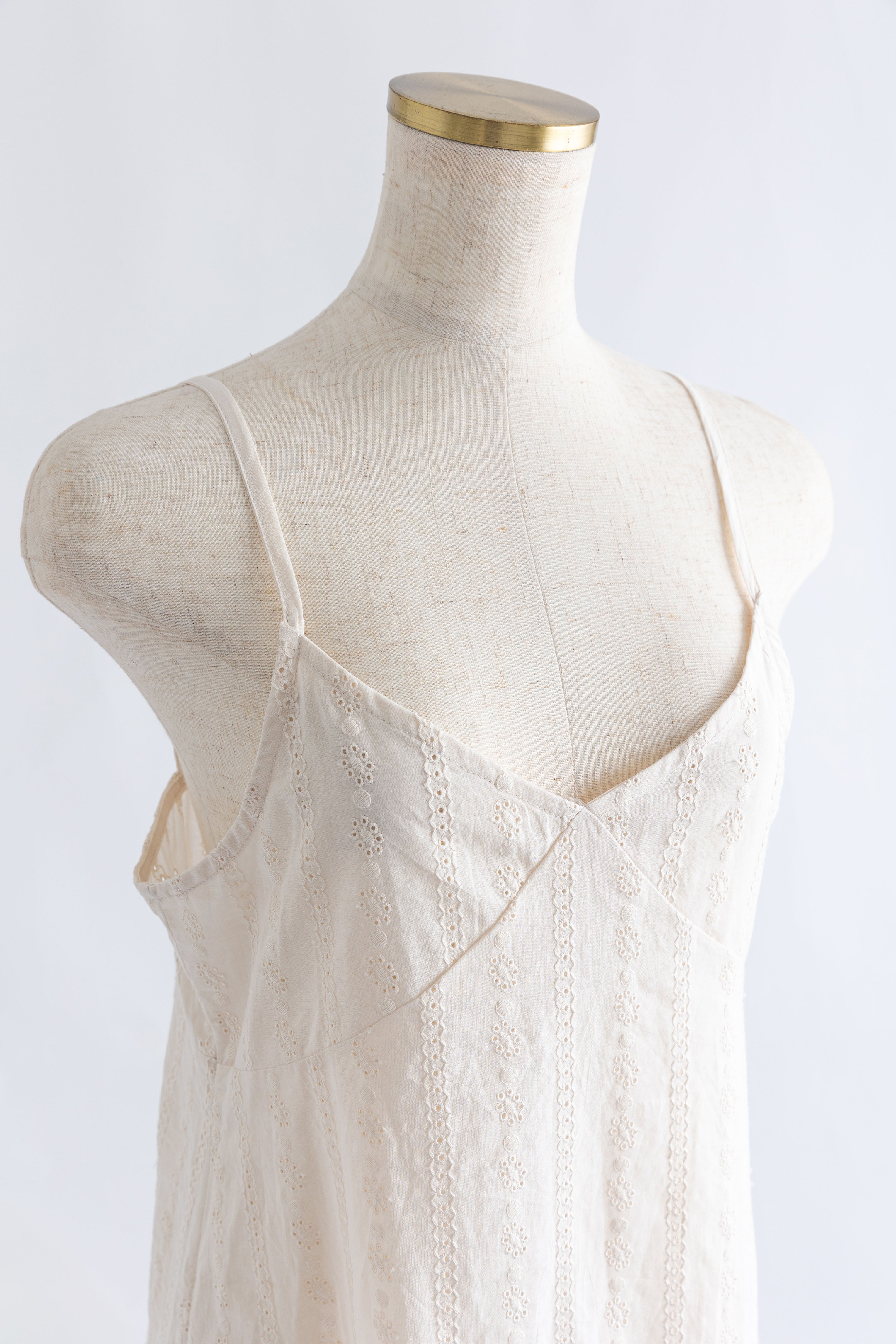 懐かしさを纏う、ヴィンテージレース風のレイヤードチュニック 【Material】 繊細な透け感と柔らかな肌ざわり。ほんのりくすんだ風合いがヴィンテージライクなムードを演出。レースの表情が暑い季節にぴったりです。 【Design】 長め丈のキャミチュニックは、重ね着を前提にデザインされた一枚。 クラシカルな雰囲気がありながら、どこか今っぽい抜け感も。ノスタルジーと洒落感があわさった、唯一無二の存在感です。 【Styling point】 Tシャツやタンクに重ねるだけで、コーデが一気にこなれた印象に。 肌寒い季節はジャケットやシャツを羽織って、通年で楽しめるのも嬉しいポイント。 カジュアルにもモードにも振れる、レイヤードの名脇役です。