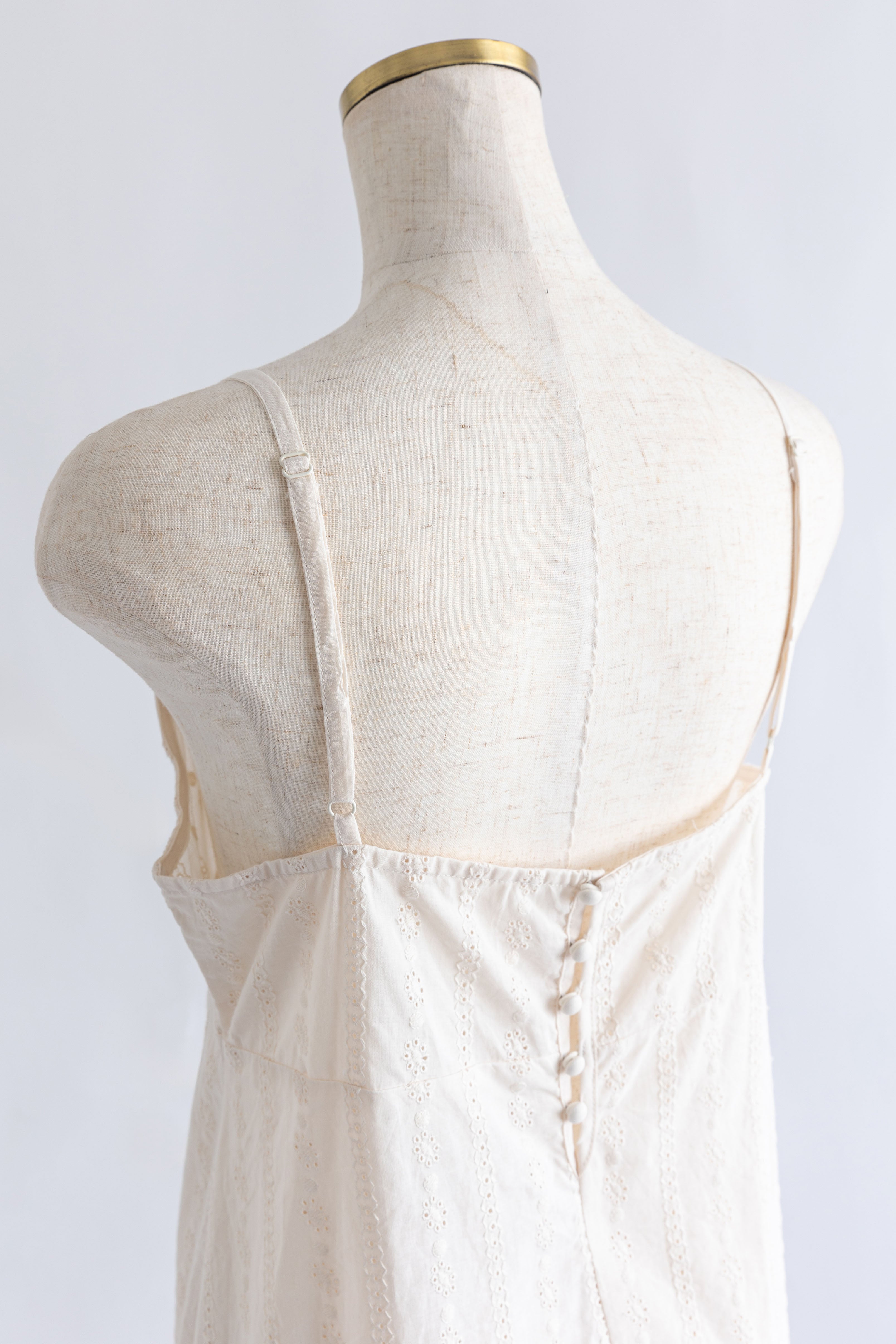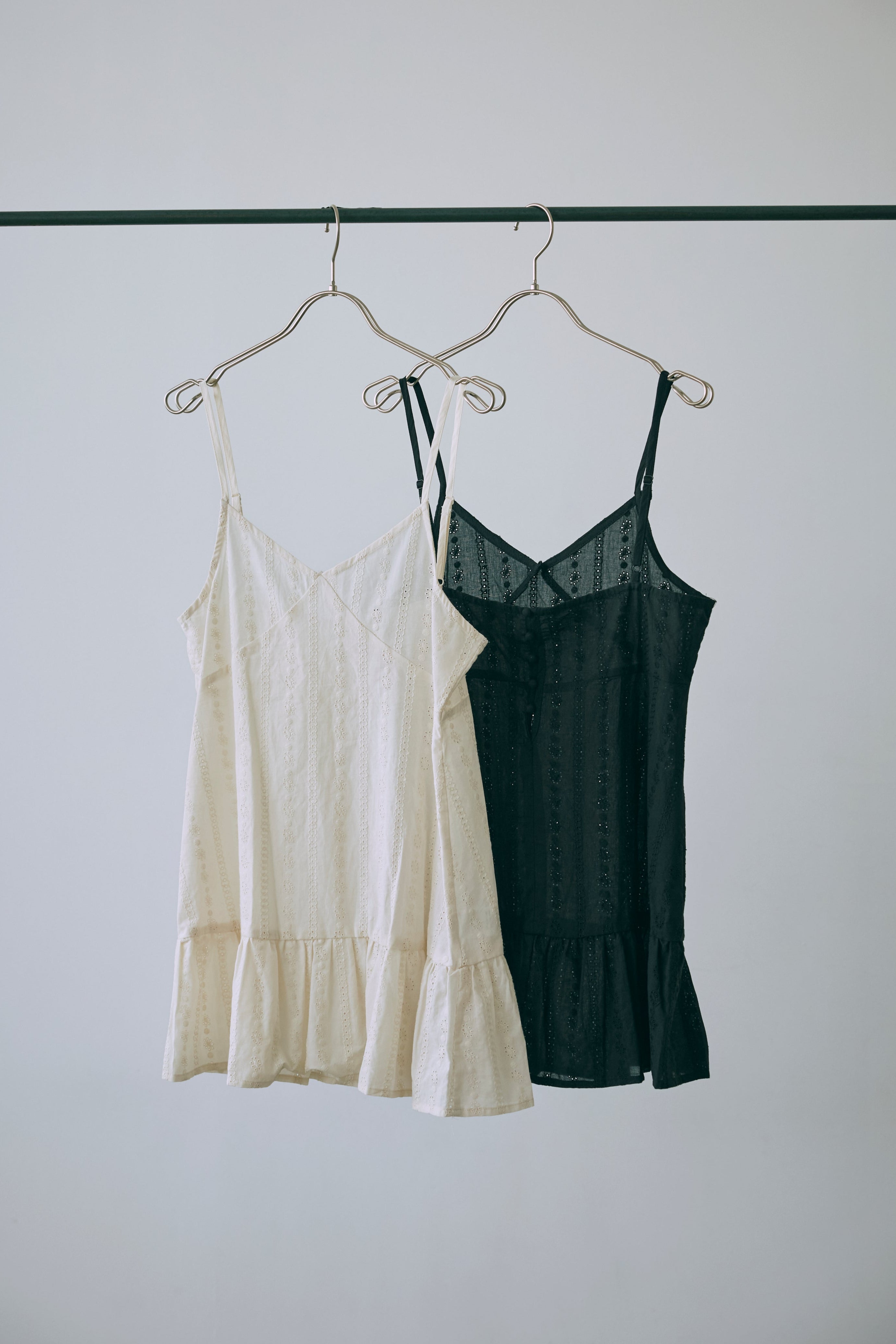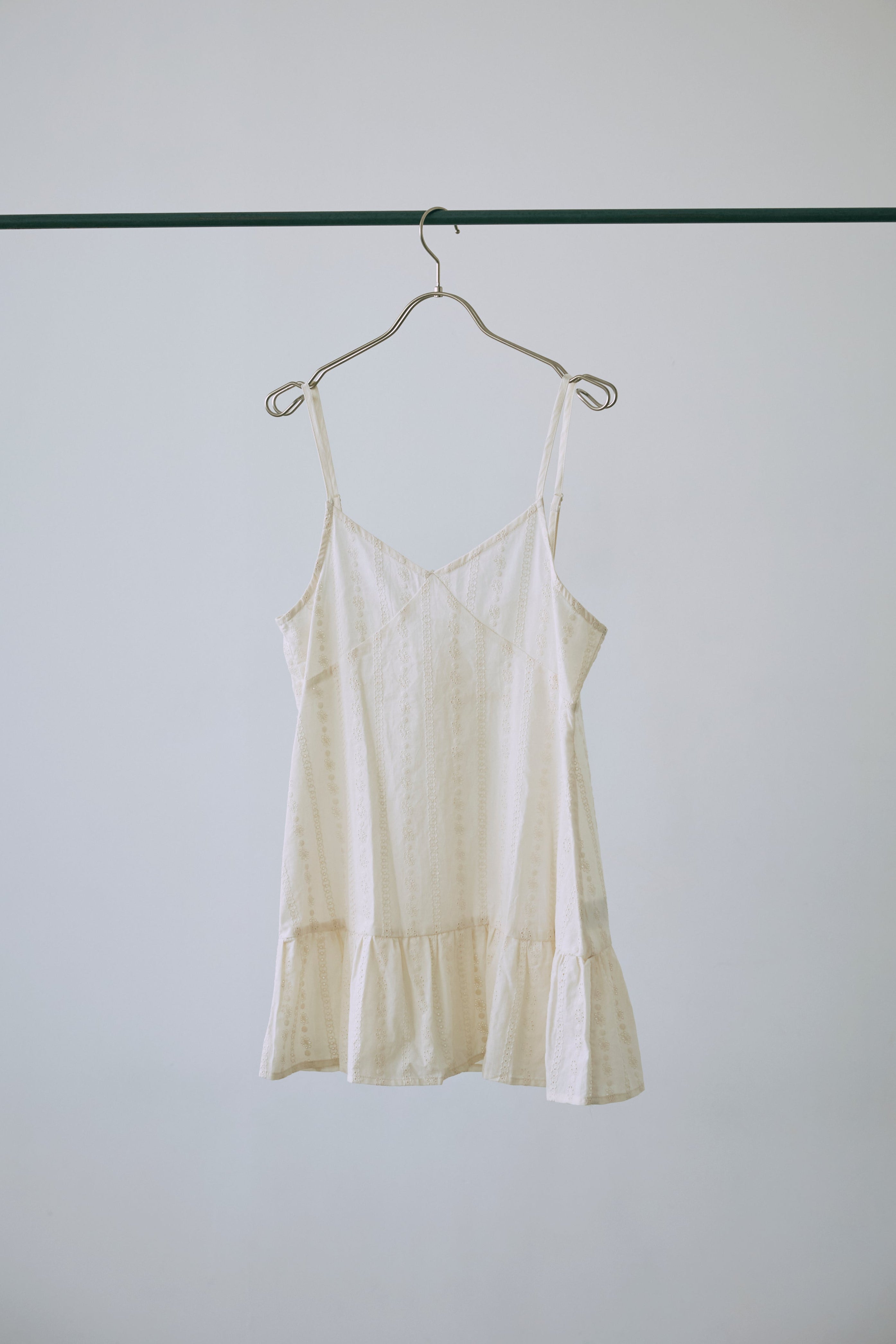 懐かしさを纏う、ヴィンテージレース風のレイヤードチュニック 【Material】 繊細な透け感と柔らかな肌ざわり。ほんのりくすんだ風合いがヴィンテージライクなムードを演出。レースの表情が暑い季節にぴったりです。 【Design】 長め丈のキャミチュニックは、重ね着を前提にデザインされた一枚。 クラシカルな雰囲気がありながら、どこか今っぽい抜け感も。ノスタルジーと洒落感があわさった、唯一無二の存在感です。 【Styling point】 Tシャツやタンクに重ねるだけで、コーデが一気にこなれた印象に。 肌寒い季節はジャケットやシャツを羽織って、通年で楽しめるのも嬉しいポイント。 カジュアルにもモードにも振れる、レイヤードの名脇役です。