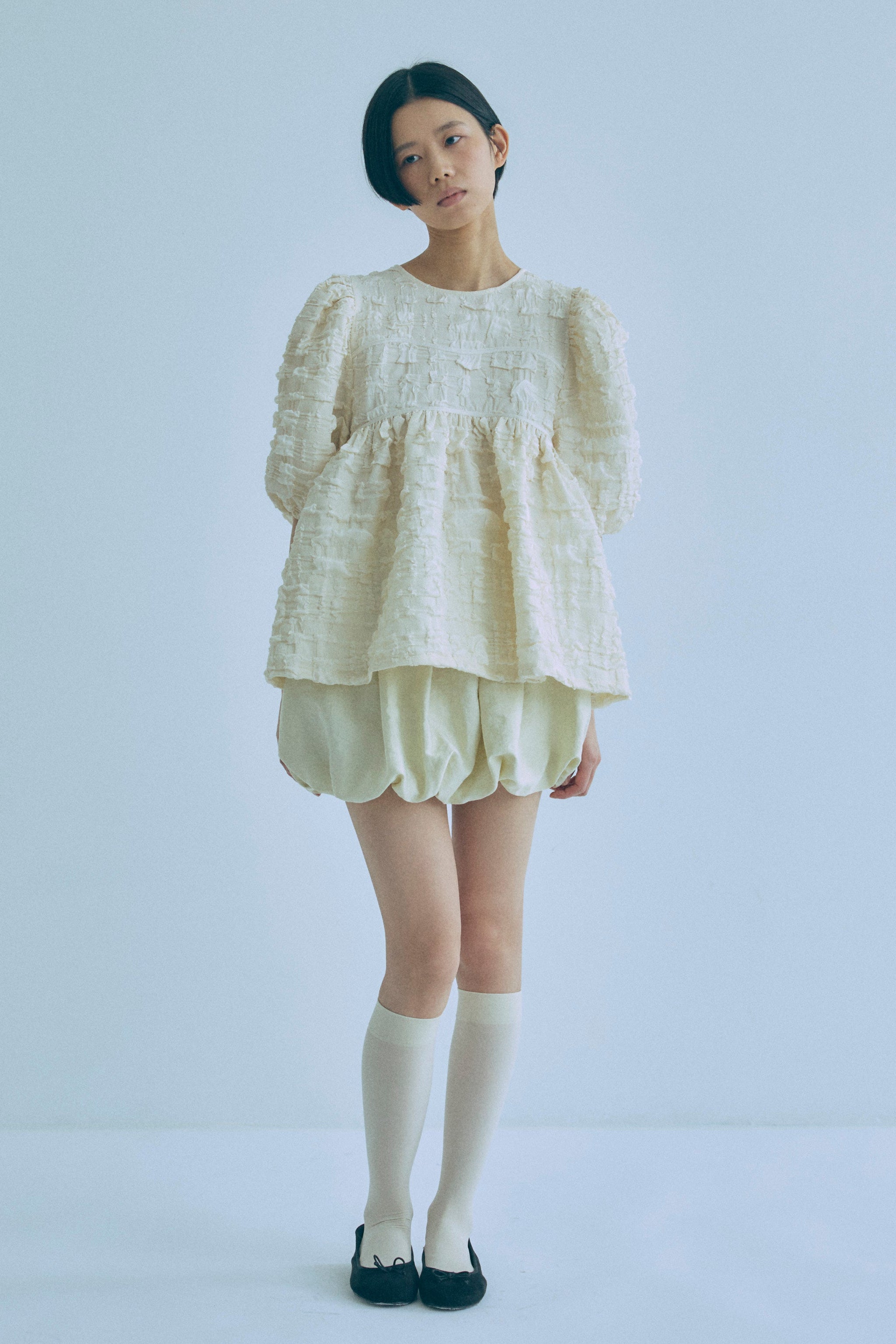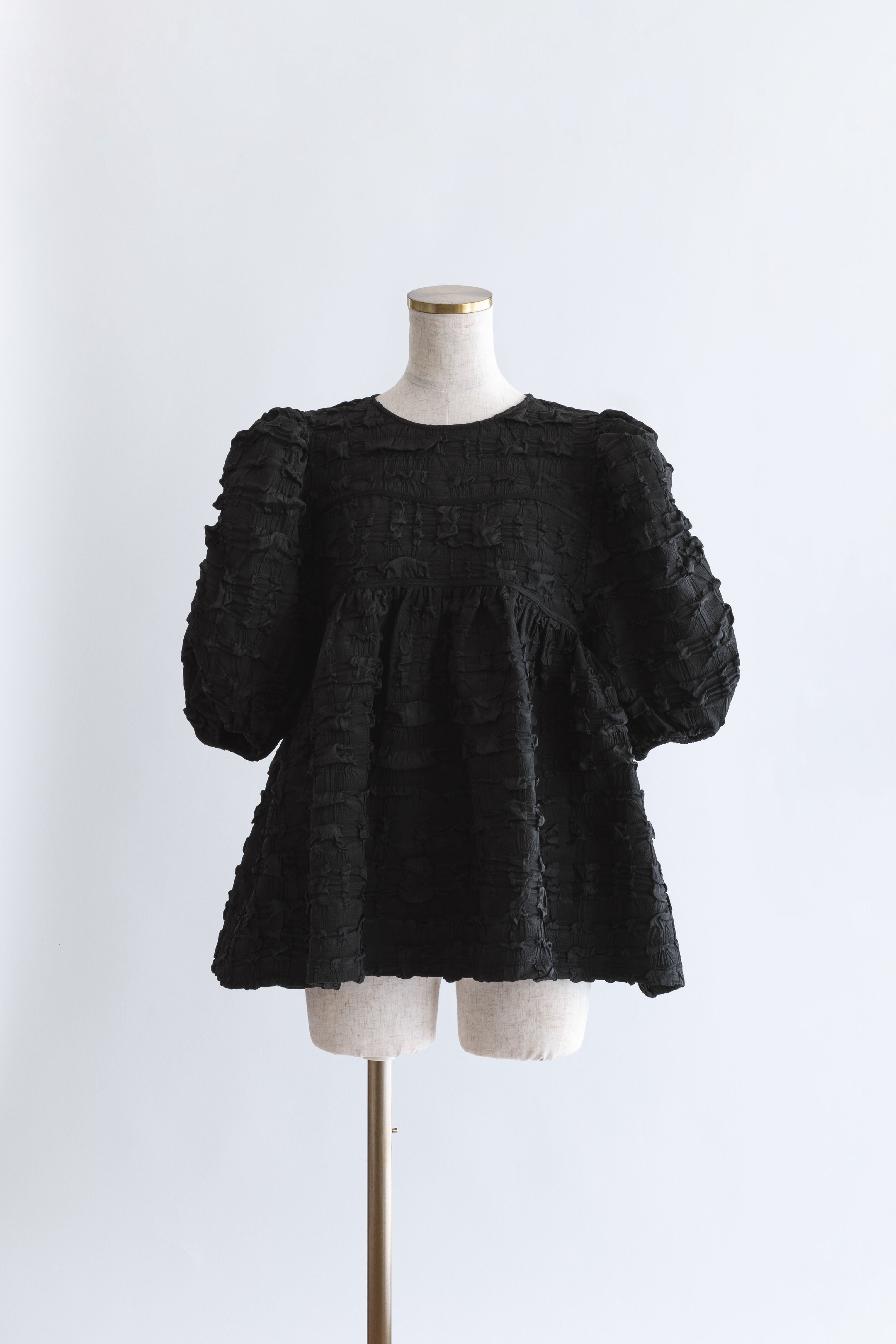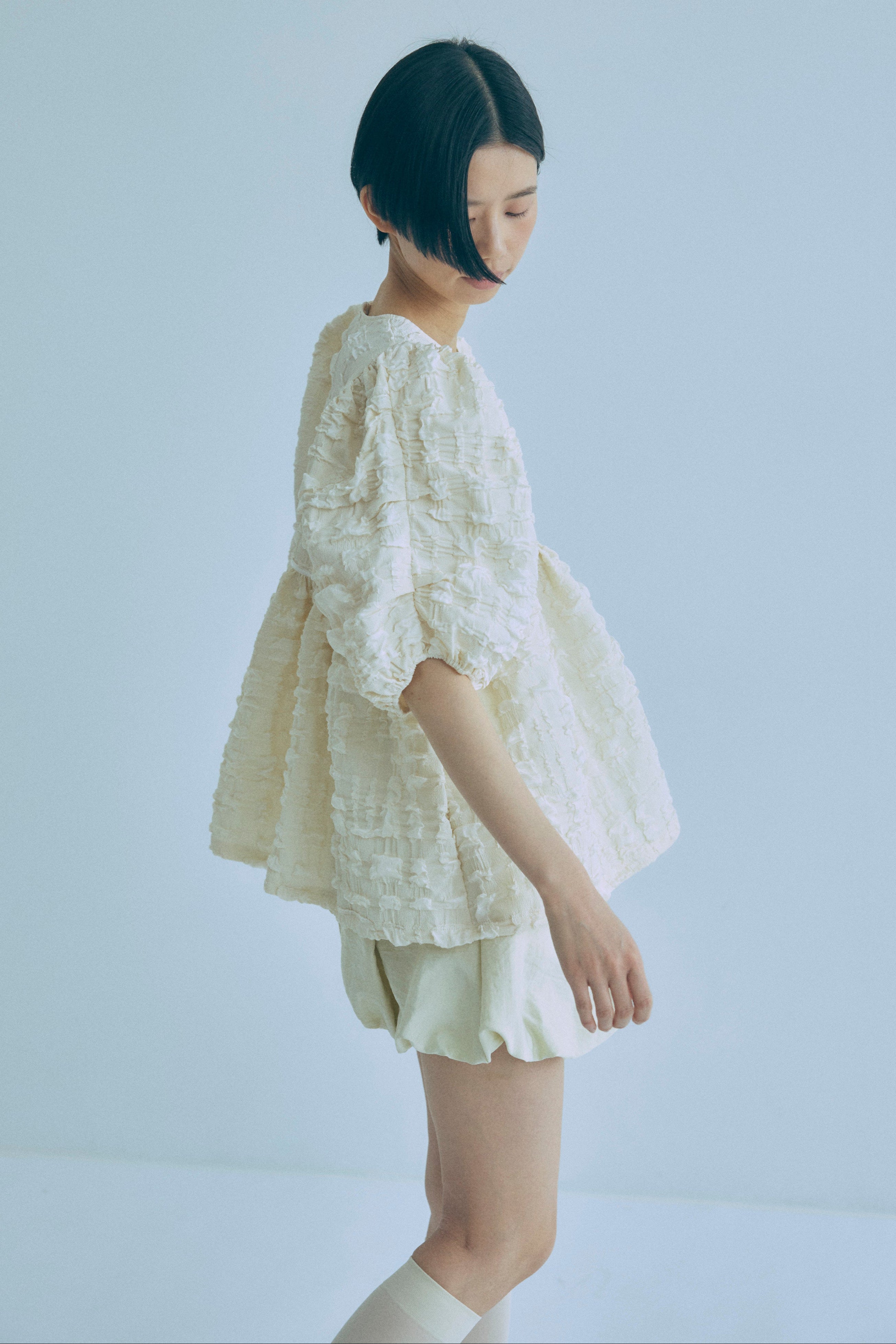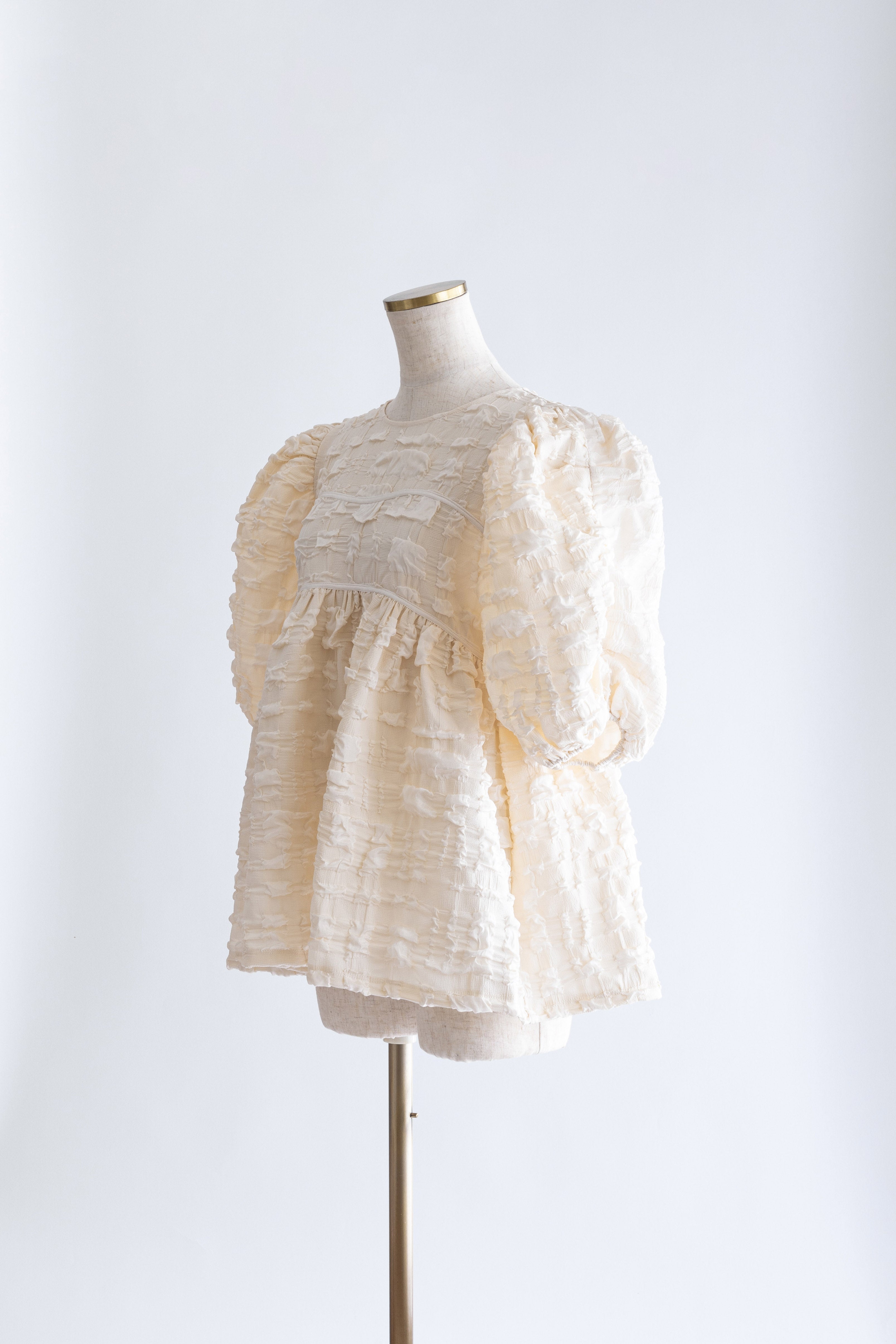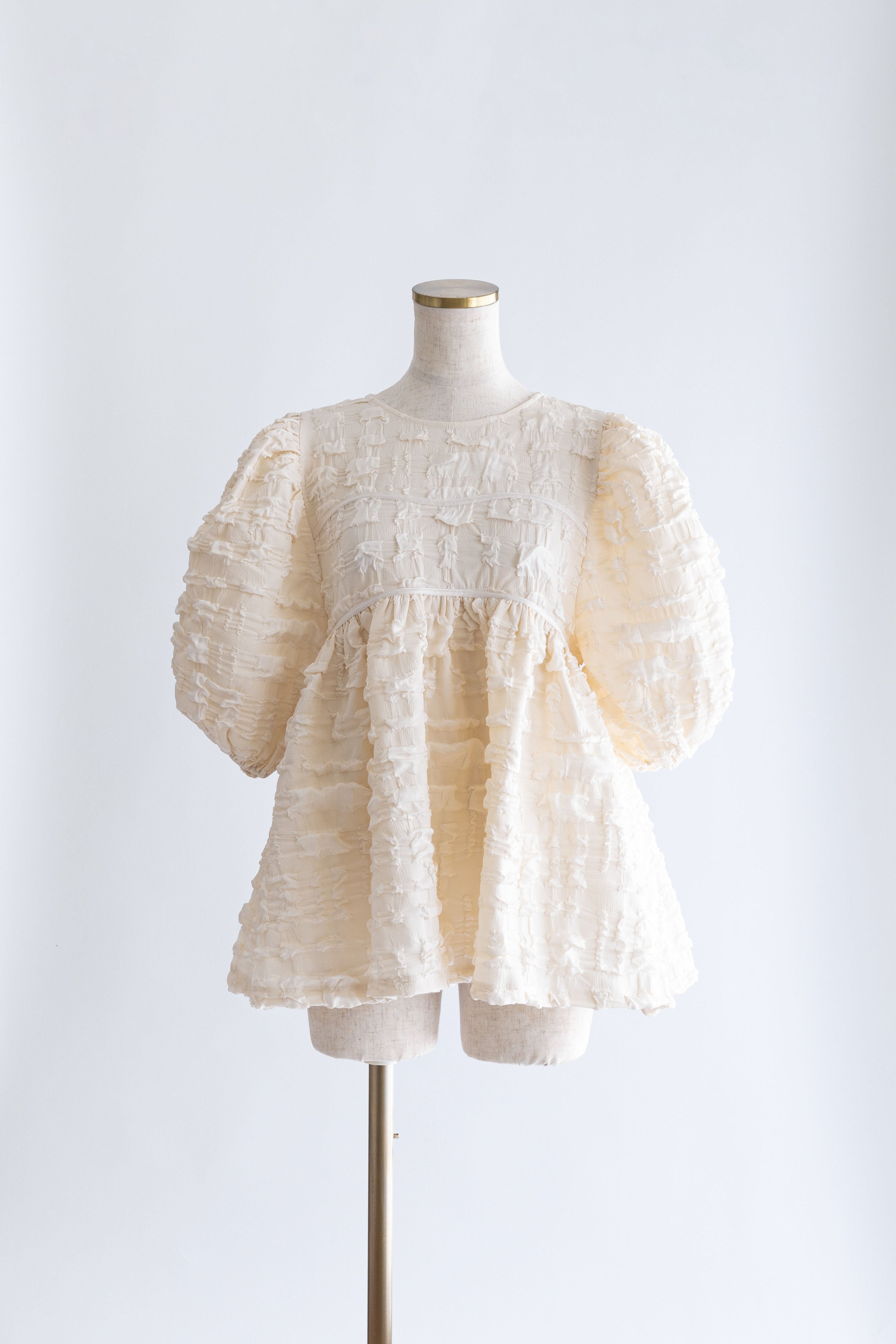パフ×ギャザーが映える、華やかジャガードトップス 【Material】 程よいハリ感と柔らかさを併せ持つジャガード素材を使用。軽やかで動きやすく、パフスリーブやギャザーの立体感をきれいにキープしてくれます。見た目以上にストレスフリーな着心地もポイントです。 【Design】 パフスリーブとギャザーを組み合わせ、ふんわりと丸みのあるシルエットに仕上げた一着。表情のあるジャガード素材が存在感を放ち、シンプルなスタイリングでも自然と華やかさをプラスします。一枚で着映えする、主役トップスです。 【Styling point】 デニムと合わせてカジュアルダウンした着こなしはもちろん、スカートと合わせればお出かけにも対応できるスタイルに。ラフなボトムスと合わせても女性らしさを添えてくれるので、デイリーからちょっとしたシーンまで幅広く活躍します。