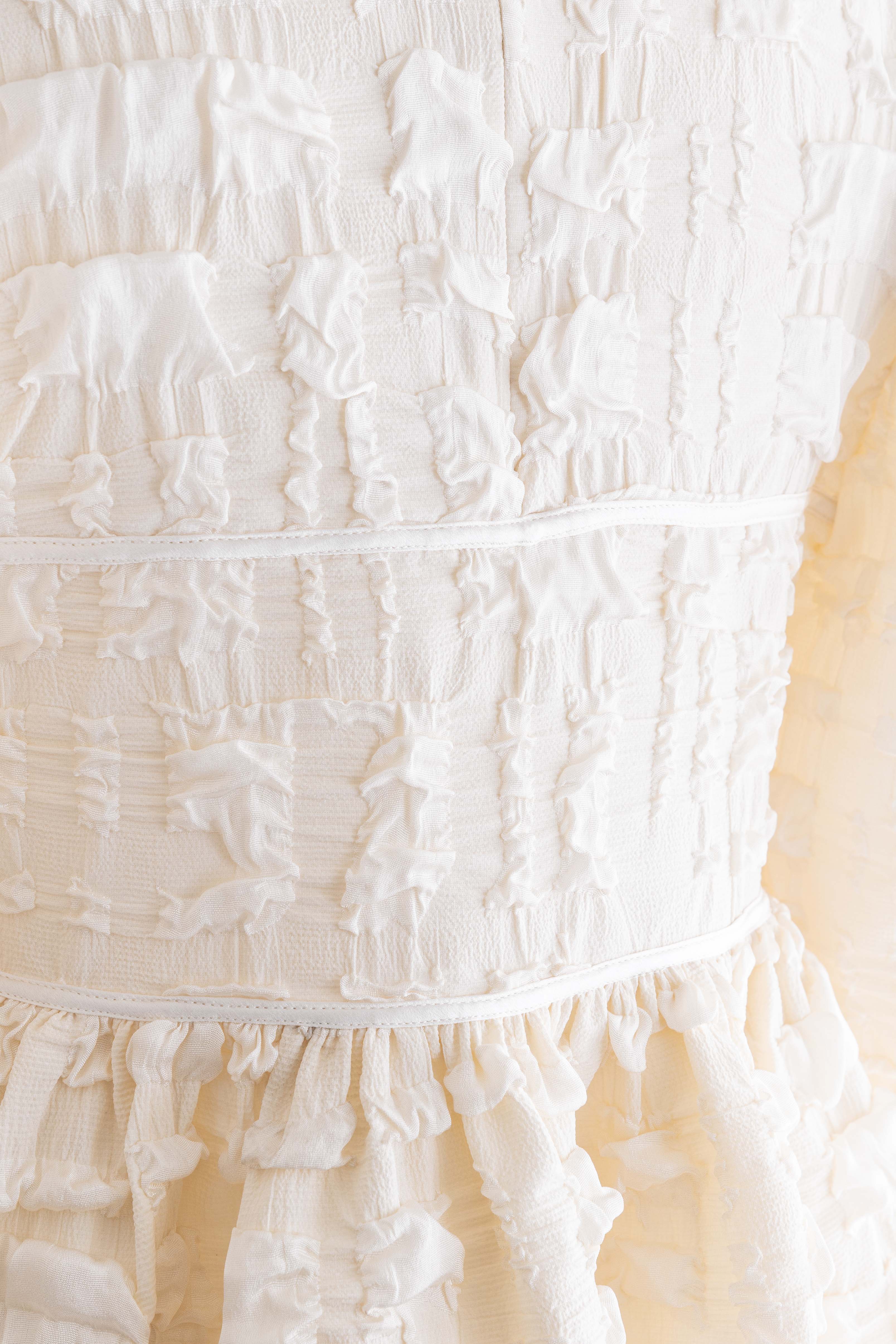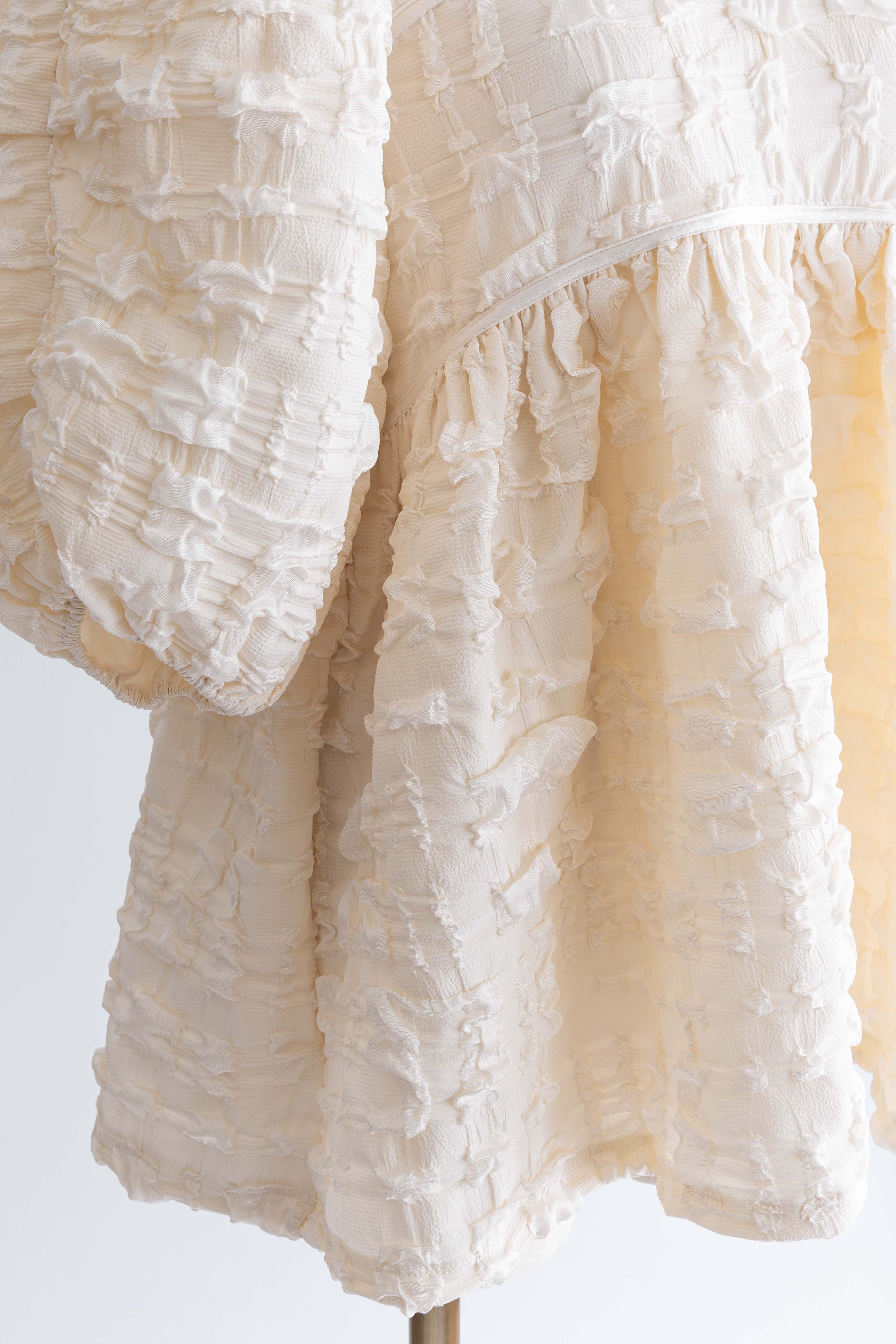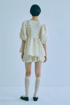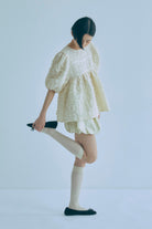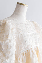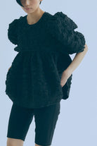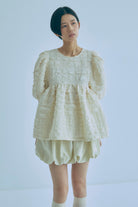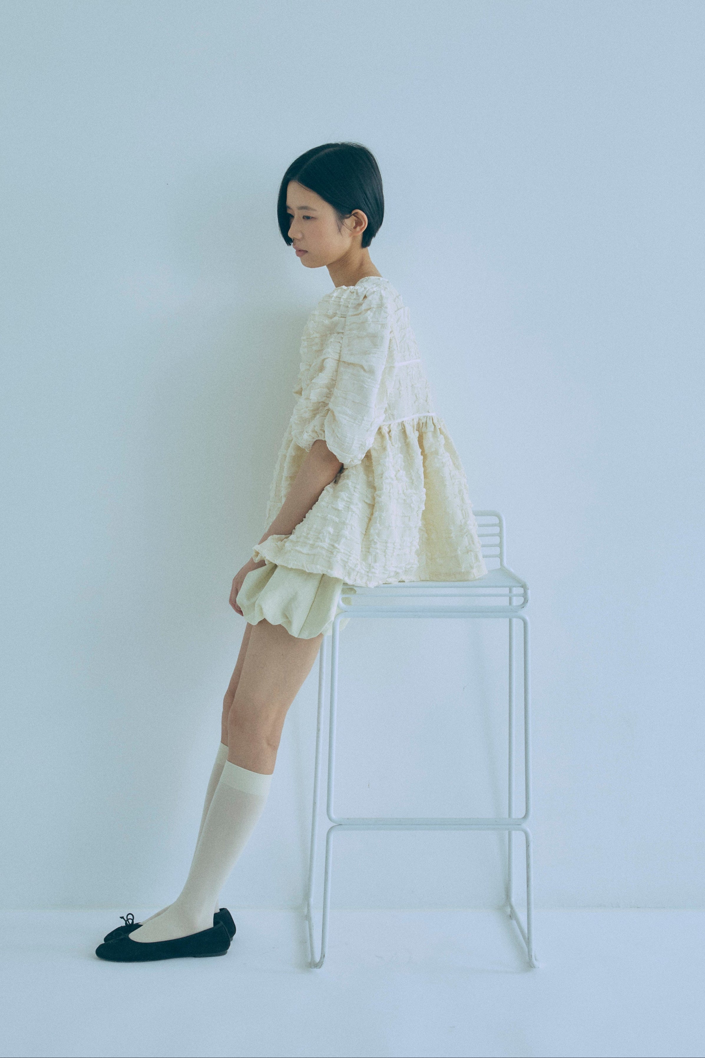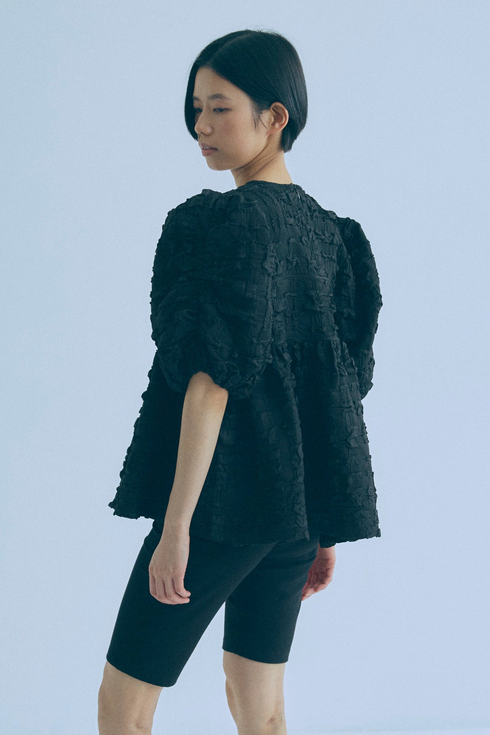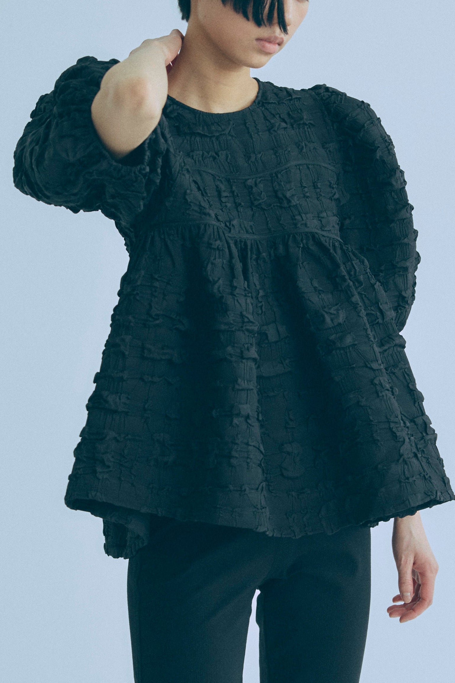 パフ×ギャザーが映える、華やかジャガードトップス 【Material】 程よいハリ感と柔らかさを併せ持つジャガード素材を使用。軽やかで動きやすく、パフスリーブやギャザーの立体感をきれいにキープしてくれます。見た目以上にストレスフリーな着心地もポイントです。 【Design】 パフスリーブとギャザーを組み合わせ、ふんわりと丸みのあるシルエットに仕上げた一着。表情のあるジャガード素材が存在感を放ち、シンプルなスタイリングでも自然と華やかさをプラスします。一枚で着映えする、主役トップスです。 【Styling point】 デニムと合わせてカジュアルダウンした着こなしはもちろん、スカートと合わせればお出かけにも対応できるスタイルに。ラフなボトムスと合わせても女性らしさを添えてくれるので、デイリーからちょっとしたシーンまで幅広く活躍します。
