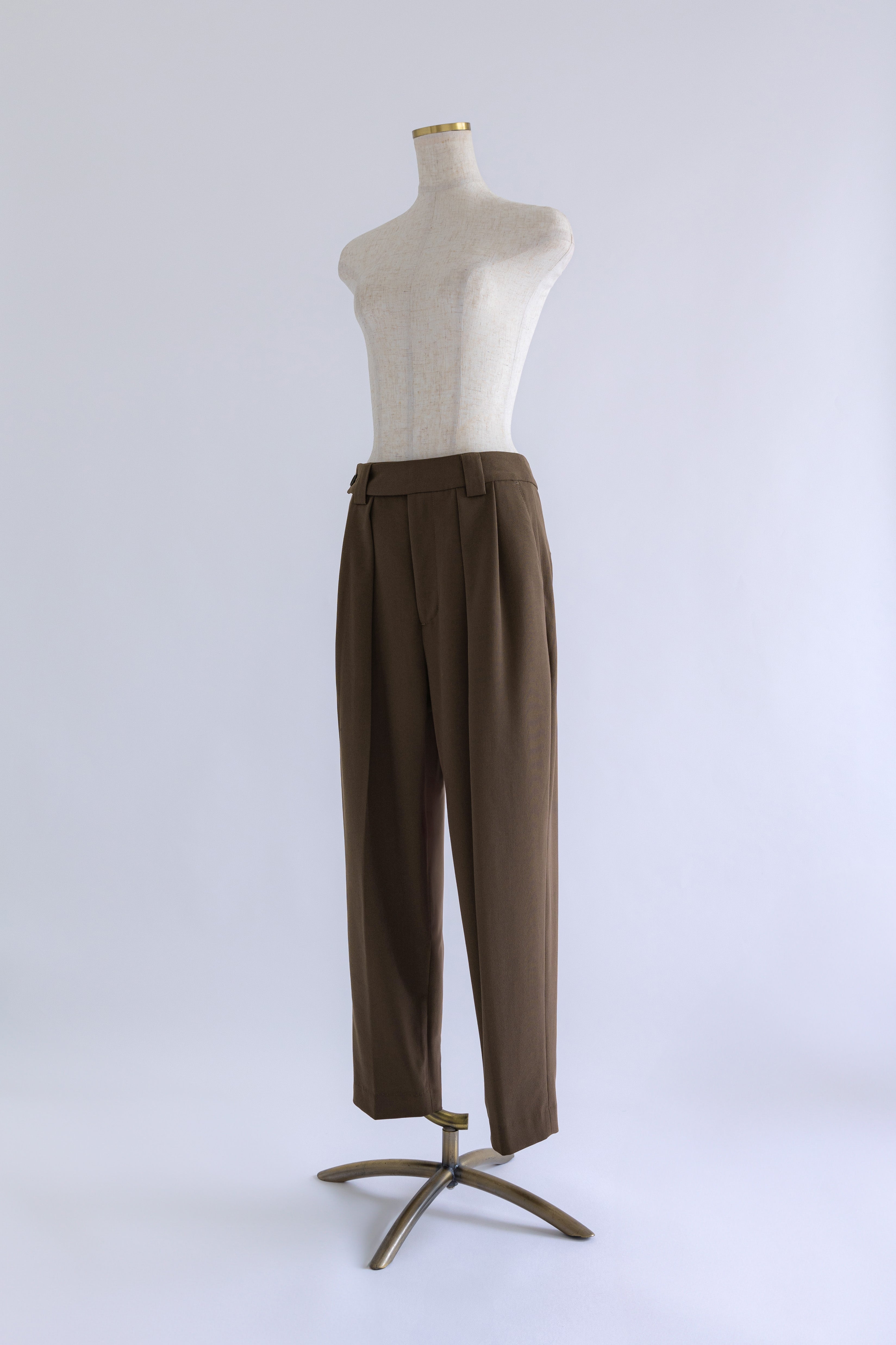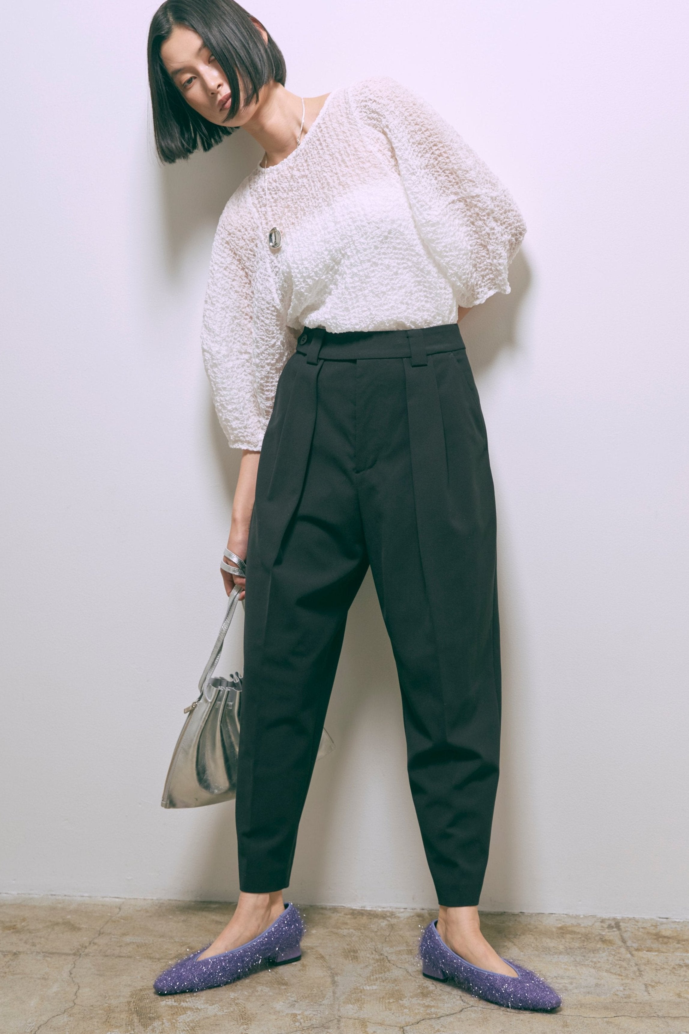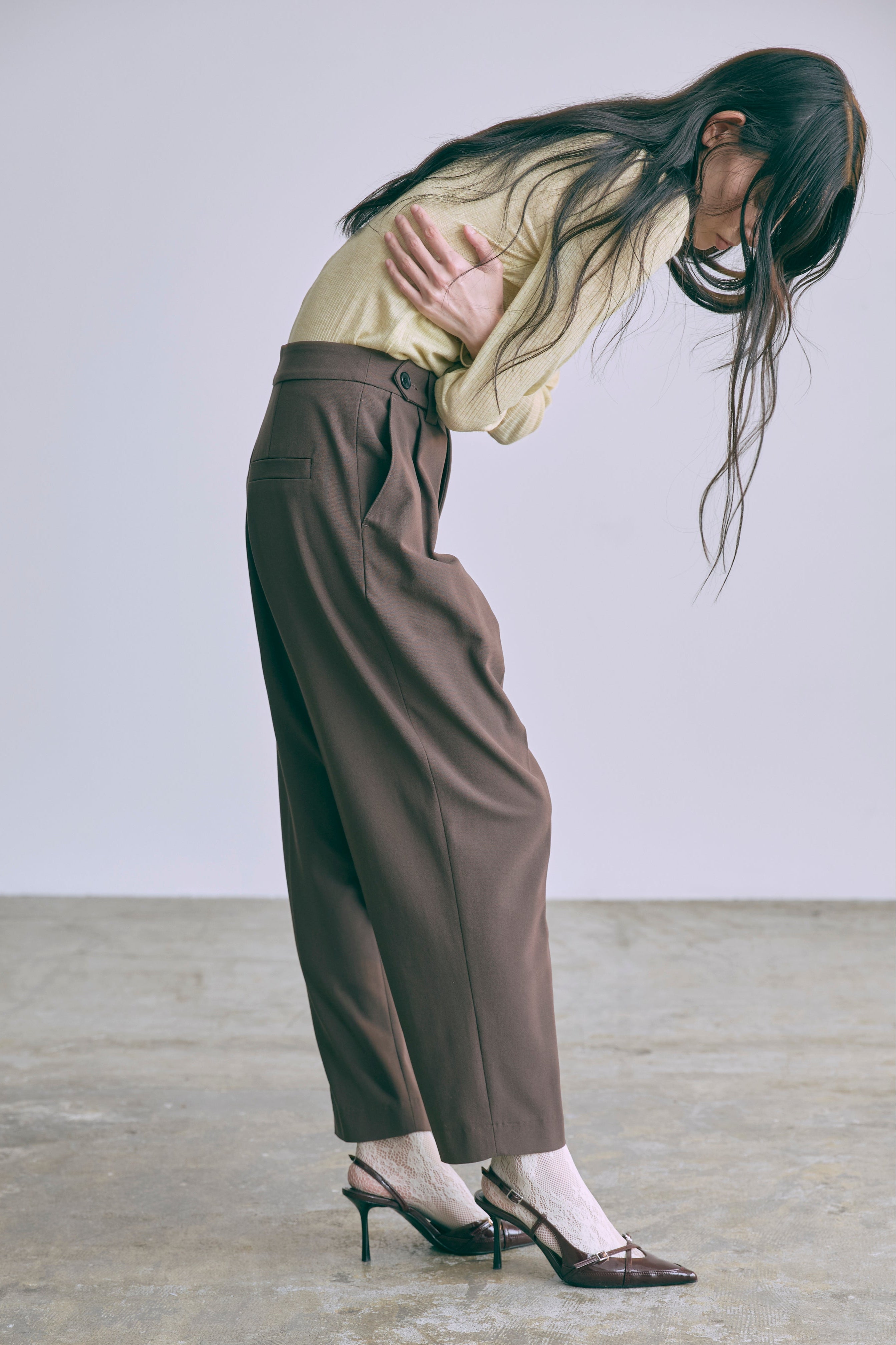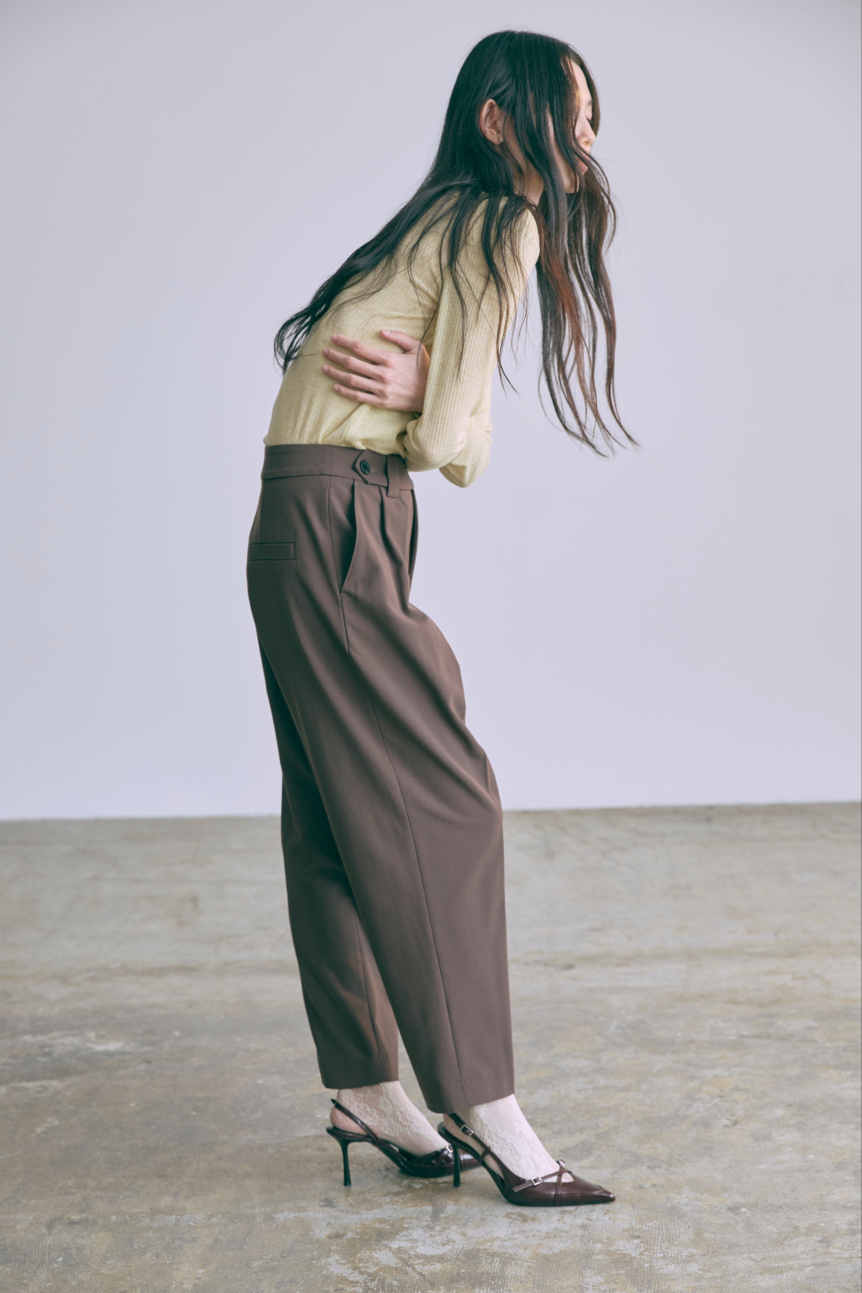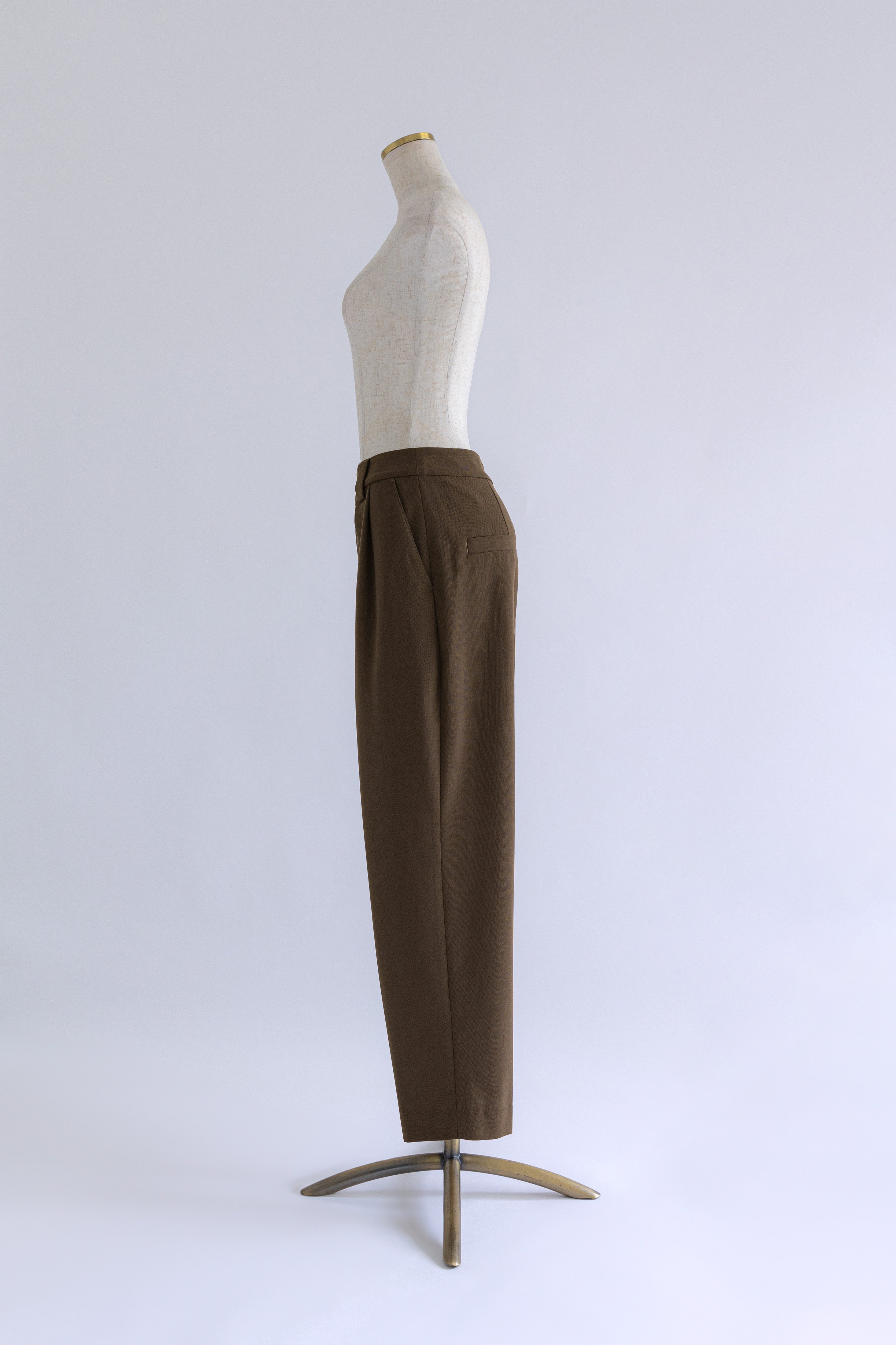 タック入りでリラックスしたシルエットが魅力。きれいめとリラクシー感を両立するトレンドの大本命パンツ バレルパンツ 【Material】 さらっとした肌触りで、夏の残暑にも快適に着られる生地を使用しています。肌離れが良く、シーズンを問わず心地よくお召しいただける素材です。 【Design】 ウエストにベルトデザインを取り入れ、丸みのある樽(バレル)型のリラックスしたシルエットが特徴です。タックがしっかりと入り、ハイウエストから裾に向かって緩やかに細くなるテーパードデザインが、オンオフ問わずさまざまなシーンで活躍します。 【Styling point】 タックインでスッキリとしたスタイルを演出し、タックアウトでリラクシーな雰囲気を楽しめます。タックインすると、よりスタイルアップが期待できます。
