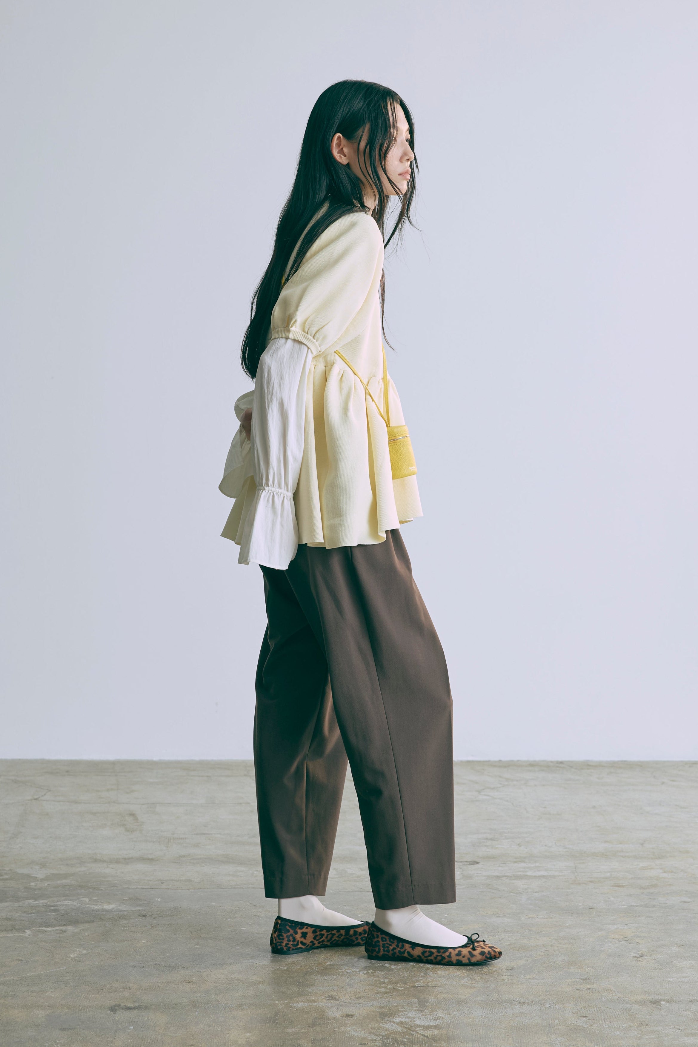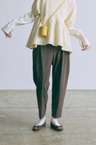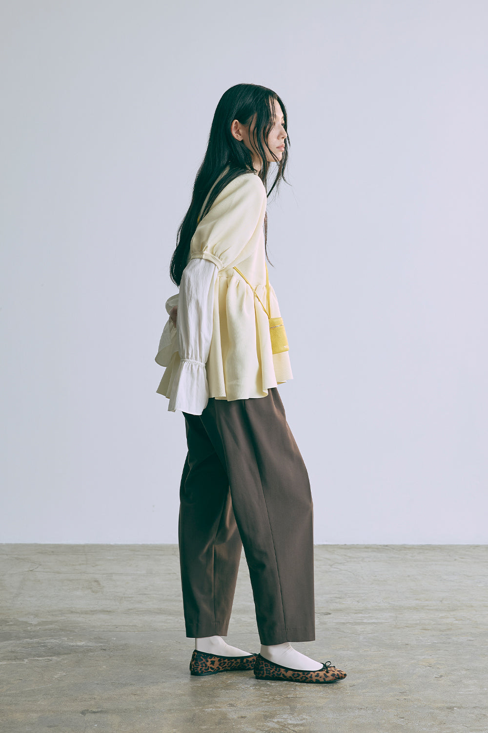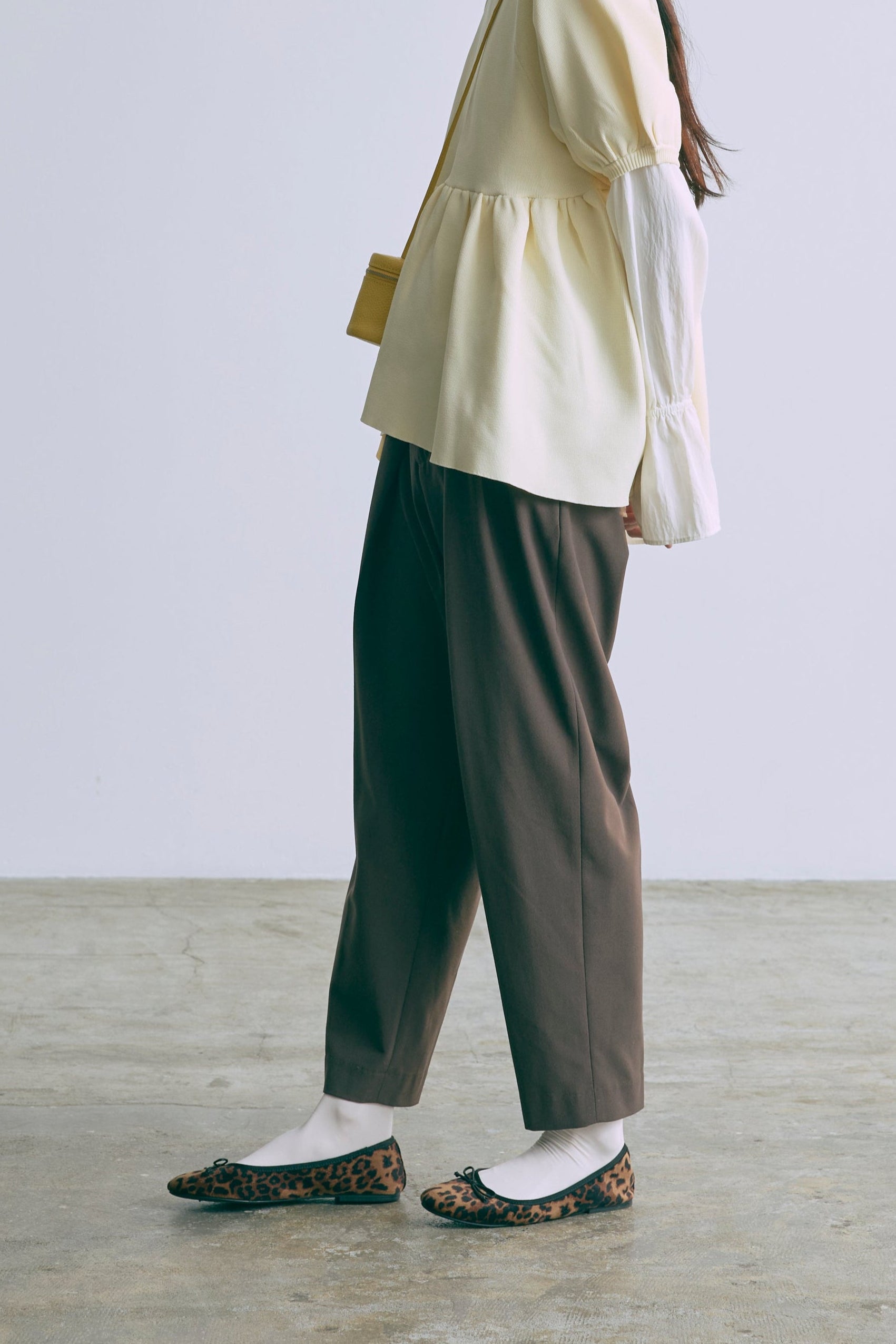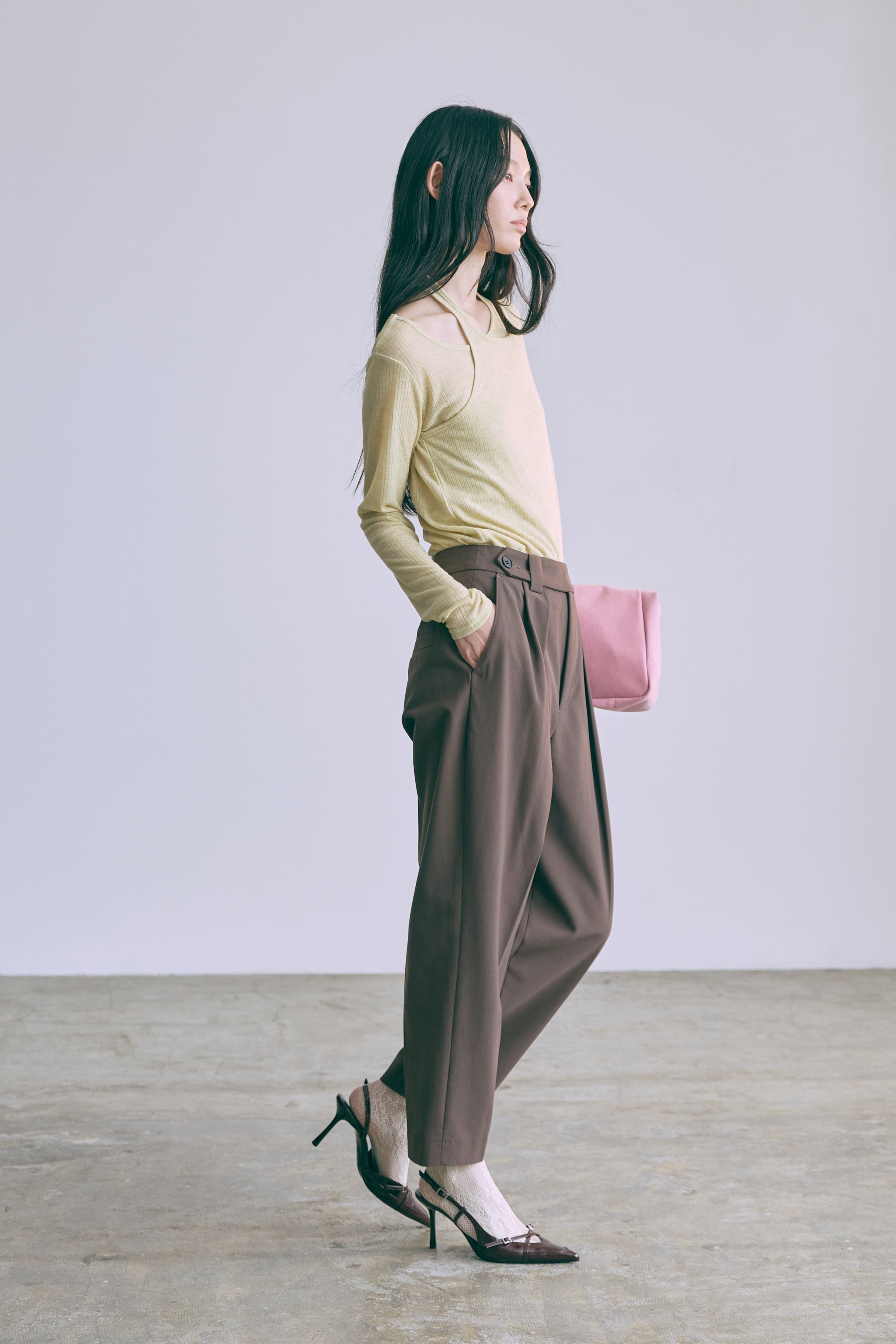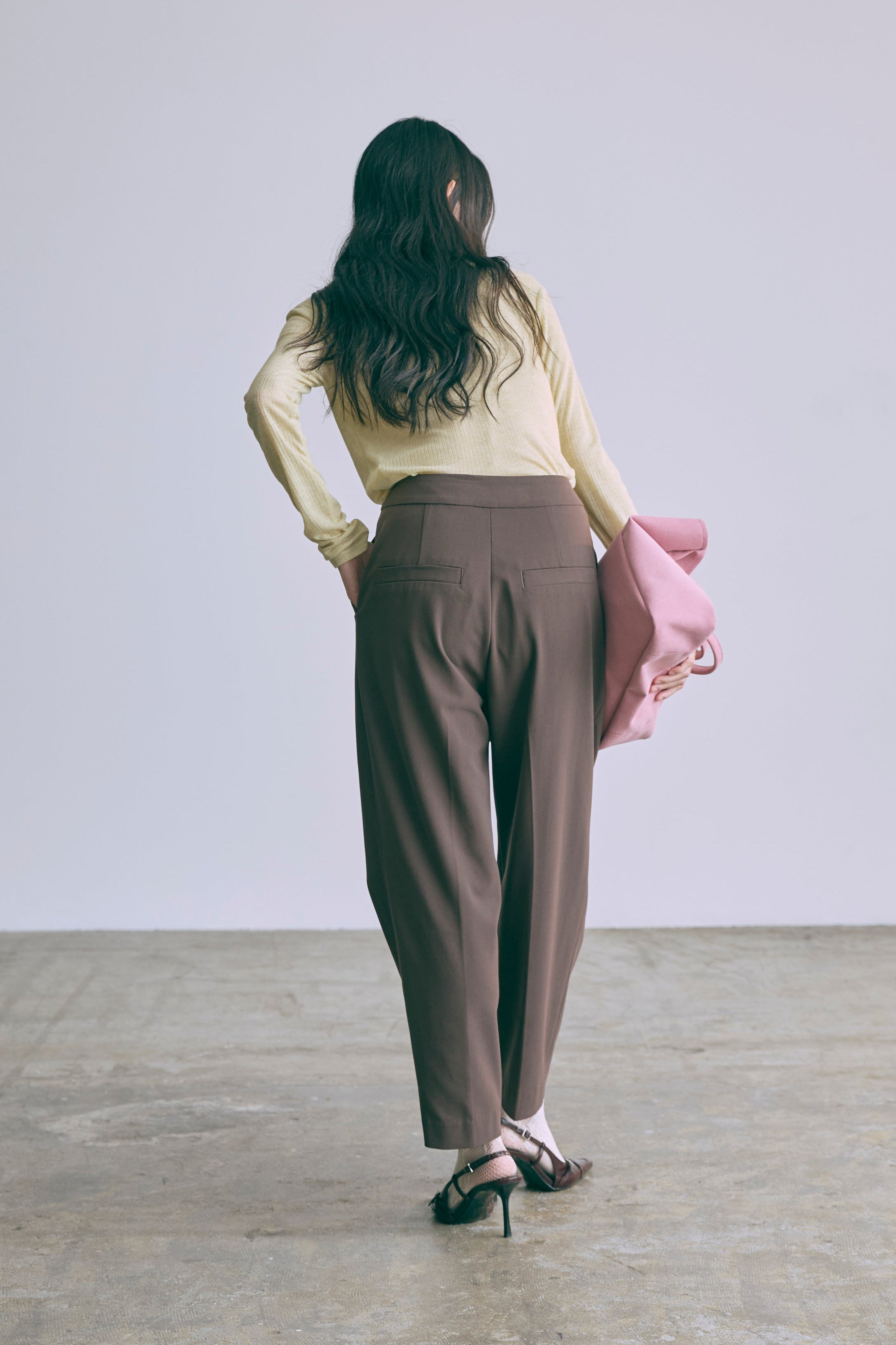 タック入りでリラックスしたシルエットが魅力。きれいめとリラクシー感を両立するトレンドの大本命パンツ バレルパンツ 【Material】 さらっとした肌触りで、夏の残暑にも快適に着られる生地を使用しています。肌離れが良く、シーズンを問わず心地よくお召しいただける素材です。 【Design】 ウエストにベルトデザインを取り入れ、丸みのある樽(バレル)型のリラックスしたシルエットが特徴です。タックがしっかりと入り、ハイウエストから裾に向かって緩やかに細くなるテーパードデザインが、オンオフ問わずさまざまなシーンで活躍します。 【Styling point】 タックインでスッキリとしたスタイルを演出し、タックアウトでリラクシーな雰囲気を楽しめます。タックインすると、よりスタイルアップが期待できます。