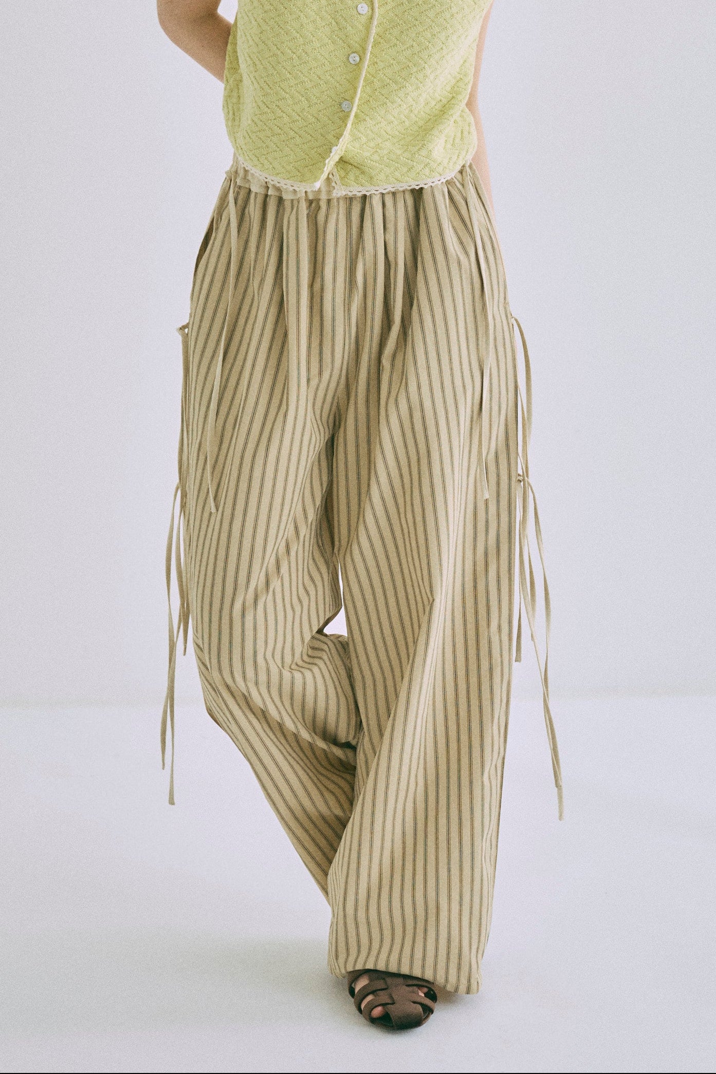 サイドリボン×ラインディテールが映える、大人ストライプのイージーパンツ 【Material】 ほどよいハリ感と軽やかさを兼ね備えた素材を使用。晩夏から秋にかけて長く活躍する、落ち着いたトーンのストライプ柄です。 【Design】 サイドのリボンは結び方で表情を変えられ、自分らしいアレンジが楽しめるデザイン。リボンの締め具合によって配色ラインの見え方が変化し、さりげないアクセントに。ウエストはオールゴム仕様で、リラックス感のあるはき心地も魅力です。 【Styling point】 存在感のあるパンツなので、トップスはシンプルな無地アイテムがおすすめ。配色ラインのカラーをトップスや小物にリンクさせると、全体に統一感が生まれ、こなれた印象に仕上がります。