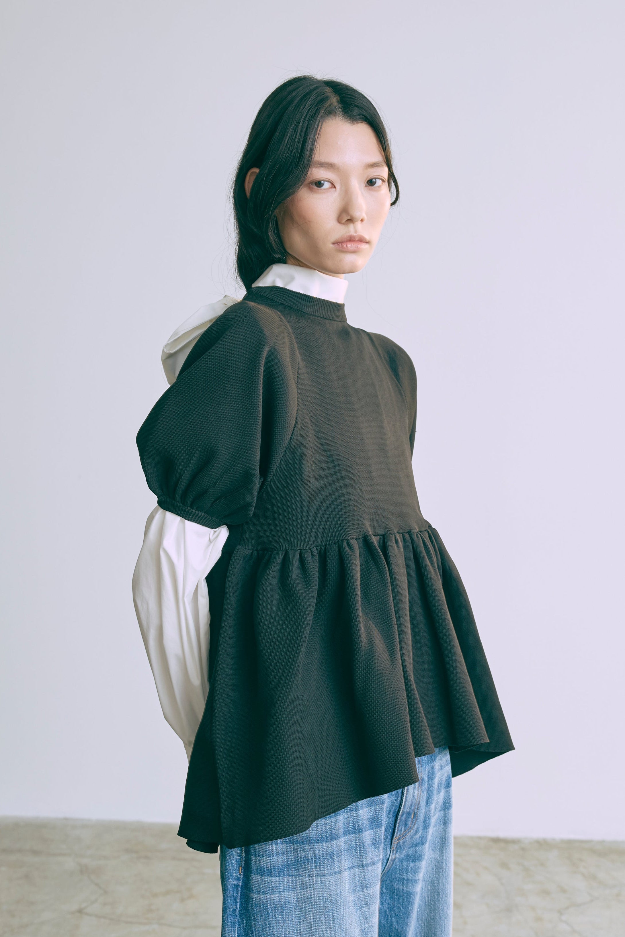 程良い甘さのあるデザインのニットトップス 【Material】 軽やかで弾力感のあるスポンディッシュな質感が特長のニット素材を使用。立体感が生まれやすい糸を採用し、ふんわりとした美しいシルエットを実現しました。 【Design】 ウエスト部分にギャザーを施し、女性らしい華やかさをプラス。袖はボリューム感のあるパフスリーブに仕上げ、上品な甘さを演出しています。ギャザーの位置を高めに設定し、裾には前後差をつけることで動きのあるシルエットに。体のラインを拾いにくいデザインなので、どなたにも着やすいアイテムです。 【Styling point】 肌寒い季節には、ブラウスやカットソーをインナーに合わせたレイヤードスタイルが最適。ミニ丈のボトムスとも好相性で、EN NEUMEらしいミニマルで洗練されたスタイルをお楽しみいただけます。