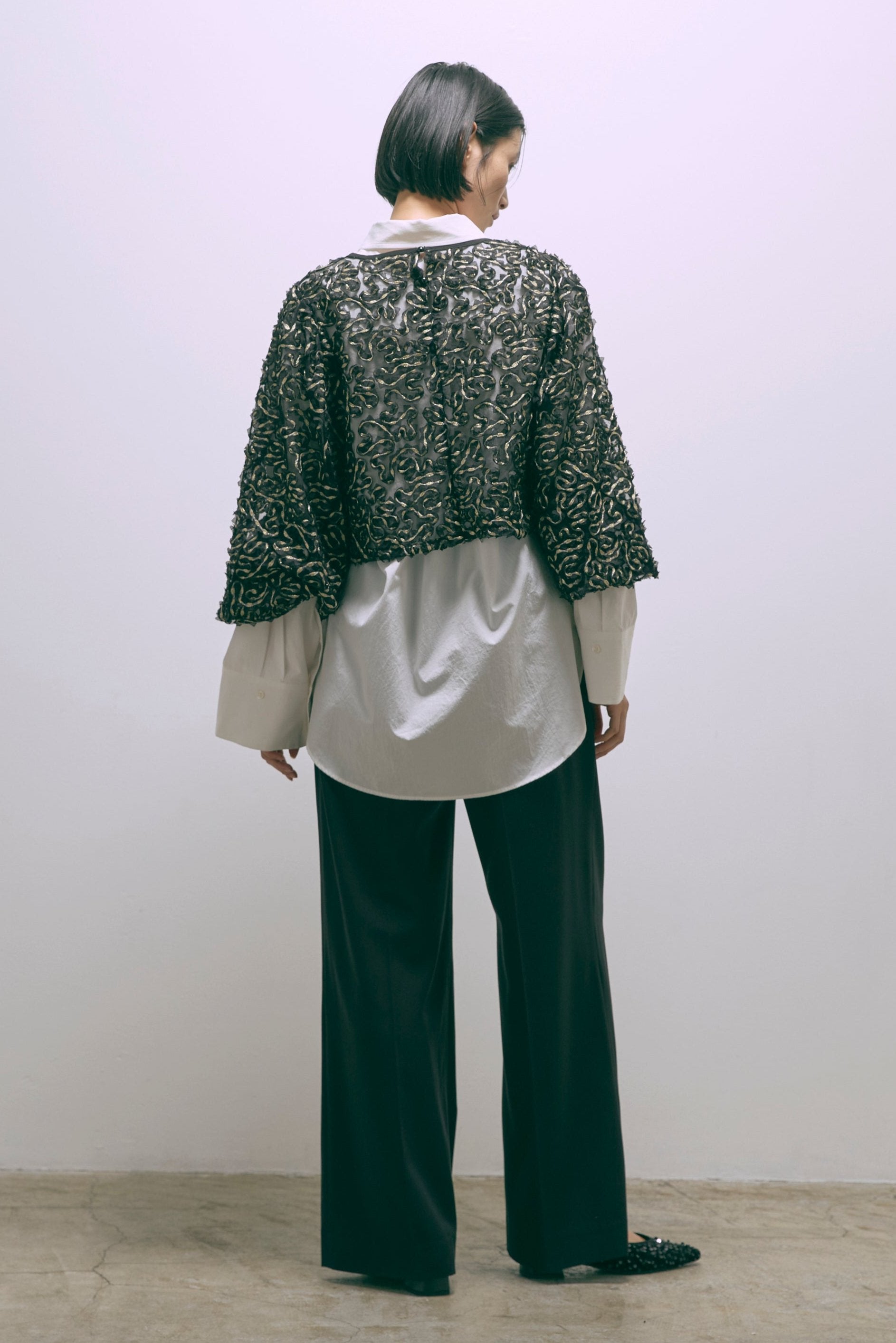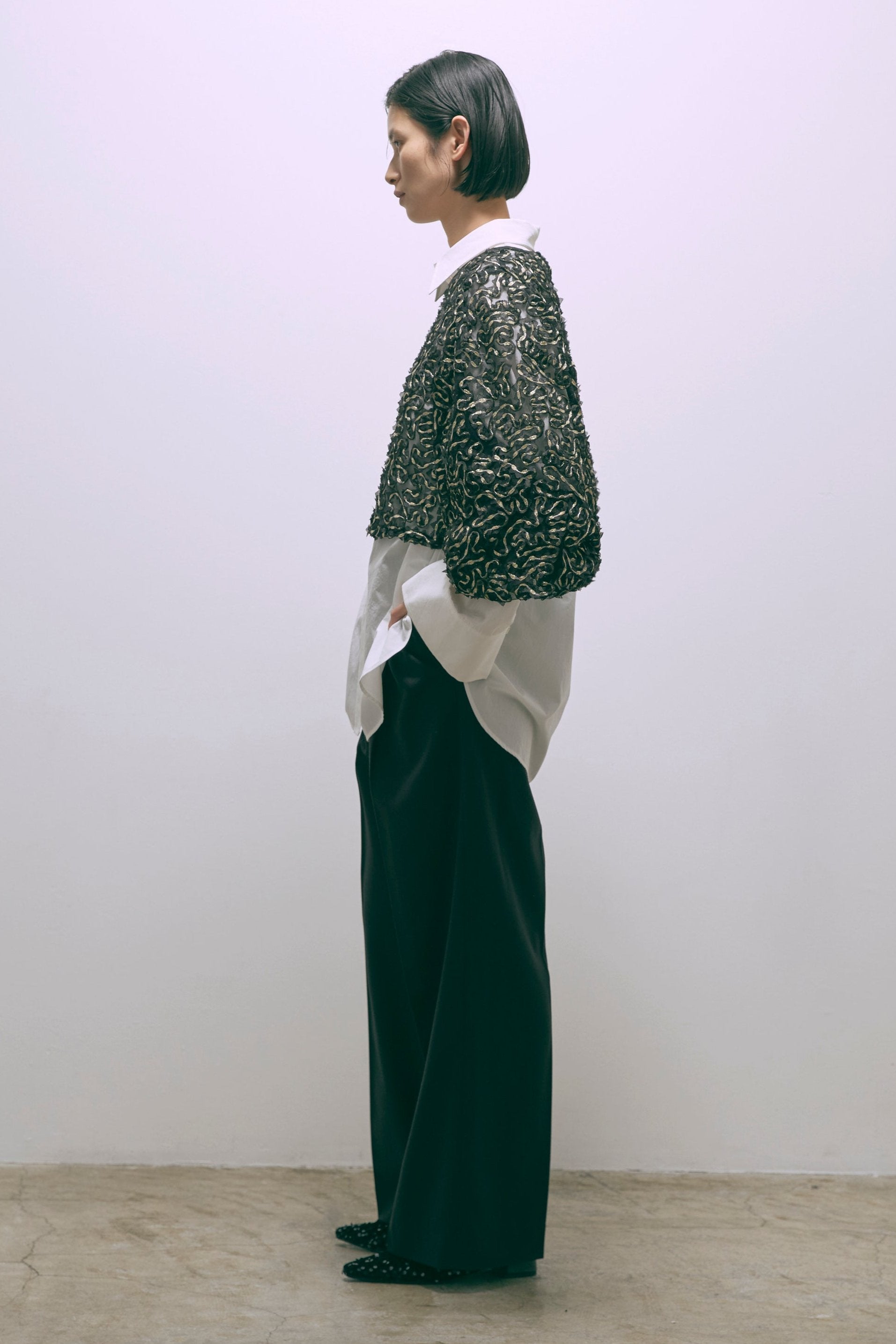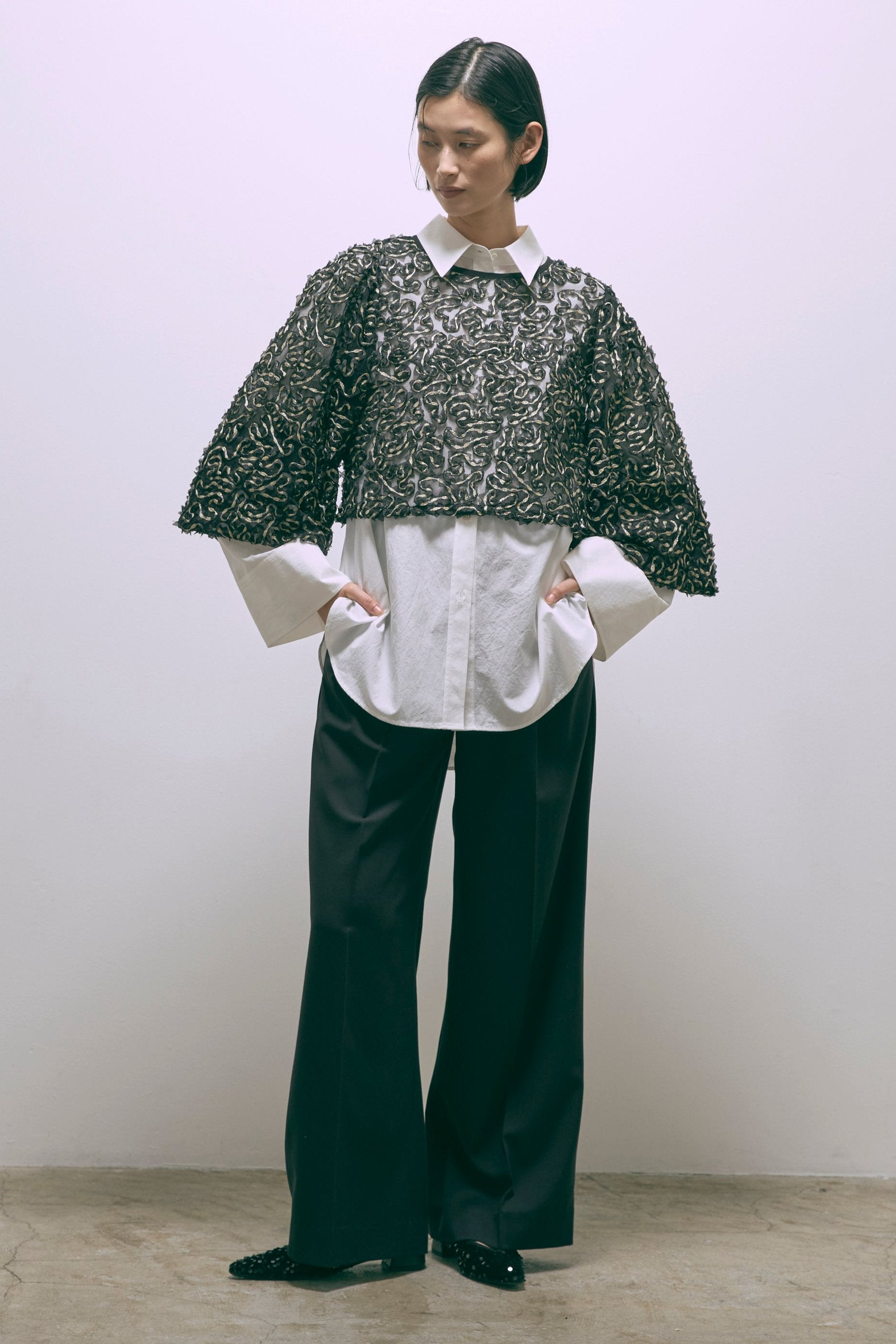 普段使いからオケージョンシーンまで幅広く活躍するマルチウェイアイテム マルチウェイチュールカラー 【Material】 着用時のボリューム感を考慮して、二種類のチュールを使用しました。フロントのリボンはサテン紐で上品に仕上げています。 ※素材の特性上、静電気でチュールが張り付くことがあります。着用前に静電気防止スプレーの使用をお勧めします。 【Design】 異なる目の荒さや硬さのチュールを重ね、立体的なフリルを実現しました。左右のカッティングが異なりながらも、バランスよく見えるようにこだわったデザインです。 【Styling point】 フロントをリボンで結んで付け衿として着用するほか、たすき掛けにして斜めに結んだり、結ばずに肩にゆるっと掛けたりできます。また、腰に巻いてスカートレイヤード風にもアレンジ可能です。結び目を中心から少し横にずらすと、バランスが取りやすくなります。